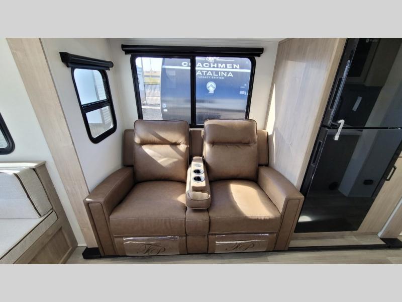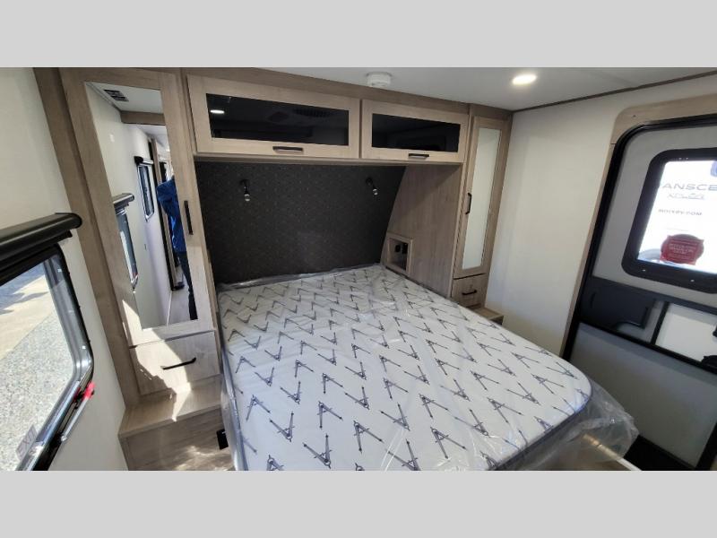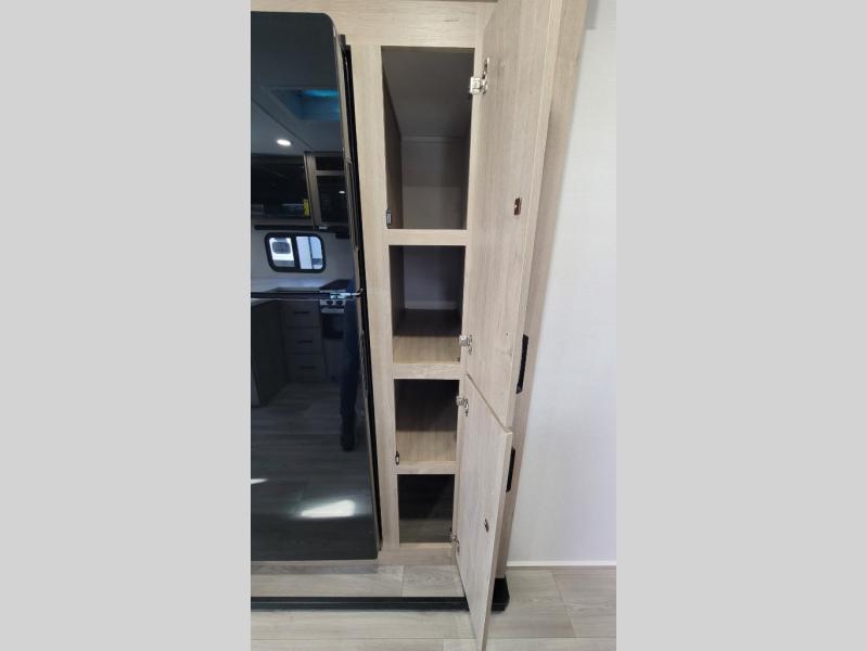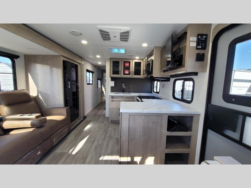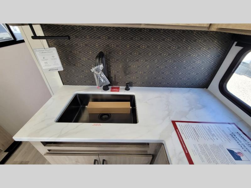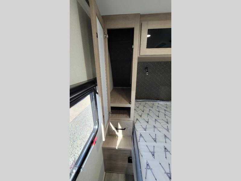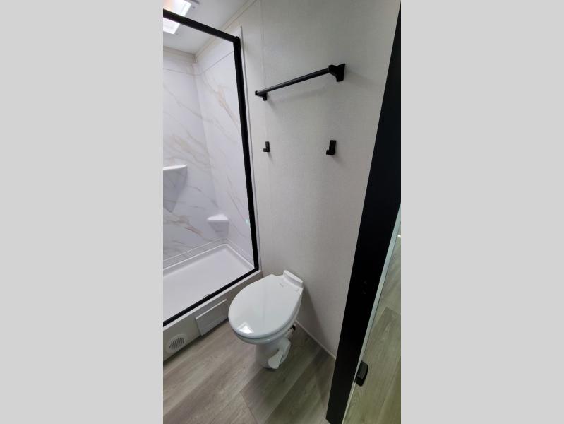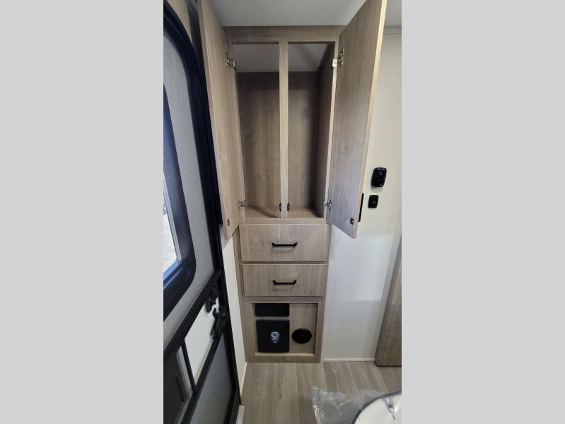 This 25RLE model travel trailer is designed for both comfort and convenience from front to back. At the front, the private bedroom features a spacious 60" x 80" queen bed with built-in wardrobe cubby storage and one of two entry doors for easy access. Moving down the hall, the full bathroom offers a residential-style walk-in shower with a skylight that adds both light and headroom, along with a mirrored medicine cabinet and linen shelves for towels and toiletries. The main living area opens up with a large slide out that houses 60" theater seating and a 10-cu. ft. refrigerator for all your fresh groceries, while a nearby pantry keeps your dry goods organized. Across from the slide, the U-shaped kitchen provides ample counter space, a three-burner range with oven, stainless steel sink, and microwave, everything you need to cook in comfort. At the rear, the booth dinette creates the perfect spot for meals or games and easily converts into an extra-sleeping area when needed.