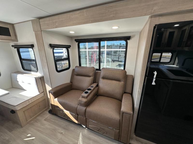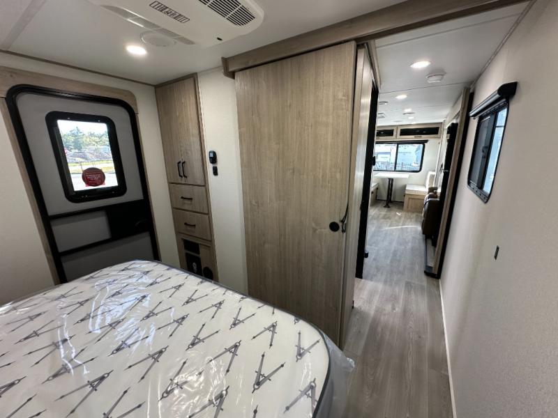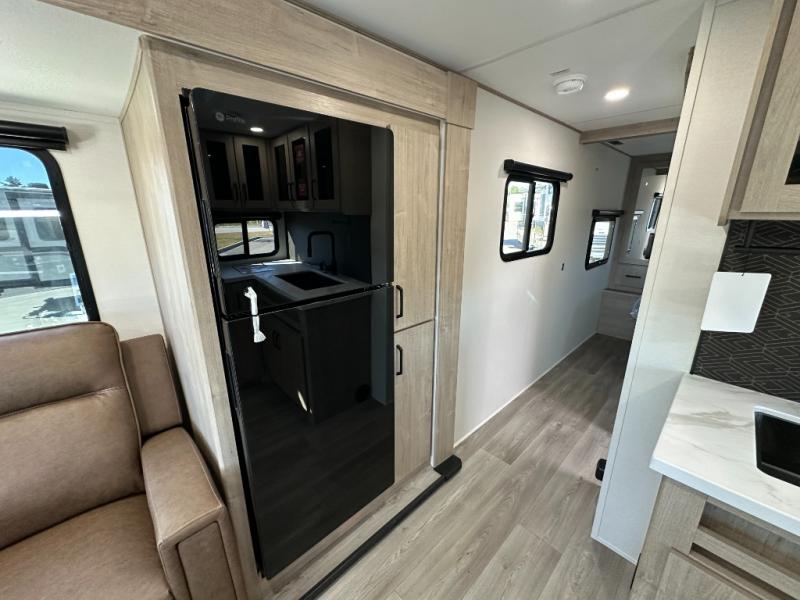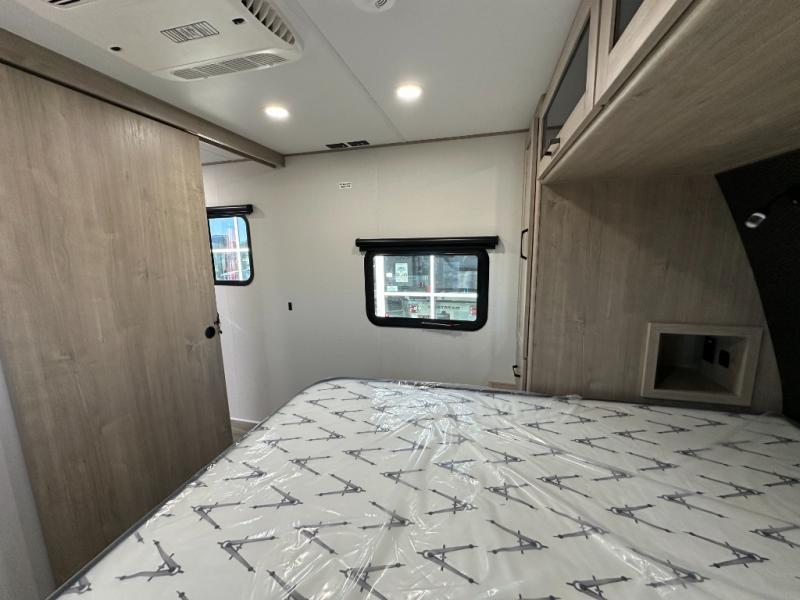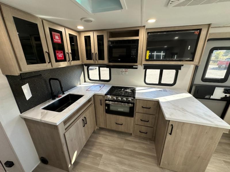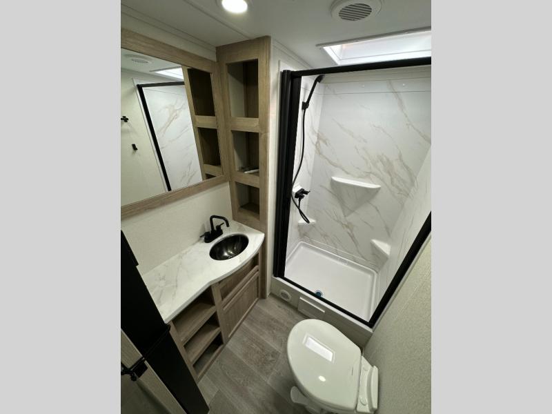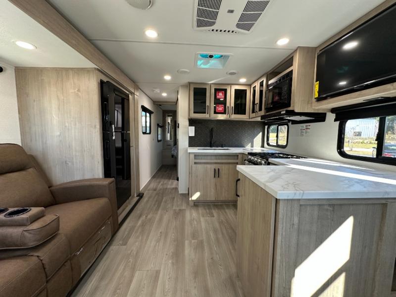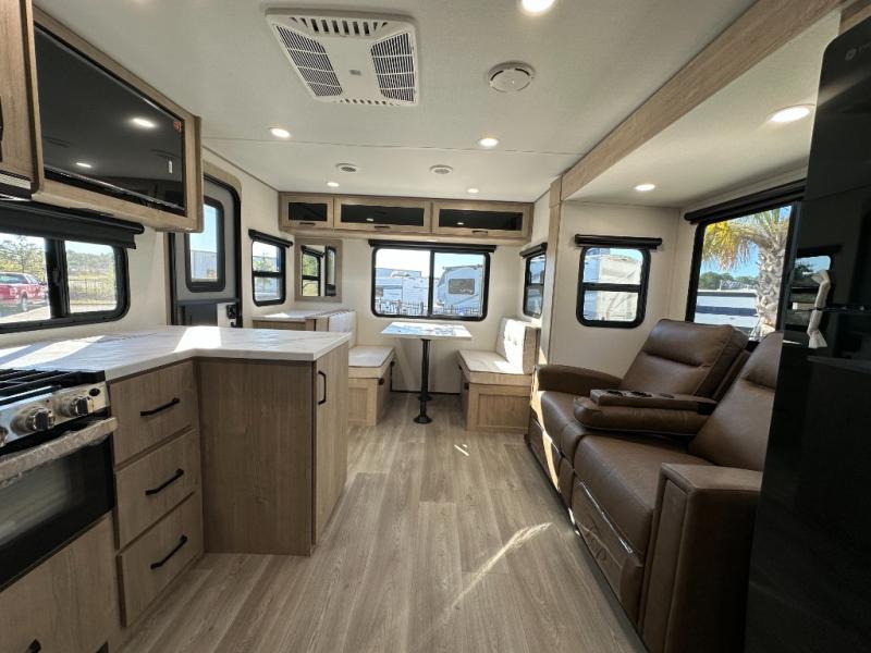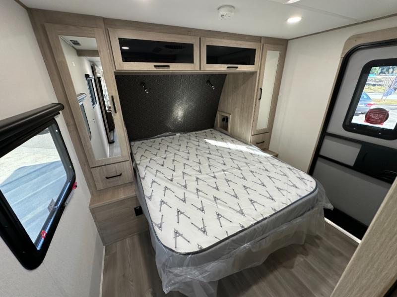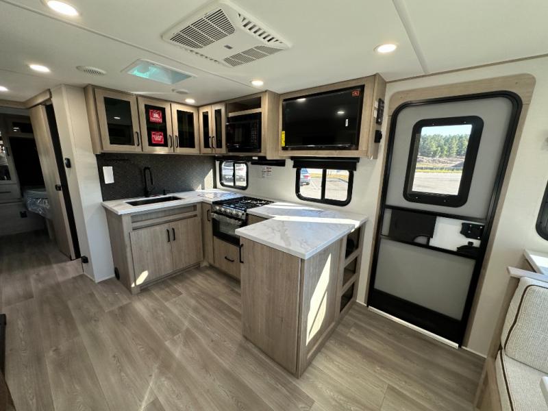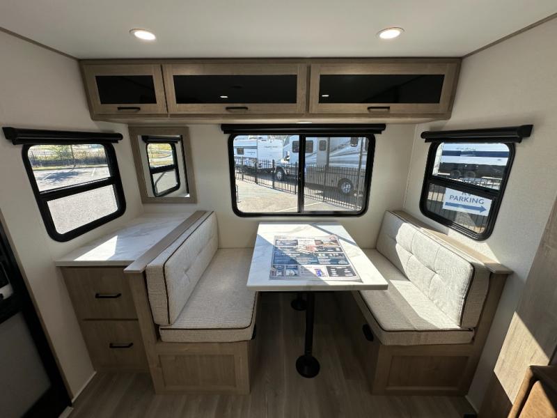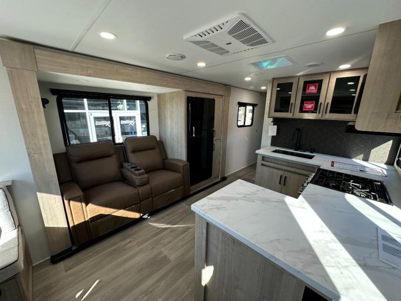This 25RLE model travel trailer is designed for both comfort and convenience from front to back. At the front, the private bedroom features a spacious 60" x 80" queen bed with built-in wardrobe cubby storage and one of two entry doors for easy access. Moving down the hall, the full bathroom offers a residential-style walk-in shower with a skylight that adds both light and headroom, along with a mirrored medicine cabinet and linen shelves for towels and toiletries. The main living area opens up with a large slide out that houses 60" theater seating and a 10-cu. ft. refrigerator for all your fresh groceries, while a nearby pantry keeps your dry goods organized. Across from the slide, the U-shaped kitchen provides ample counter space, a three-burner range with oven, stainless steel sink, and microwave, everything you need to cook in comfort. At the rear, the booth dinette creates the perfect spot for meals or games and easily converts into an extra-sleeping area when needed.