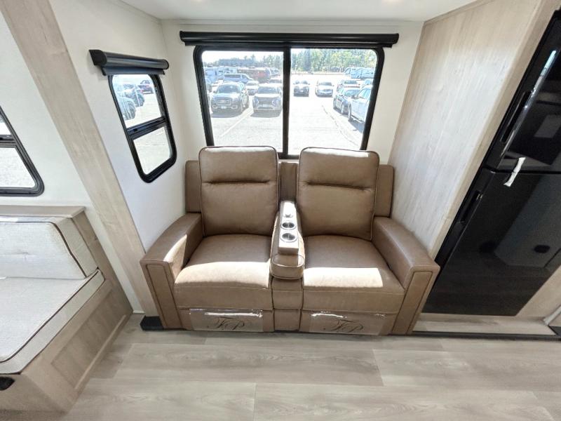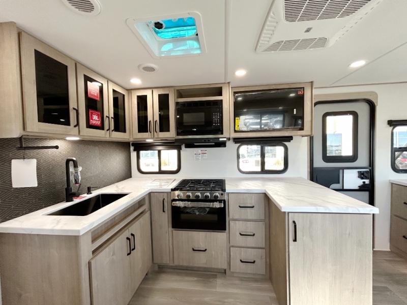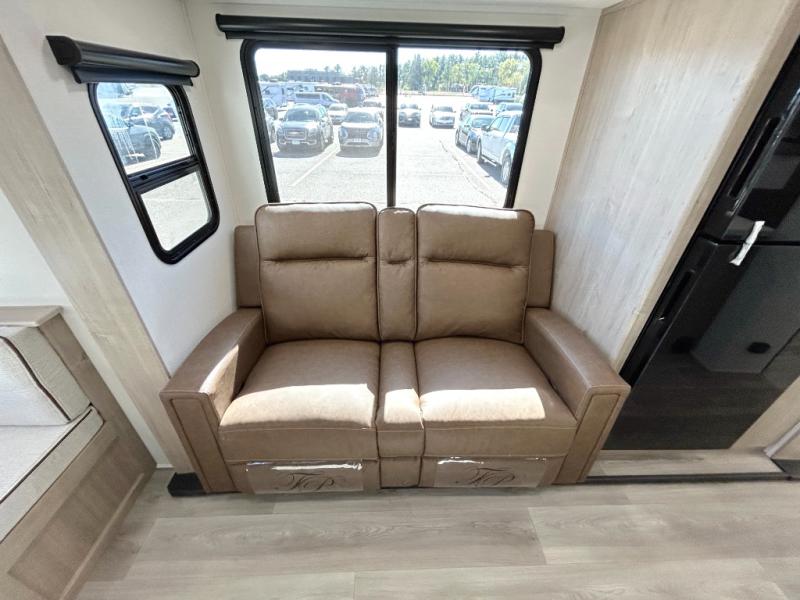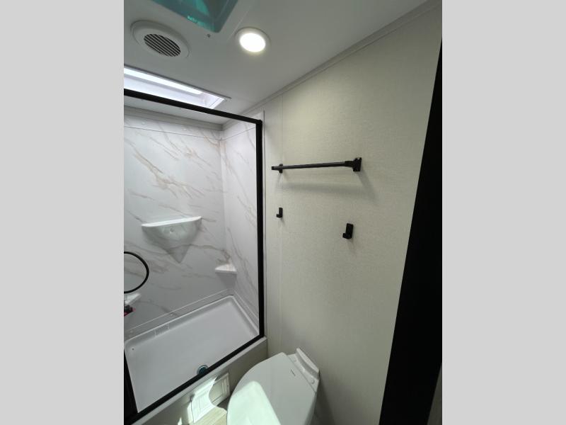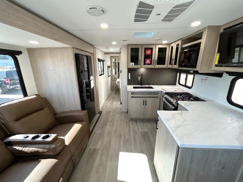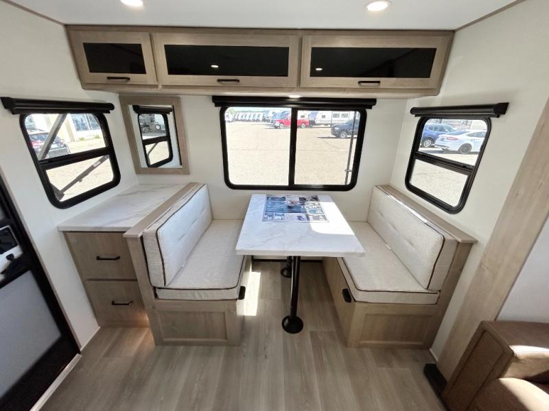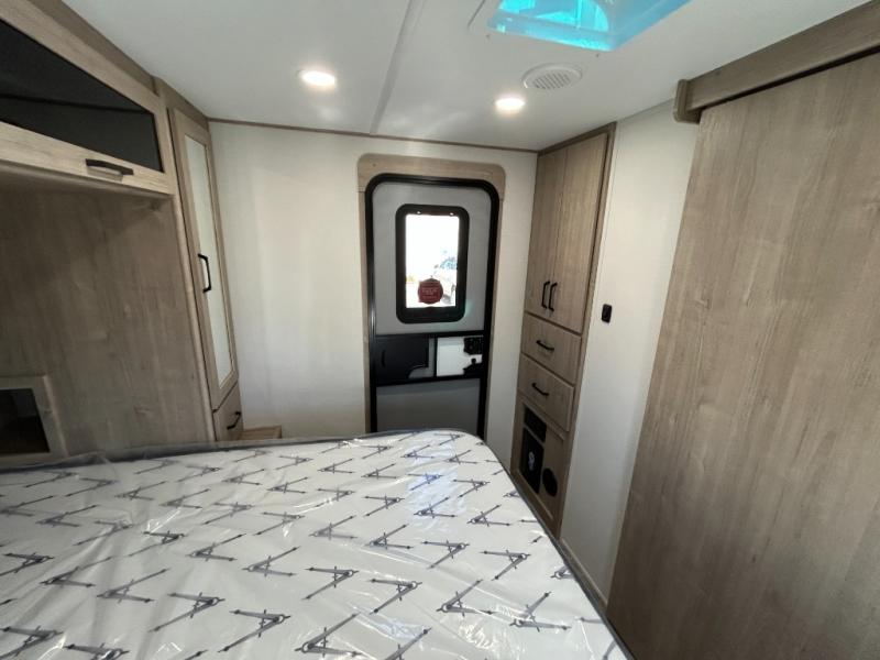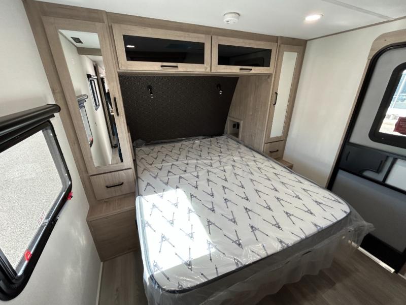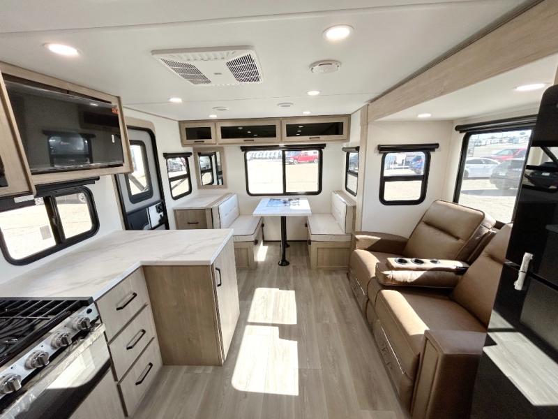 This 25RLE model travel trailer is designed for both comfort and convenience from front to back. At the front, the private bedroom features a spacious 60" x 80" queen bed with built-in wardrobe cubby storage and one of two entry doors for easy access. Moving down the hall, the full bathroom offers a residential-style walk-in shower with a skylight that adds both light and headroom, along with a mirrored medicine cabinet and linen shelves for towels and toiletries. The main living area opens up with a large slide out that houses 60" theater seating and a 10-cu. ft. refrigerator for all your fresh groceries, while a nearby pantry keeps your dry goods organized. Across from the slide, the U-shaped kitchen provides ample counter space, a three-burner range with oven, stainless steel sink, and microwave, everything you need to cook in comfort. At the rear, the booth dinette creates the perfect spot for meals or games and easily converts into an extra-sleeping area when needed.