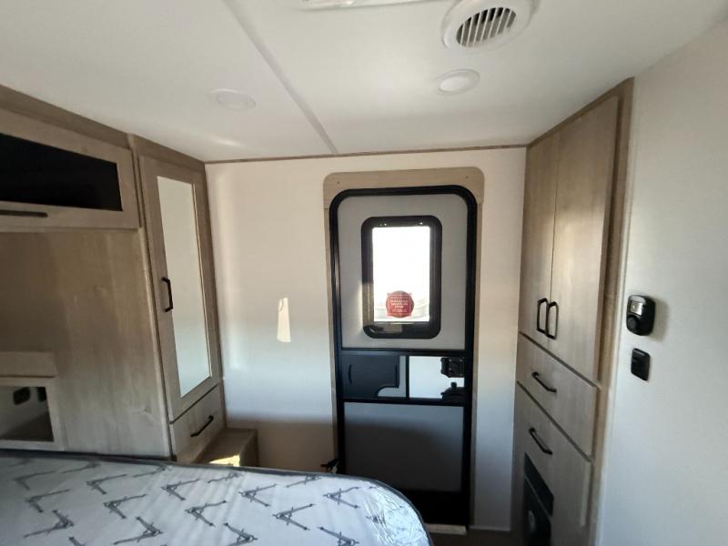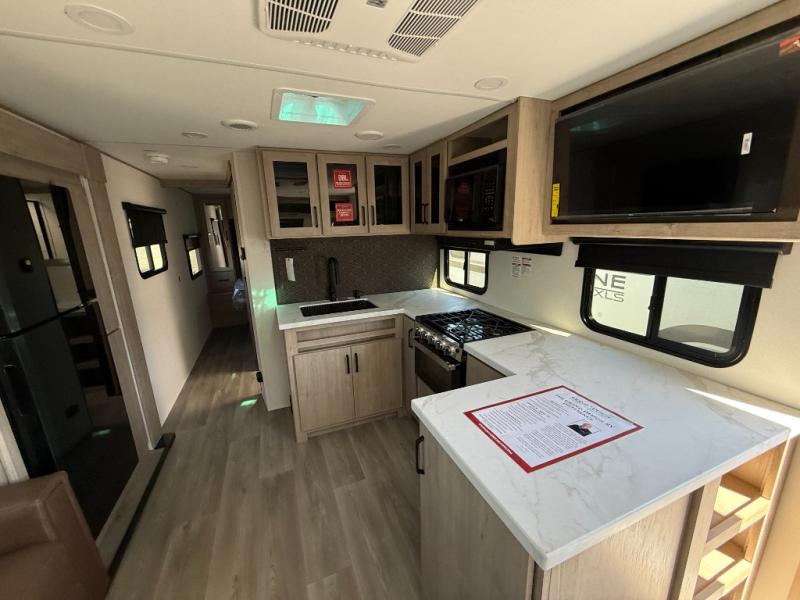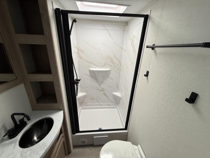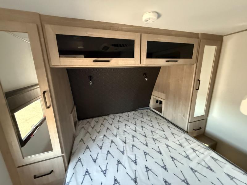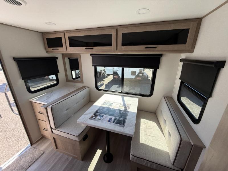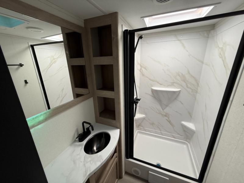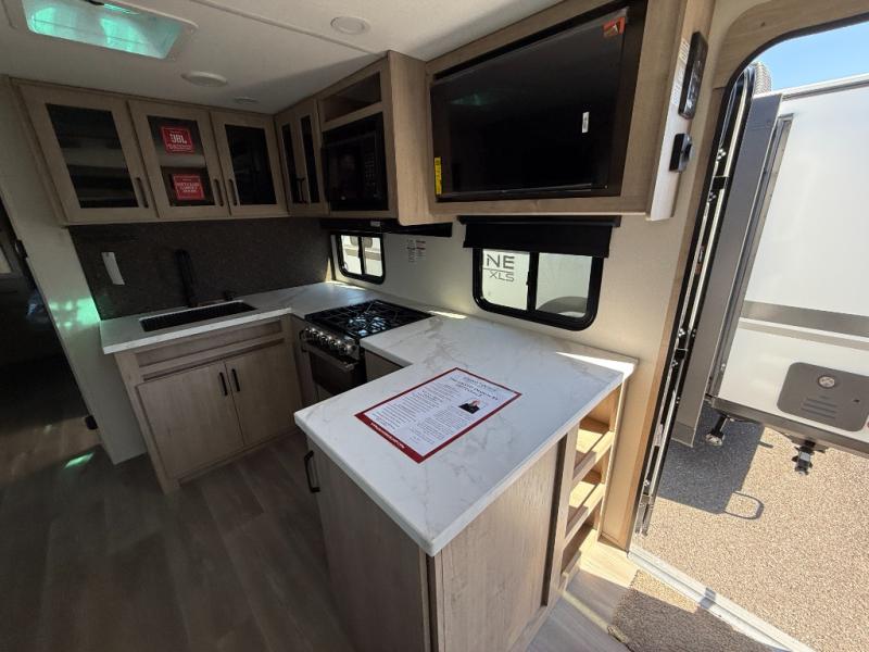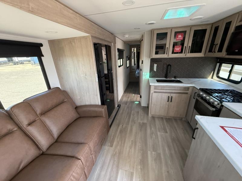 This 25RLE model travel trailer is designed for both comfort and convenience from front to back. At the front, the private bedroom features a spacious 60" x 80" queen bed with built-in wardrobe cubby storage and one of two entry doors for easy access. Moving down the hall, the full bathroom offers a residential-style walk-in shower with a skylight that adds both light and headroom, along with a mirrored medicine cabinet and linen shelves for towels and toiletries. The main living area opens up with a large slide out that houses 60" theater seating and a 10-cu. ft. refrigerator for all your fresh groceries, while a nearby pantry keeps your dry goods organized. Across from the slide, the U-shaped kitchen provides ample counter space, a three-burner range with oven, stainless steel sink, and microwave, everything you need to cook in comfort. At the rear, the booth dinette creates the perfect spot for meals or games and easily converts into an extra-sleeping area when needed.