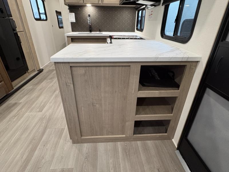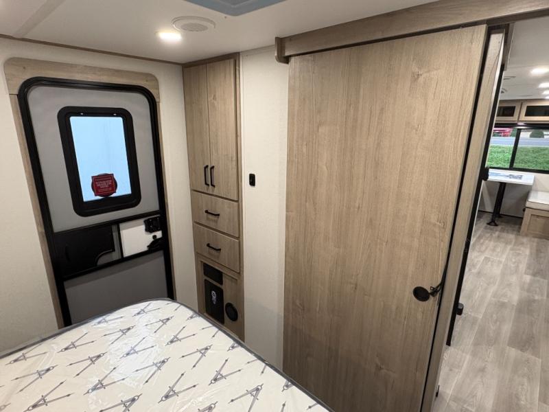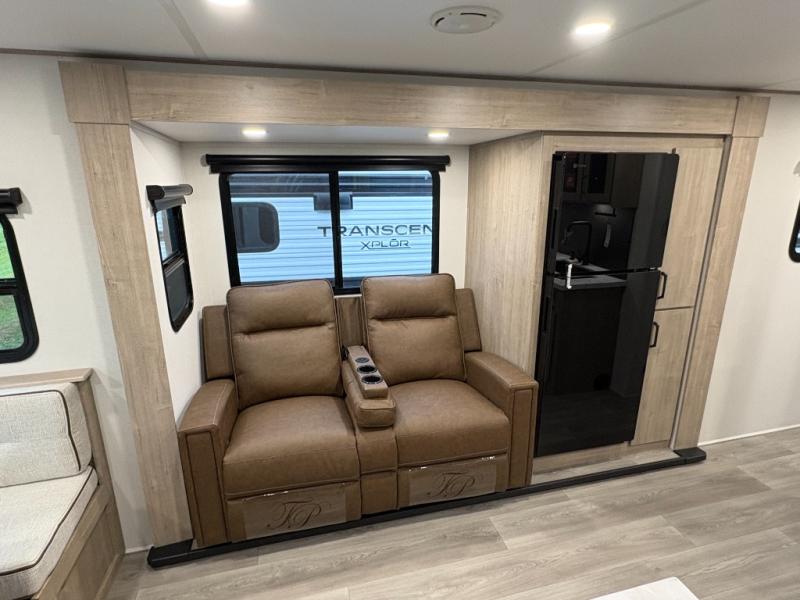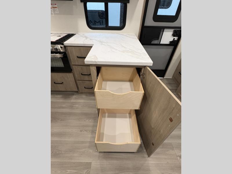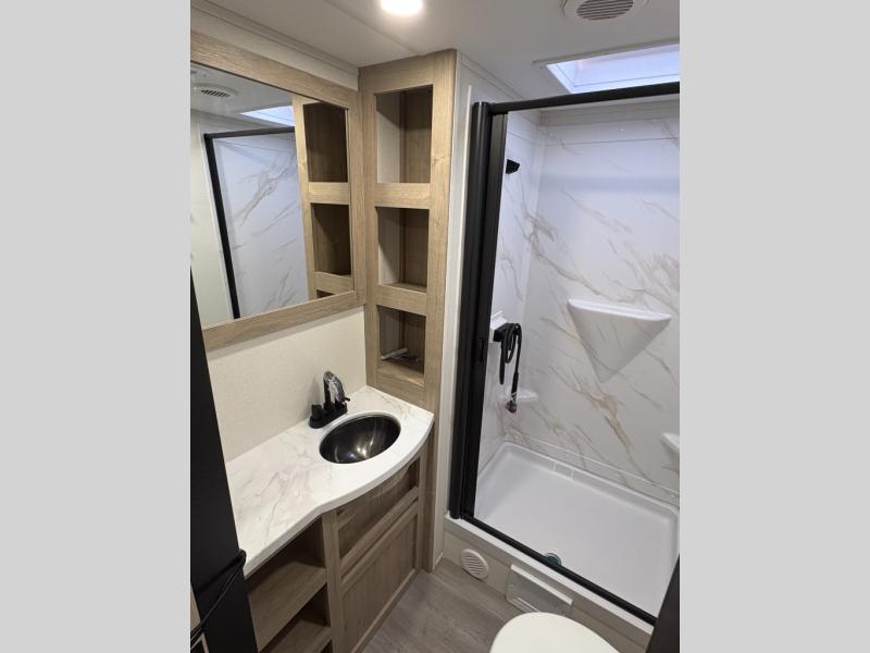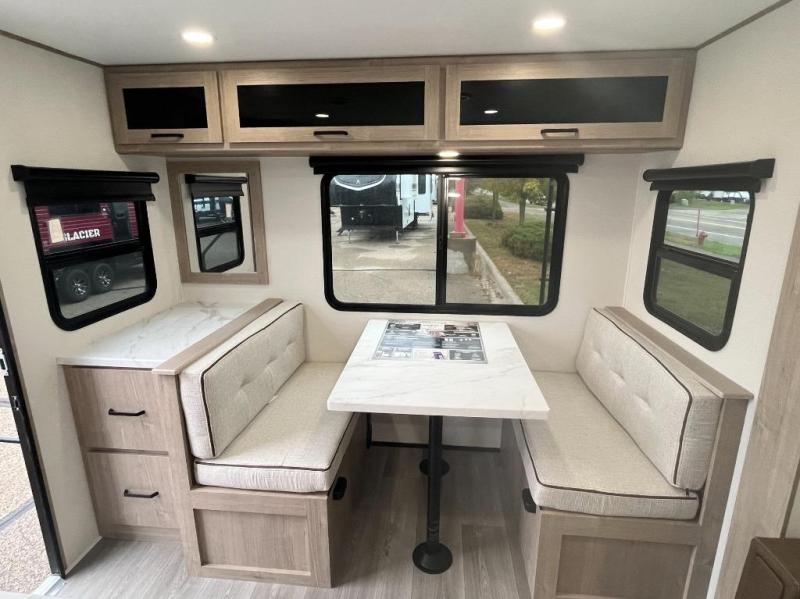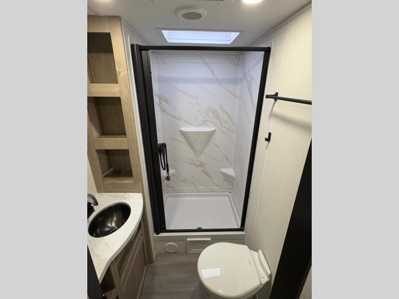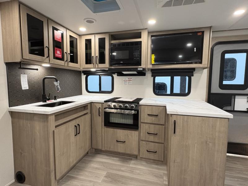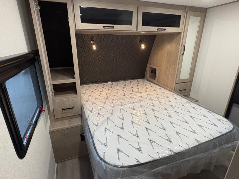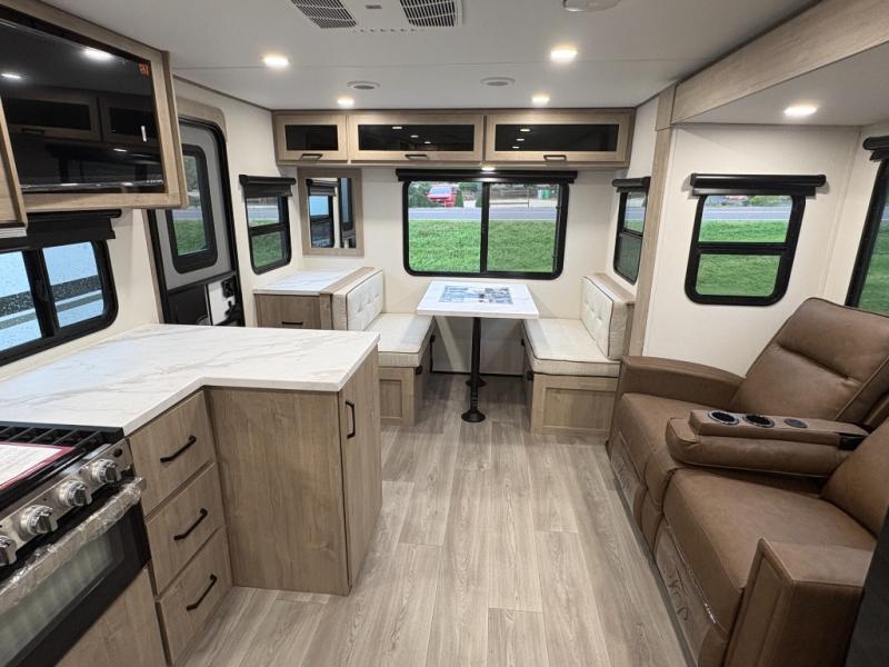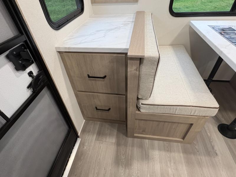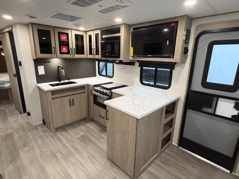This 25RLE model travel trailer is designed for both comfort and convenience from front to back. At the front, the private bedroom features a spacious 60" x 80" queen bed with built-in wardrobe cubby storage and one of two entry doors for easy access. Moving down the hall, the full bathroom offers a residential-style walk-in shower with a skylight that adds both light and headroom, along with a mirrored medicine cabinet and linen shelves for towels and toiletries. The main living area opens up with a large slide out that houses 60" theater seating and a 10-cu. ft. refrigerator for all your fresh groceries, while a nearby pantry keeps your dry goods organized. Across from the slide, the U-shaped kitchen provides ample counter space, a three-burner range with oven, stainless steel sink, and microwave, everything you need to cook in comfort. At the rear, the booth dinette creates the perfect spot for meals or games and easily converts into an extra-sleeping area when needed.