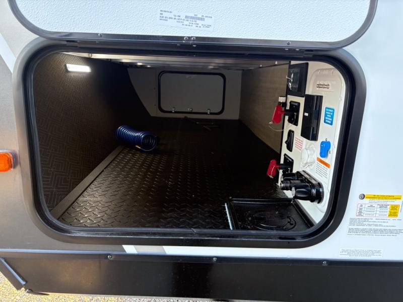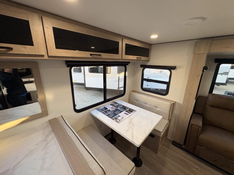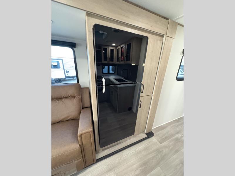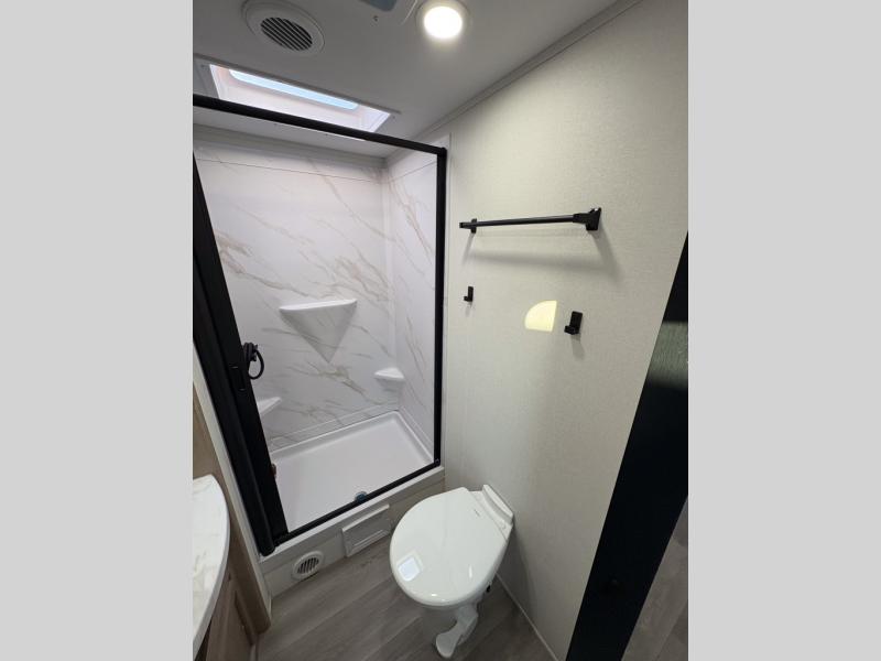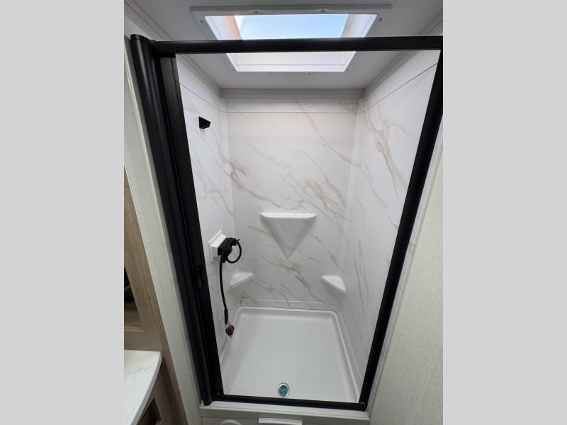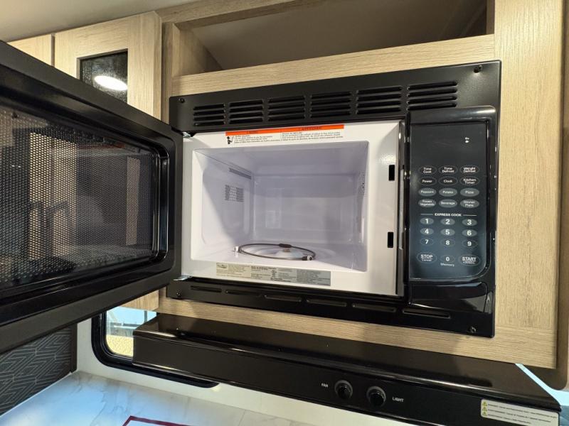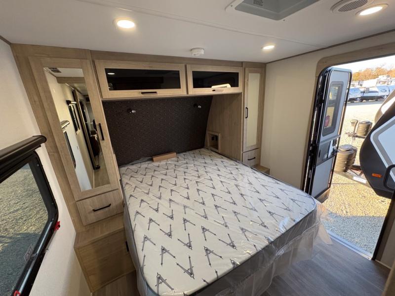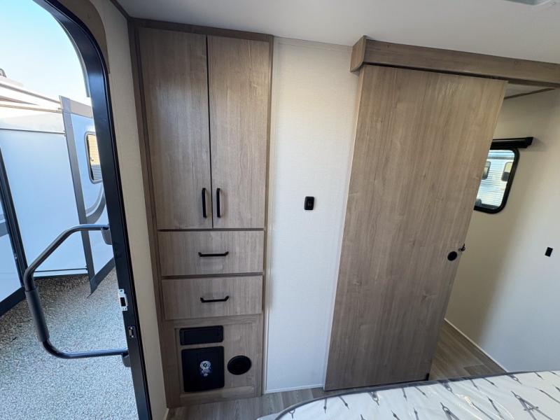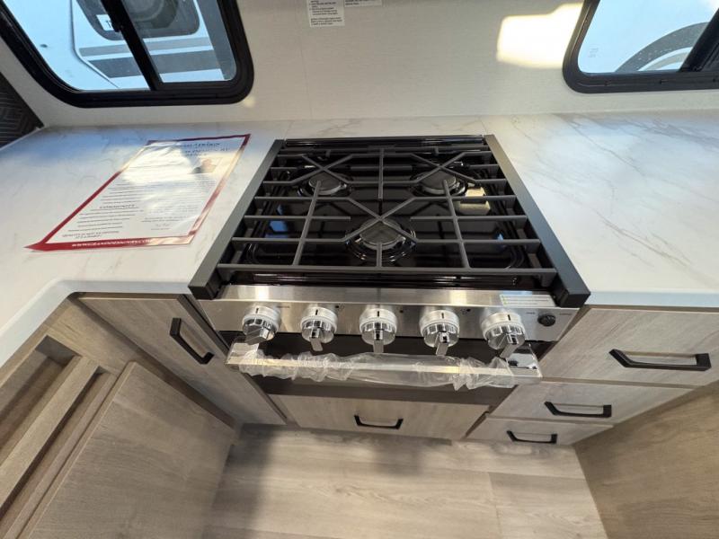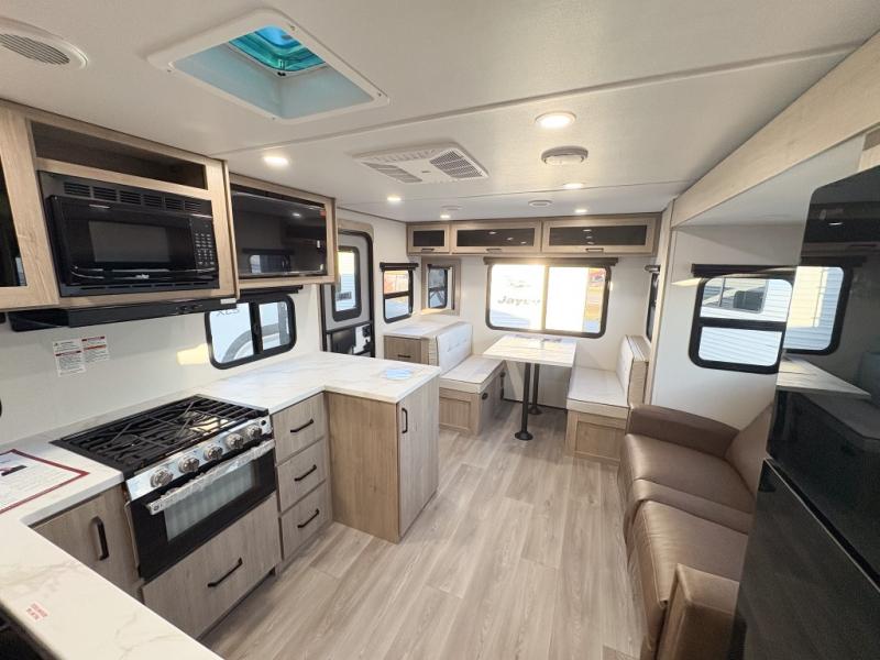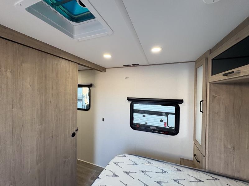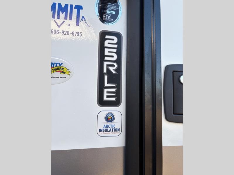This 25RLE model travel trailer is designed for both comfort and convenience from front to back. At the front, the private bedroom features a spacious 60" x 80" queen bed with built-in wardrobe cubby storage and one of two entry doors for easy access. Moving down the hall, the full bathroom offers a residential-style walk-in shower with a skylight that adds both light and headroom, along with a mirrored medicine cabinet and linen shelves for towels and toiletries. The main living area opens up with a large slide out that houses 60" theater seating and a 10-cu. ft. refrigerator for all your fresh groceries, while a nearby pantry keeps your dry goods organized. Across from the slide, the U-shaped kitchen provides ample counter space, a three-burner range with oven, stainless steel sink, and microwave, everything you need to cook in comfort. At the rear, the booth dinette creates the perfect spot for meals or games and easily converts into an extra-sleeping area when needed.