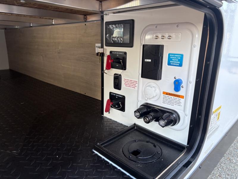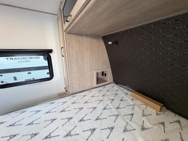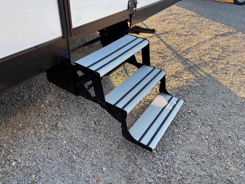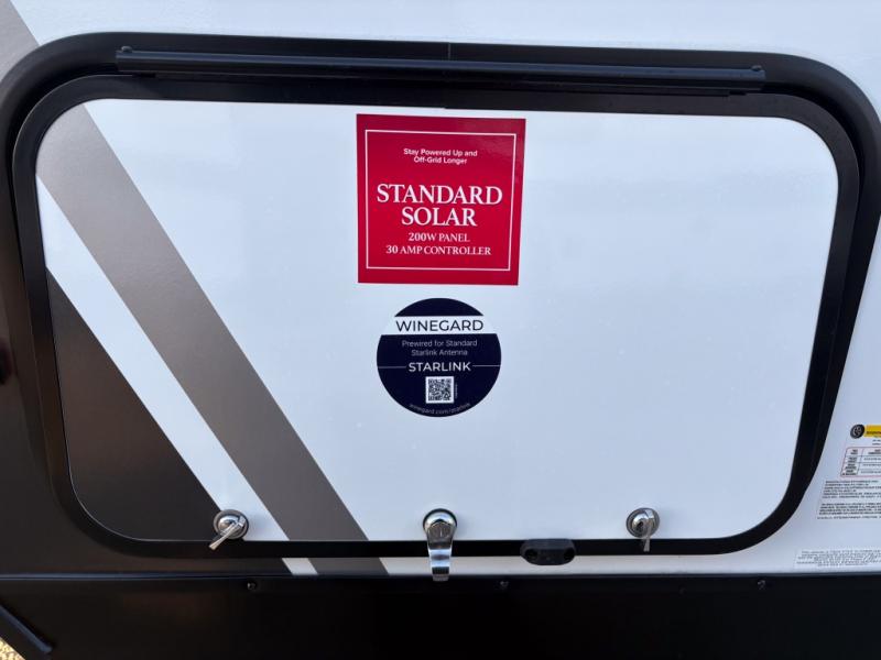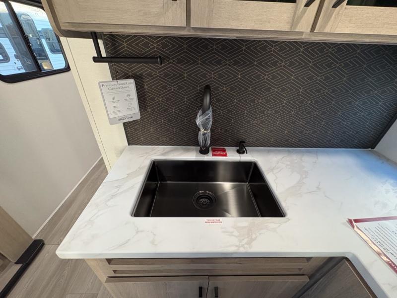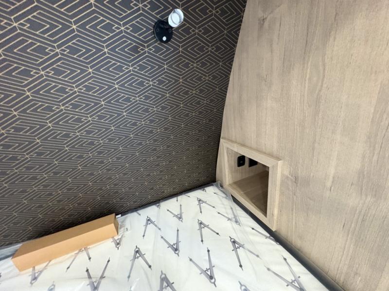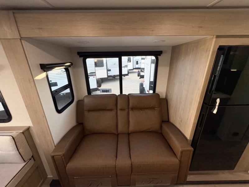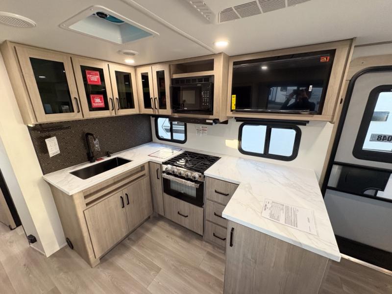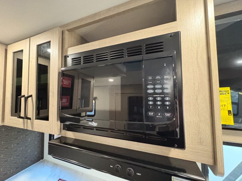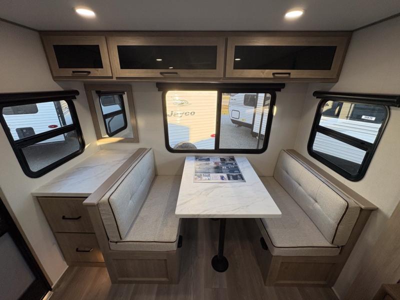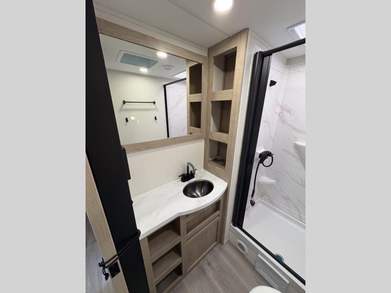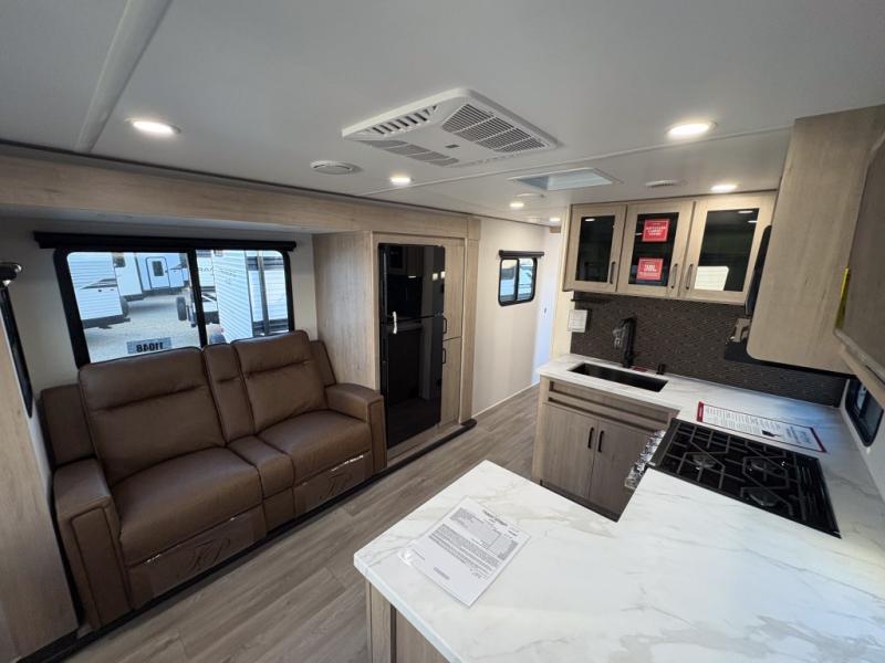 This 25RLE model travel trailer is designed for both comfort and convenience from front to back. At the front, the private bedroom features a spacious 60" x 80" queen bed with built-in wardrobe cubby storage and one of two entry doors for easy access. Moving down the hall, the full bathroom offers a residential-style walk-in shower with a skylight that adds both light and headroom, along with a mirrored medicine cabinet and linen shelves for towels and toiletries. The main living area opens up with a large slide out that houses 60" theater seating and a 10-cu. ft. refrigerator for all your fresh groceries, while a nearby pantry keeps your dry goods organized. Across from the slide, the U-shaped kitchen provides ample counter space, a three-burner range with oven, stainless steel sink, and microwave, everything you need to cook in comfort. At the rear, the booth dinette creates the perfect spot for meals or games and easily converts into an extra-sleeping area when needed.