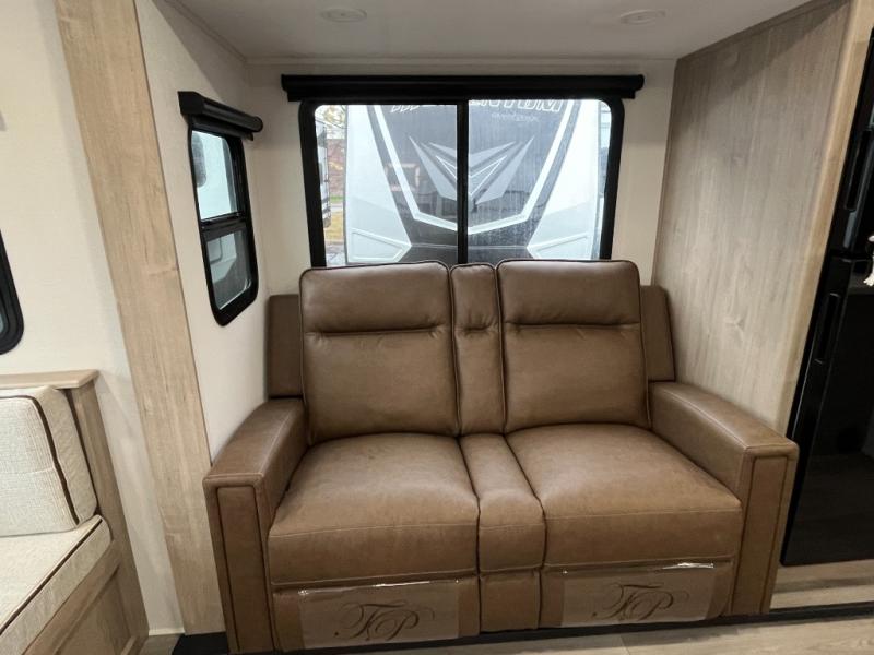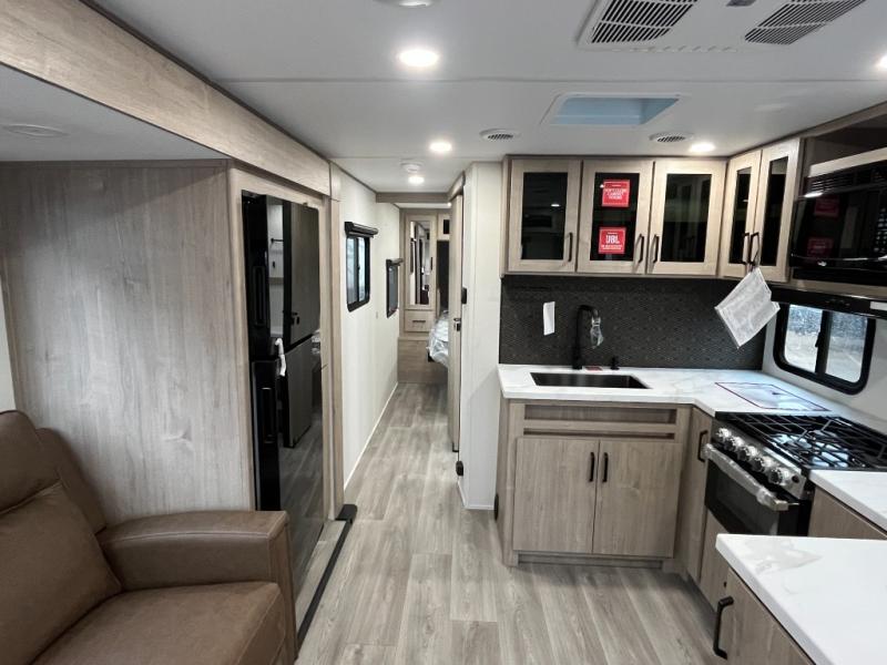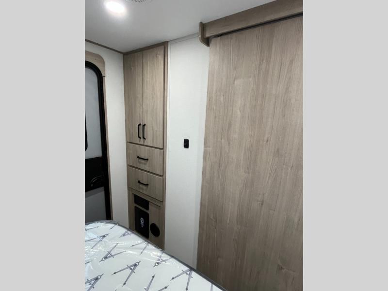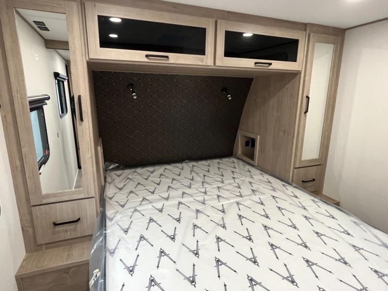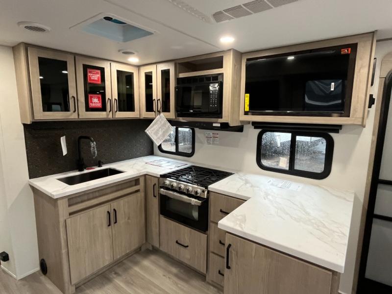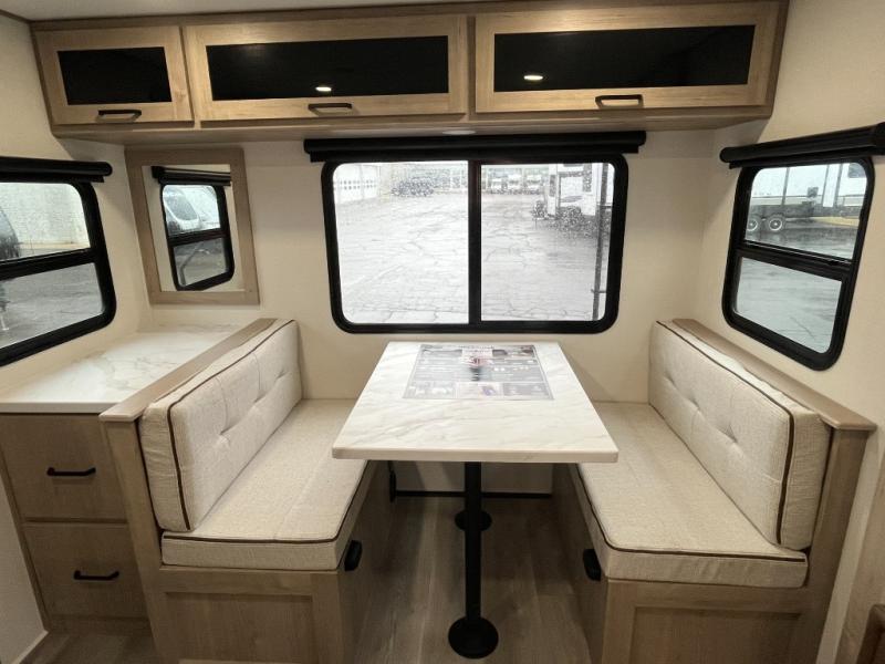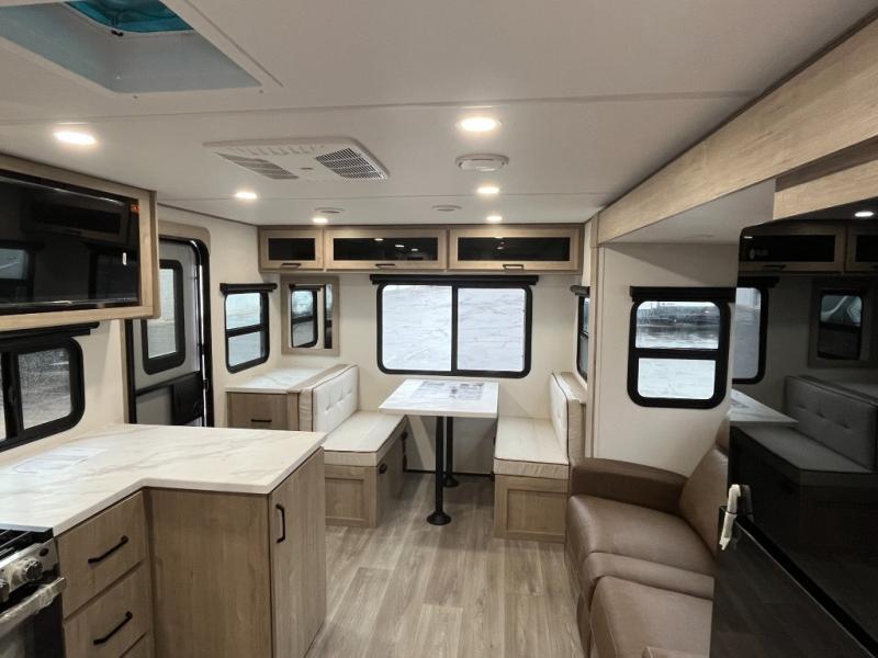 This 25RLE model travel trailer is designed for both comfort and convenience from front to back. At the front, the private bedroom features a spacious 60" x 80" queen bed with built-in wardrobe cubby storage and one of two entry doors for easy access. Moving down the hall, the full bathroom offers a residential-style walk-in shower with a skylight that adds both light and headroom, along with a mirrored medicine cabinet and linen shelves for towels and toiletries. The main living area opens up with a large slide out that houses 60" theater seating and a 10-cu. ft. refrigerator for all your fresh groceries, while a nearby pantry keeps your dry goods organized. Across from the slide, the U-shaped kitchen provides ample counter space, a three-burner range with oven, stainless steel sink, and microwave, everything you need to cook in comfort. At the rear, the booth dinette creates the perfect spot for meals or games and easily converts into an extra-sleeping area when needed.