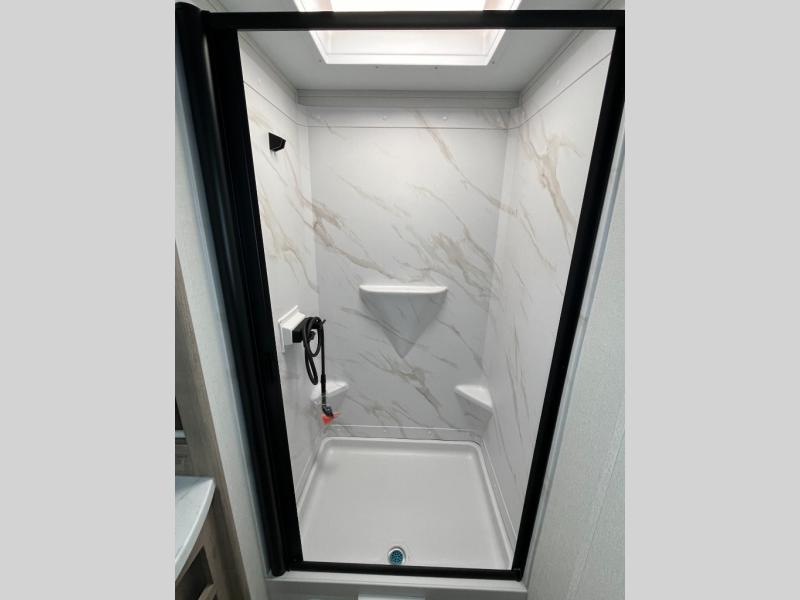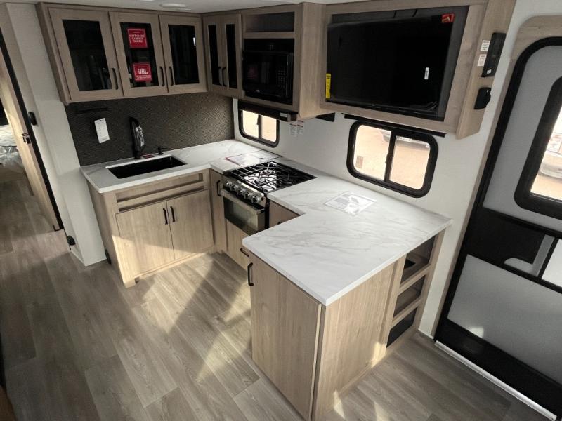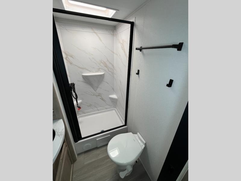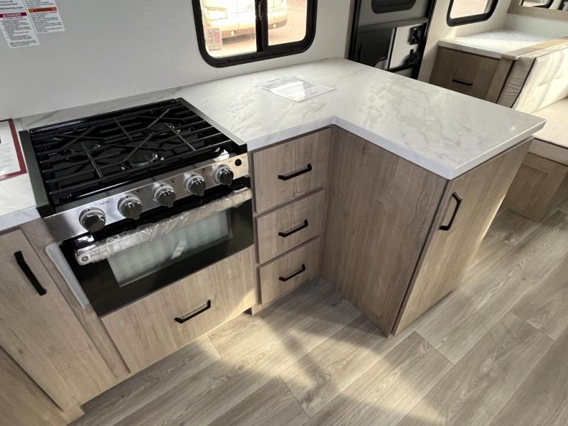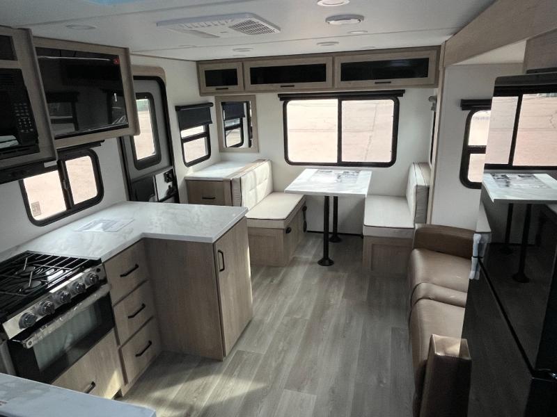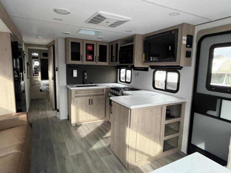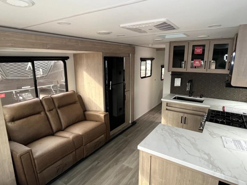 This 25RLE model travel trailer is designed for both comfort and convenience from front to back. At the front, the private bedroom features a spacious 60" x 80" queen bed with built-in wardrobe cubby storage and one of two entry doors for easy access. Moving down the hall, the full bathroom offers a residential-style walk-in shower with a skylight that adds both light and headroom, along with a mirrored medicine cabinet and linen shelves for towels and toiletries. The main living area opens up with a large slide out that houses 60" theater seating and a 10-cu. ft. refrigerator for all your fresh groceries, while a nearby pantry keeps your dry goods organized. Across from the slide, the U-shaped kitchen provides ample counter space, a three-burner range with oven, stainless steel sink, and microwave, everything you need to cook in comfort. At the rear, the booth dinette creates the perfect spot for meals or games and easily converts into an extra-sleeping area when needed.