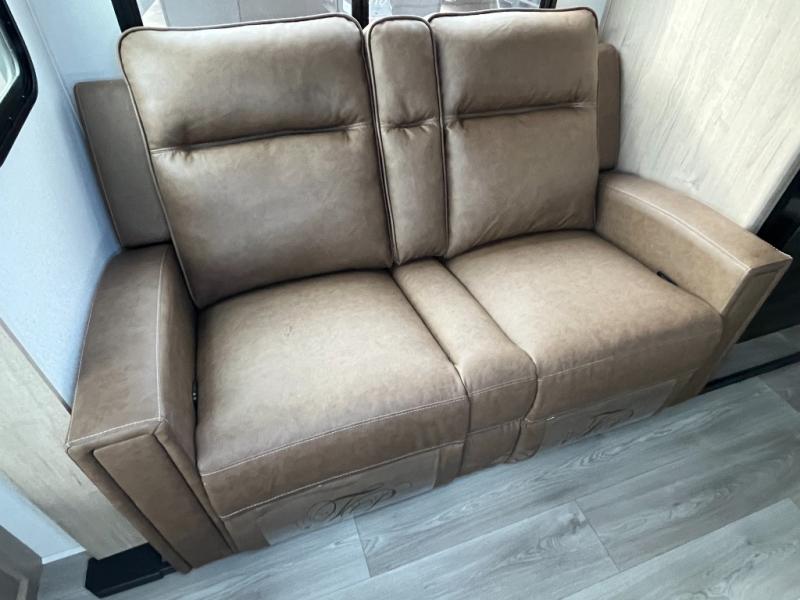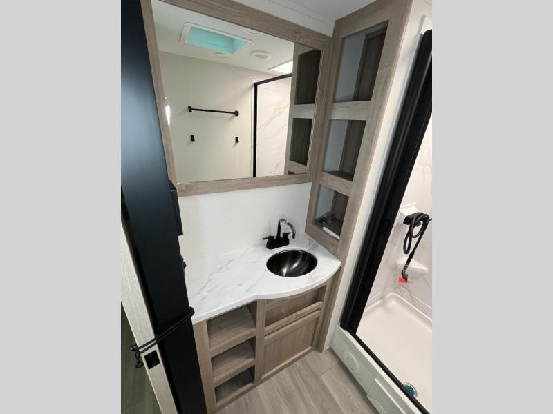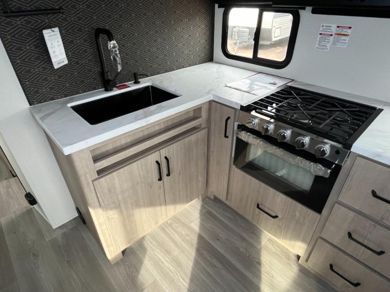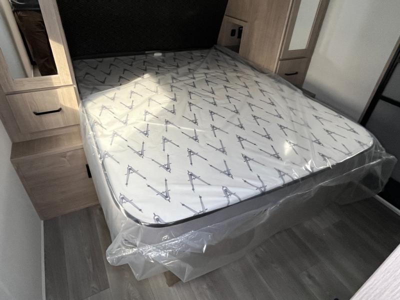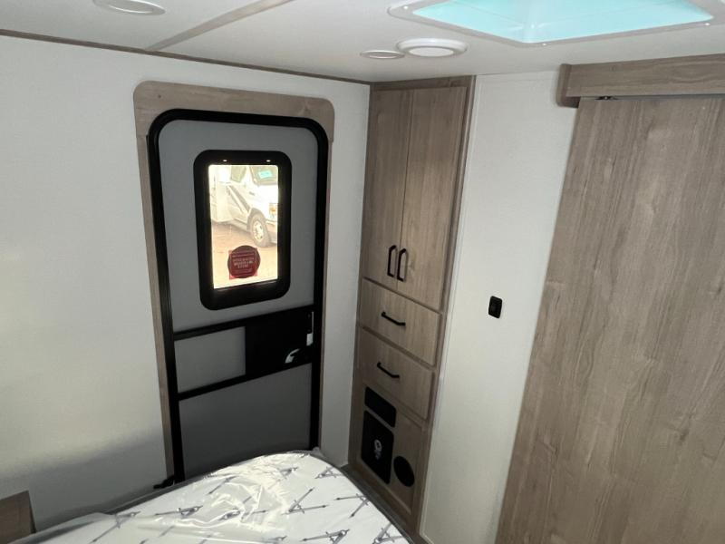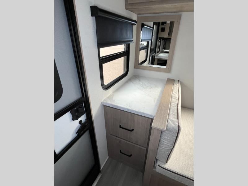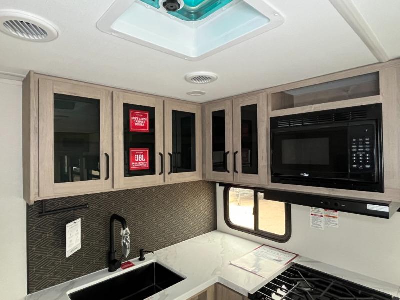 This 25RLE model travel trailer is designed for both comfort and convenience from front to back. At the front, the private bedroom features a spacious 60" x 80" queen bed with built-in wardrobe cubby storage and one of two entry doors for easy access. Moving down the hall, the full bathroom offers a residential-style walk-in shower with a skylight that adds both light and headroom, along with a mirrored medicine cabinet and linen shelves for towels and toiletries. The main living area opens up with a large slide out that houses 60" theater seating and a 10-cu. ft. refrigerator for all your fresh groceries, while a nearby pantry keeps your dry goods organized. Across from the slide, the U-shaped kitchen provides ample counter space, a three-burner range with oven, stainless steel sink, and microwave, everything you need to cook in comfort. At the rear, the booth dinette creates the perfect spot for meals or games and easily converts into an extra-sleeping area when needed.