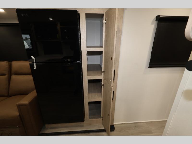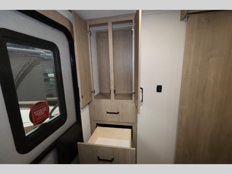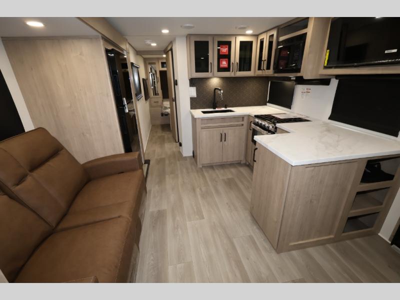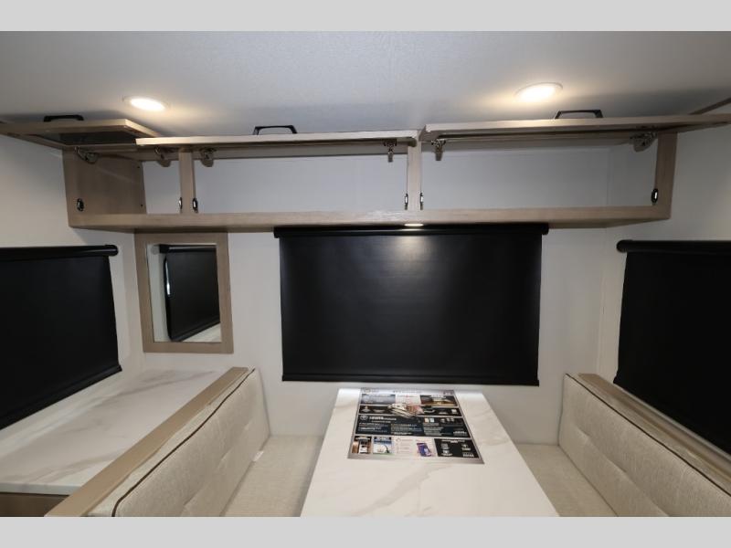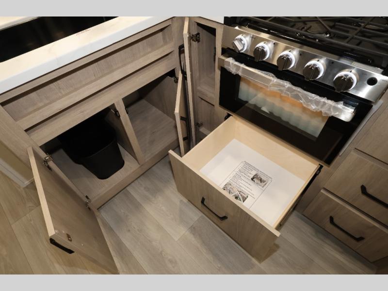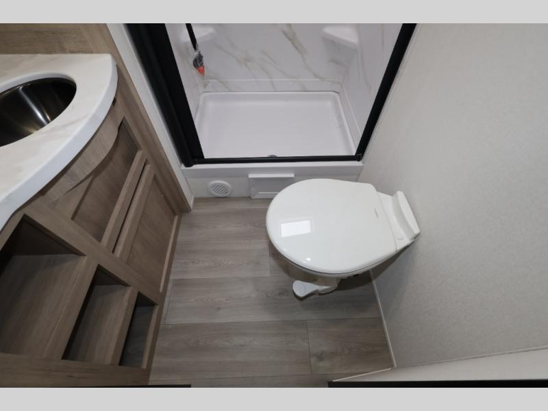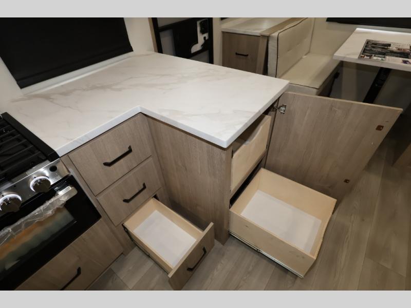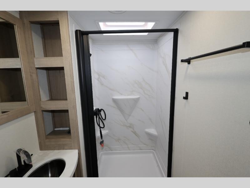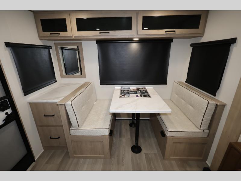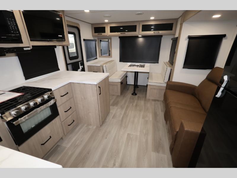 This 25RLE model travel trailer is designed for both comfort and convenience from front to back. At the front, the private bedroom features a spacious 60" x 80" queen bed with built-in wardrobe cubby storage and one of two entry doors for easy access. Moving down the hall, the full bathroom offers a residential-style walk-in shower with a skylight that adds both light and headroom, along with a mirrored medicine cabinet and linen shelves for towels and toiletries. The main living area opens up with a large slide out that houses 60" theater seating and a 10-cu. ft. refrigerator for all your fresh groceries, while a nearby pantry keeps your dry goods organized. Across from the slide, the U-shaped kitchen provides ample counter space, a three-burner range with oven, stainless steel sink, and microwave, everything you need to cook in comfort. At the rear, the booth dinette creates the perfect spot for meals or games and easily converts into an extra-sleeping area when needed.
