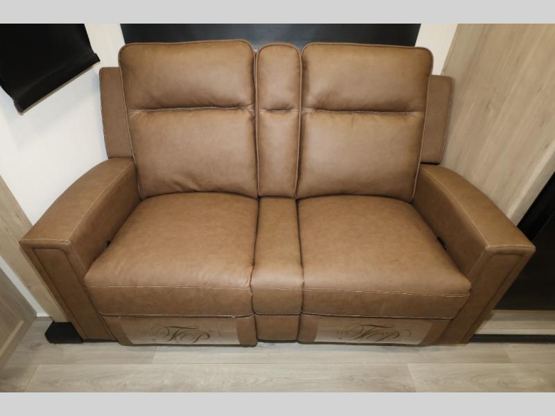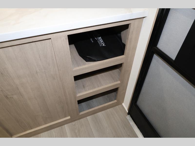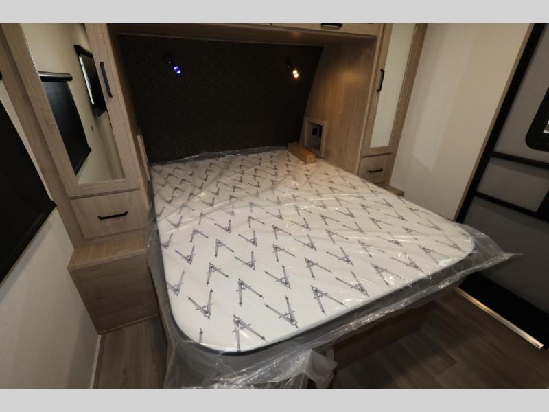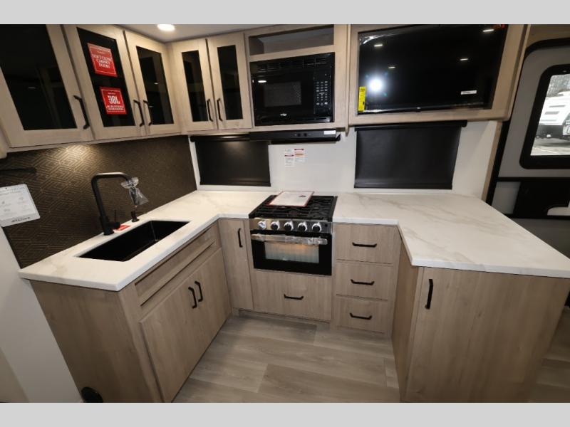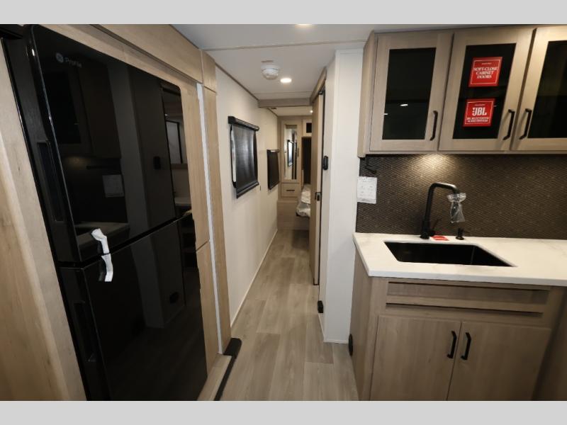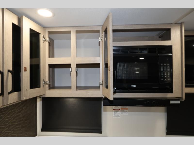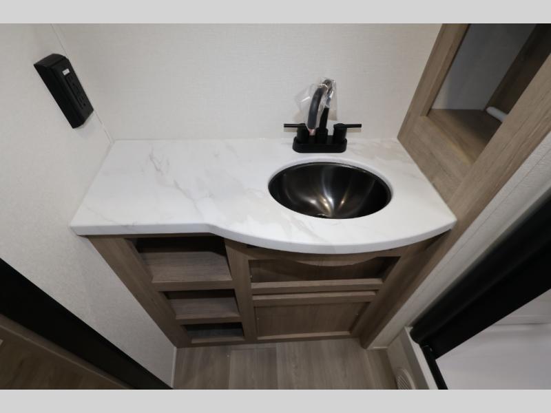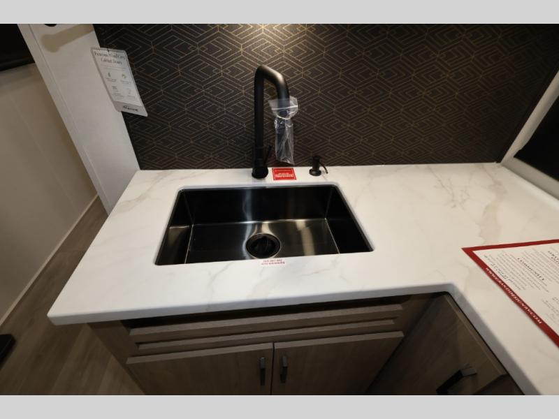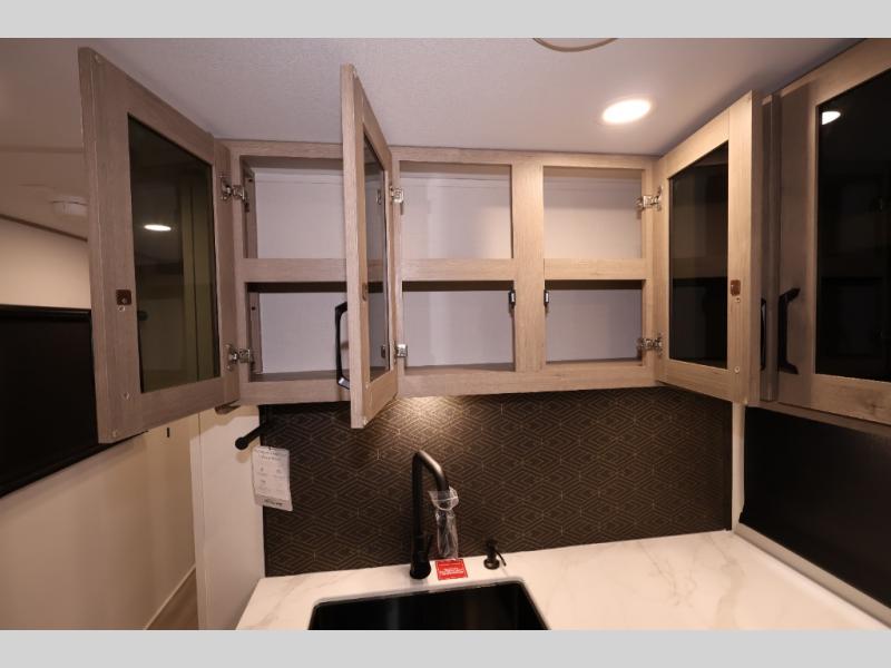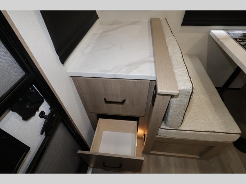 This 25RLE model travel trailer is designed for both comfort and convenience from front to back. At the front, the private bedroom features a spacious 60" x 80" queen bed with built-in wardrobe cubby storage and one of two entry doors for easy access. Moving down the hall, the full bathroom offers a residential-style walk-in shower with a skylight that adds both light and headroom, along with a mirrored medicine cabinet and linen shelves for towels and toiletries. The main living area opens up with a large slide out that houses 60" theater seating and a 10-cu. ft. refrigerator for all your fresh groceries, while a nearby pantry keeps your dry goods organized. Across from the slide, the U-shaped kitchen provides ample counter space, a three-burner range with oven, stainless steel sink, and microwave, everything you need to cook in comfort. At the rear, the booth dinette creates the perfect spot for meals or games and easily converts into an extra-sleeping area when needed.