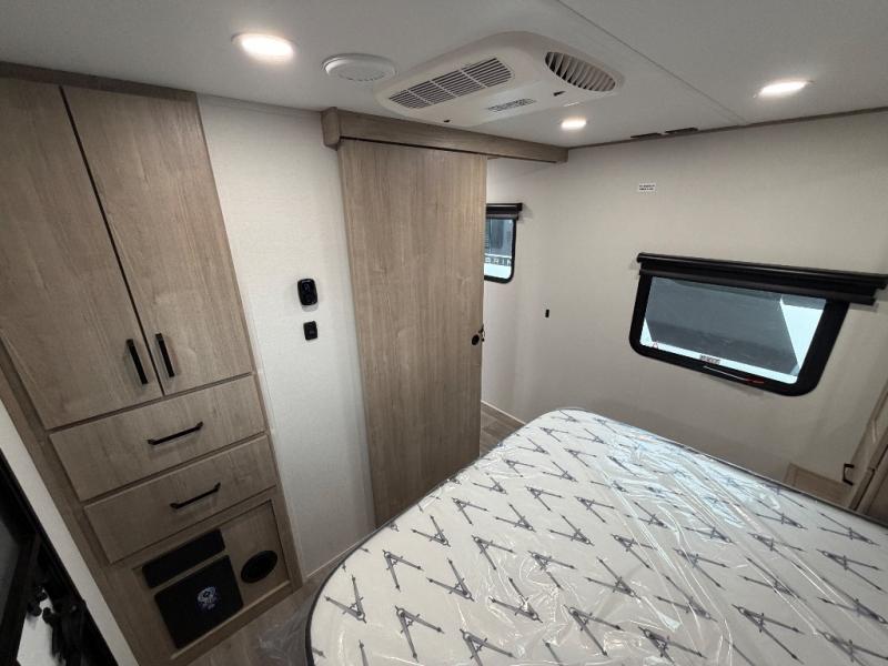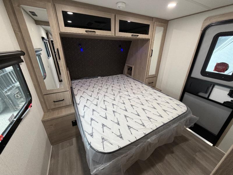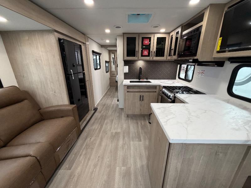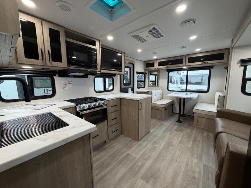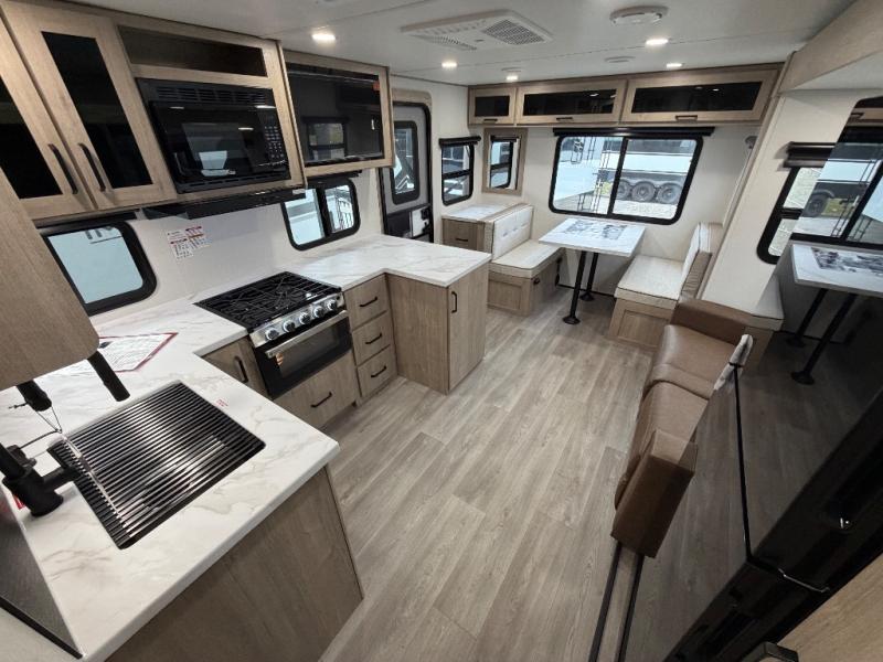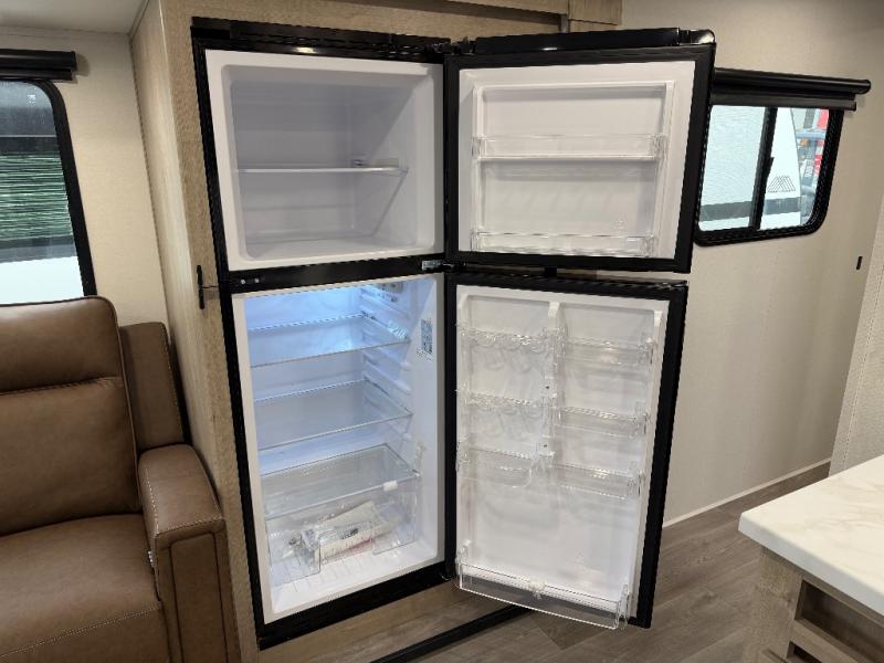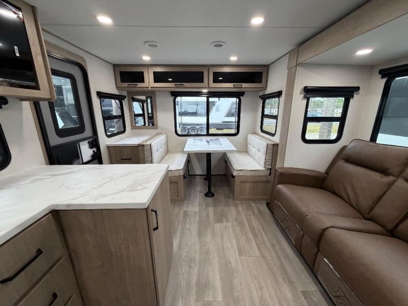 This 25RLE model travel trailer is designed for both comfort and convenience from front to back. At the front, the private bedroom features a spacious 60" x 80" queen bed with built-in wardrobe cubby storage and one of two entry doors for easy access. Moving down the hall, the full bathroom offers a residential-style walk-in shower with a skylight that adds both light and headroom, along with a mirrored medicine cabinet and linen shelves for towels and toiletries. The main living area opens up with a large slide out that houses 60" theater seating and a 10-cu. ft. refrigerator for all your fresh groceries, while a nearby pantry keeps your dry goods organized. Across from the slide, the U-shaped kitchen provides ample counter space, a three-burner range with oven, stainless steel sink, and microwave, everything you need to cook in comfort. At the rear, the booth dinette creates the perfect spot for meals or games and easily converts into an extra-sleeping area when needed.