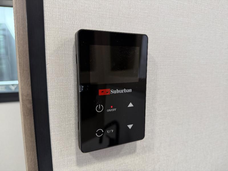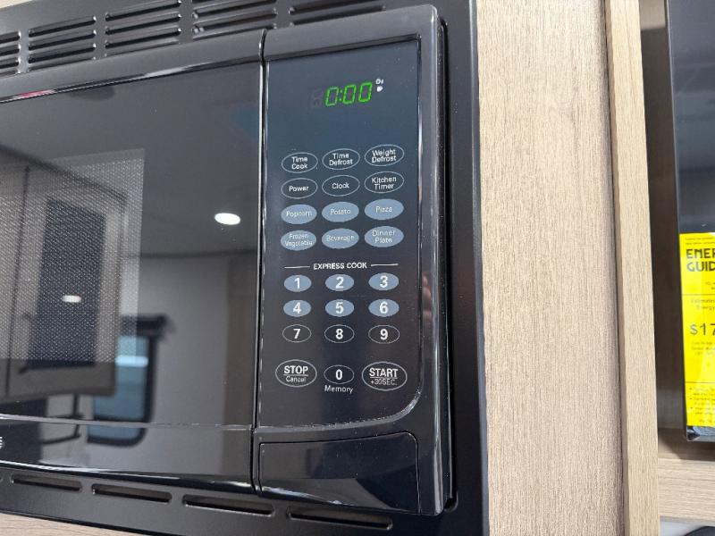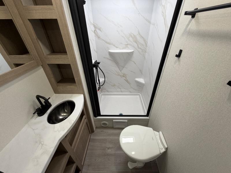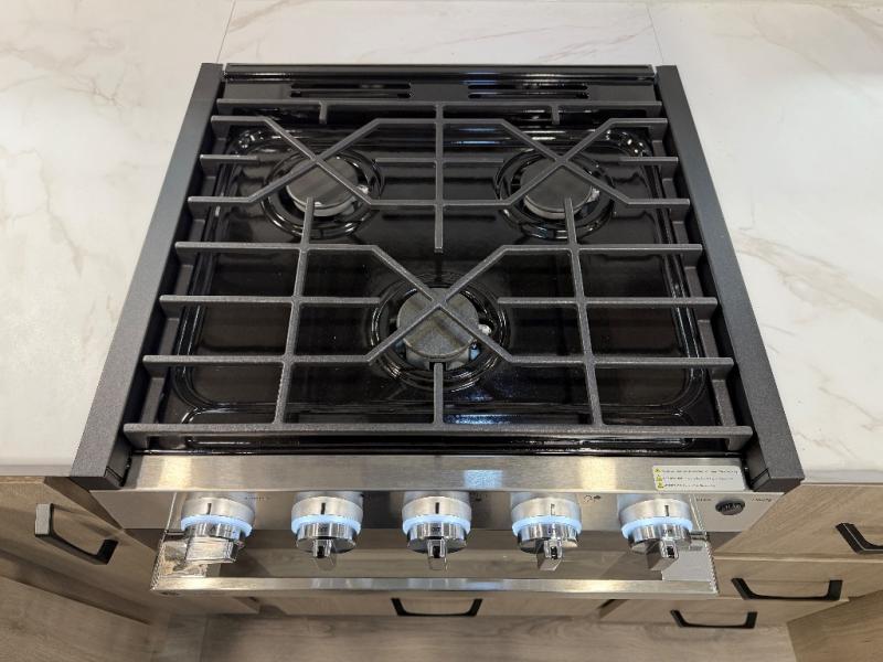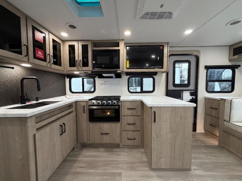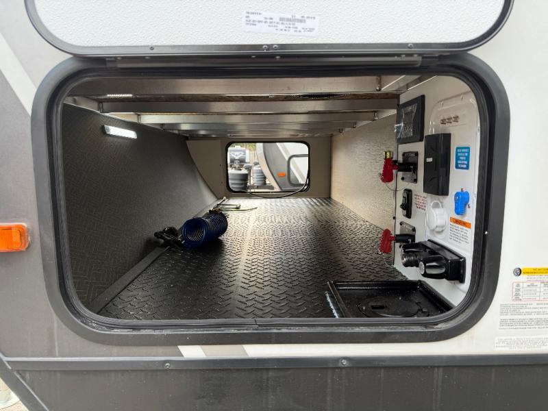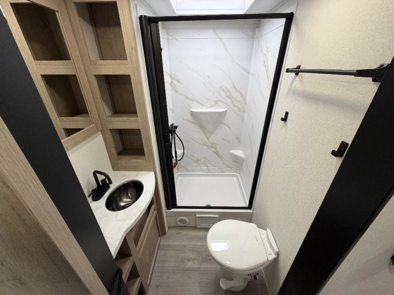 This 25RLE model travel trailer is designed for both comfort and convenience from front to back. At the front, the private bedroom features a spacious 60" x 80" queen bed with built-in wardrobe cubby storage and one of two entry doors for easy access. Moving down the hall, the full bathroom offers a residential-style walk-in shower with a skylight that adds both light and headroom, along with a mirrored medicine cabinet and linen shelves for towels and toiletries. The main living area opens up with a large slide out that houses 60" theater seating and a 10-cu. ft. refrigerator for all your fresh groceries, while a nearby pantry keeps your dry goods organized. Across from the slide, the U-shaped kitchen provides ample counter space, a three-burner range with oven, stainless steel sink, and microwave, everything you need to cook in comfort. At the rear, the booth dinette creates the perfect spot for meals or games and easily converts into an extra-sleeping area when needed.