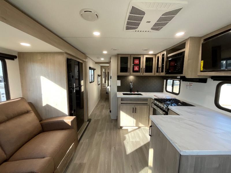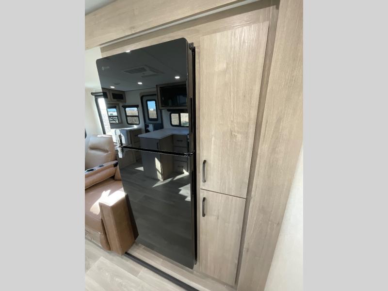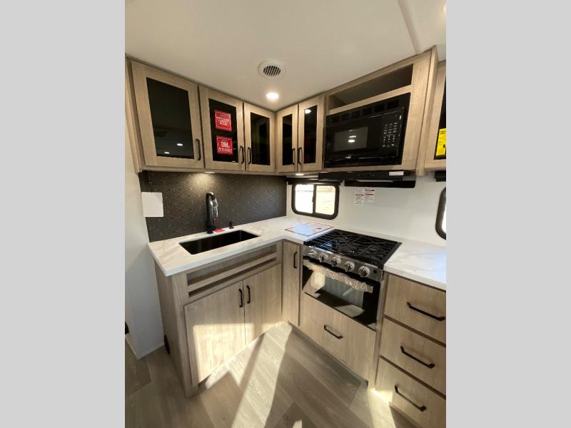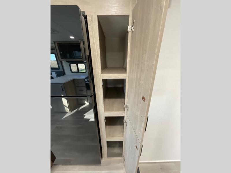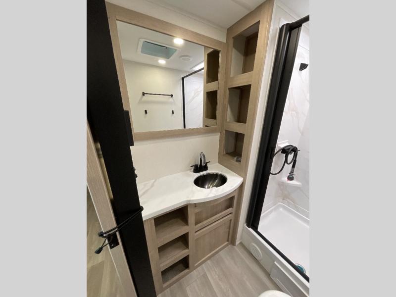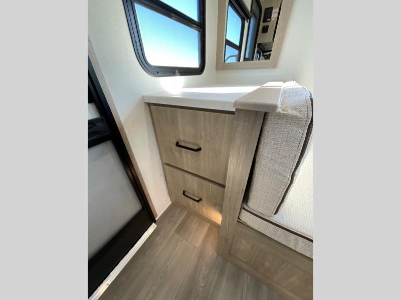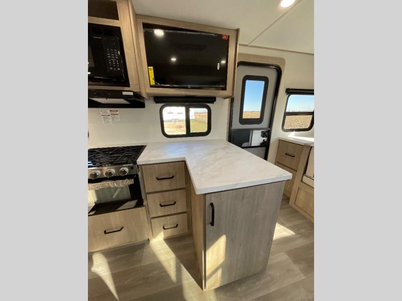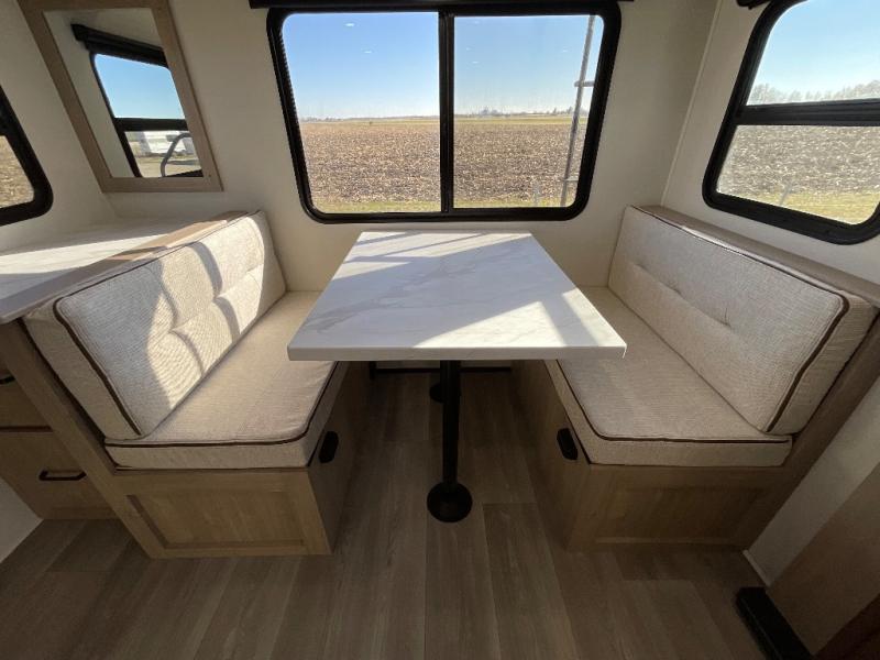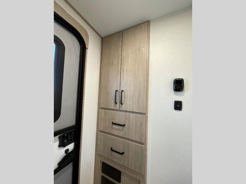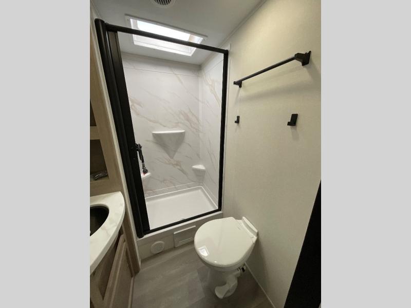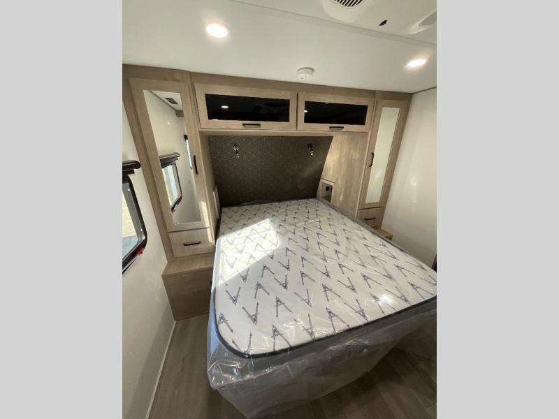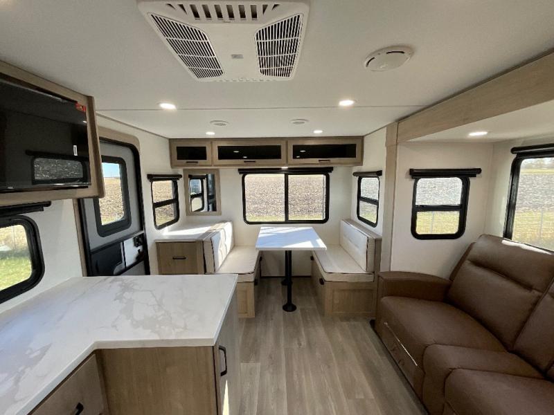 This 25RLE model travel trailer is designed for both comfort and convenience from front to back. At the front, the private bedroom features a spacious 60" x 80" queen bed with built-in wardrobe cubby storage and one of two entry doors for easy access. Moving down the hall, the full bathroom offers a residential-style walk-in shower with a skylight that adds both light and headroom, along with a mirrored medicine cabinet and linen shelves for towels and toiletries. The main living area opens up with a large slide out that houses 60" theater seating and a 10-cu. ft. refrigerator for all your fresh groceries, while a nearby pantry keeps your dry goods organized. Across from the slide, the U-shaped kitchen provides ample counter space, a three-burner range with oven, stainless steel sink, and microwave, everything you need to cook in comfort. At the rear, the booth dinette creates the perfect spot for meals or games and easily converts into an extra-sleeping area when needed.