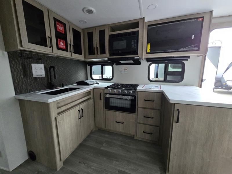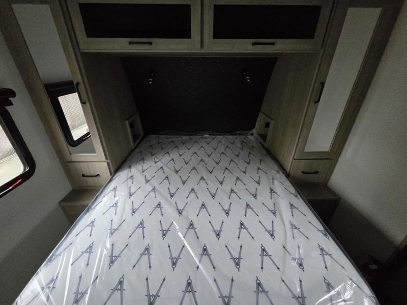 This 25RLE model travel trailer is designed for both comfort and convenience from front to back. At the front, the private bedroom features a spacious 60" x 80" queen bed with built-in wardrobe cubby storage and one of two entry doors for easy access. Moving down the hall, the full bathroom offers a residential-style walk-in shower with a skylight that adds both light and headroom, along with a mirrored medicine cabinet and linen shelves for towels and toiletries. The main living area opens up with a large slide out that houses 60" theater seating and a 10-cu. ft. refrigerator for all your fresh groceries, while a nearby pantry keeps your dry goods organized. Across from the slide, the U-shaped kitchen provides ample counter space, a three-burner range with oven, stainless steel sink, and microwave, everything you need to cook in comfort. At the rear, the booth dinette creates the perfect spot for meals or games and easily converts into an extra-sleeping area when needed.