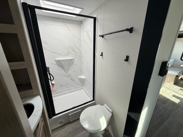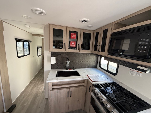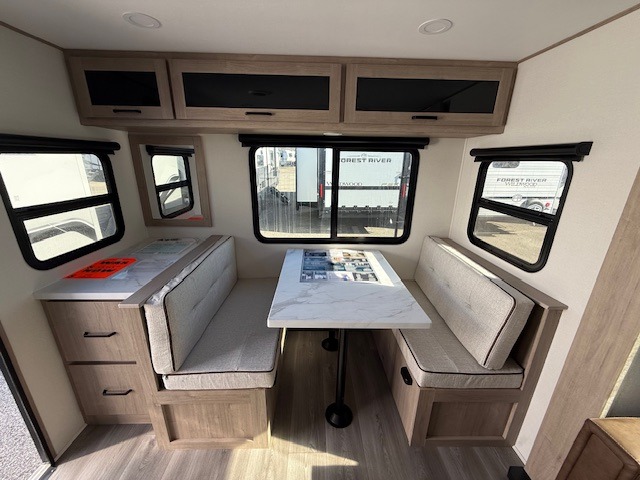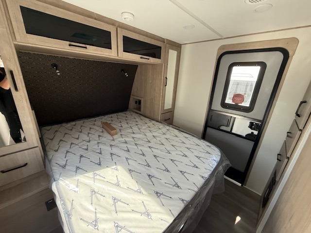 This 25RLE model travel trailer is designed for both comfort and convenience from front to back. At the front, the private bedroom features a spacious 60" x 80" queen bed with built-in wardrobe cubby storage and one of two entry doors for easy access. Moving down the hall, the full bathroom offers a residential-style walk-in shower with a skylight that adds both light and headroom, along with a mirrored medicine cabinet and linen shelves for towels and toiletries. The main living area opens up with a large slide out that houses 60" theater seating and a 10-cu. ft. refrigerator for all your fresh groceries, while a nearby pantry keeps your dry goods organized. Across from the slide, the U-shaped kitchen provides ample counter space, a three-burner range with oven, stainless steel sink, and microwave, everything you need to cook in comfort. At the rear, the booth dinette creates the perfect spot for meals or games and easily converts into an extra-sleeping area when needed.