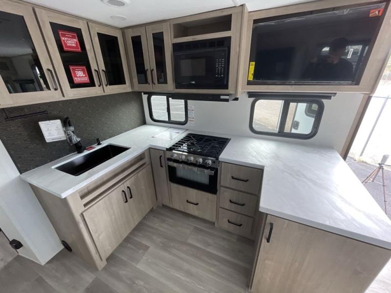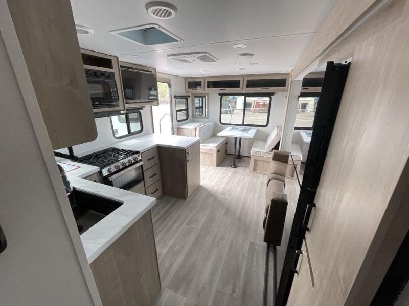 The main living area opens up thanks to a large slide that houses 60" theater seating and the 12V 10 cu. ft. refrigerator, giving you plenty of space to relax and store groceries for the trip. A pull-out pantry nearby keeps dry goods easily accessible. Across from the slide, the U-shaped kitchen is built for real cooking, with generous counter space, a three-burner range with oven, stainless steel sink, and microwave—ideal for everything from quick breakfasts to campsite dinners. At the rear, the booth dinette provides a welcoming place for meals, games, or work time, and easily converts into an extra sleeping area when needed.