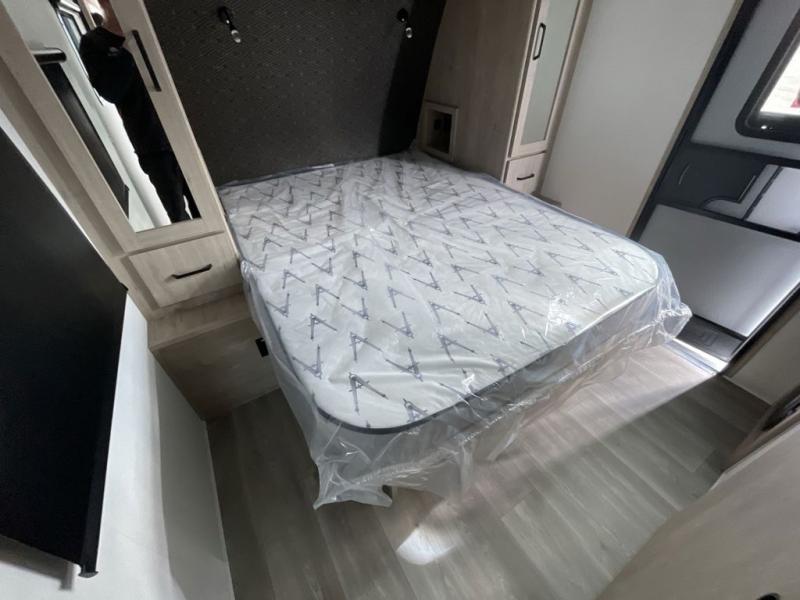 Up front, the private bedroom offers a comfortable 60" x 80" queen bed, wardrobe cubby storage, and one of the trailer’s two exterior entry doors.