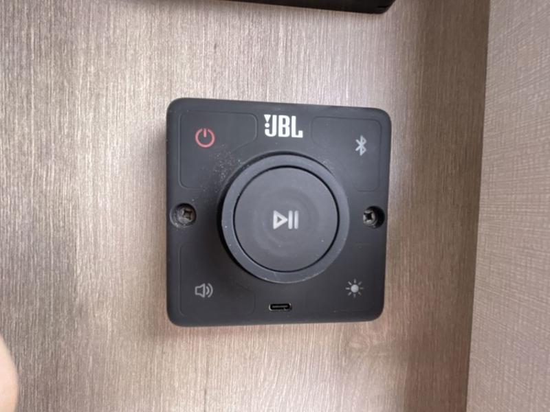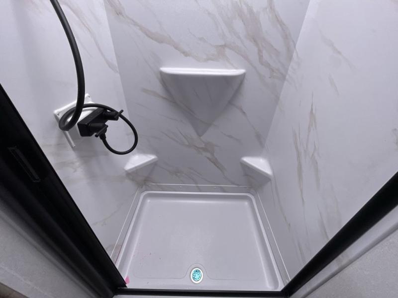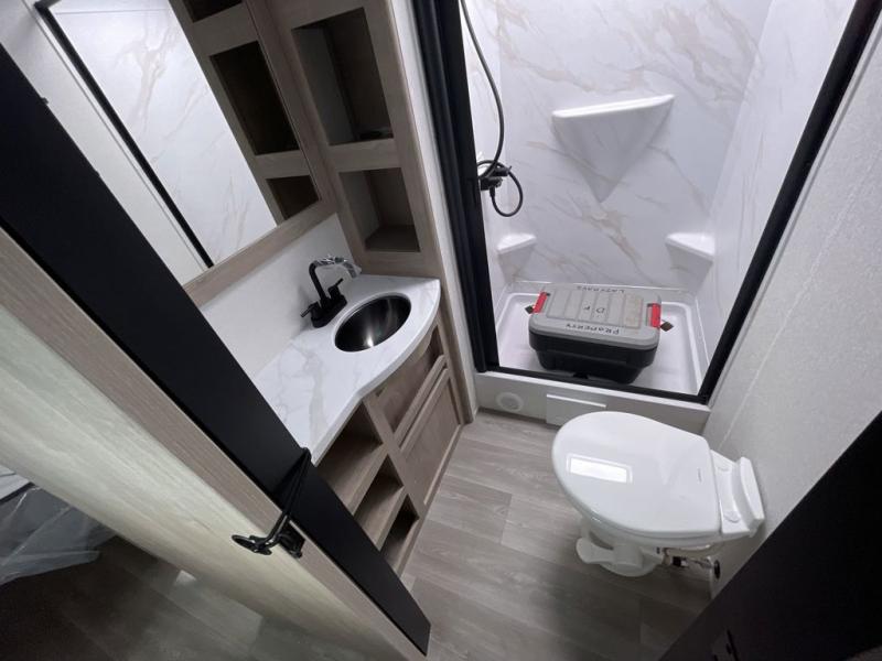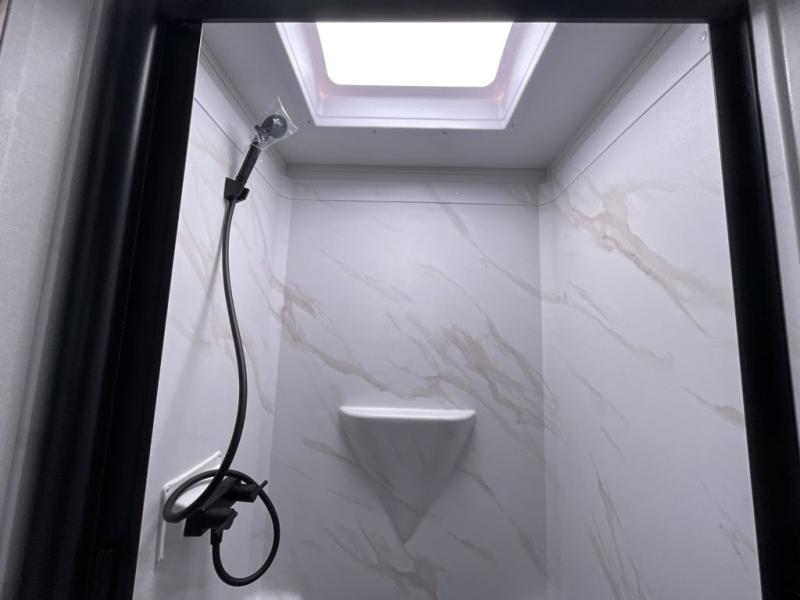 Up front, the private bedroom offers a comfortable 60" x 80" queen bed, wardrobe cubby storage, and one of the trailer’s two exterior entry doors, making early mornings or late nights effortless without disturbing the rest of the coach. Moving toward the center, the full bathroom features a residential-style walk-in shower with skylight for extra headroom and natural light, plus a mirrored medicine cabinet and linen shelving to keep daily essentials organized.