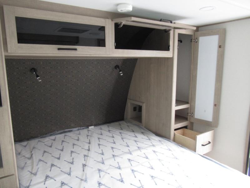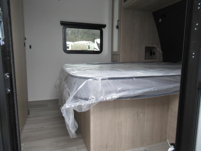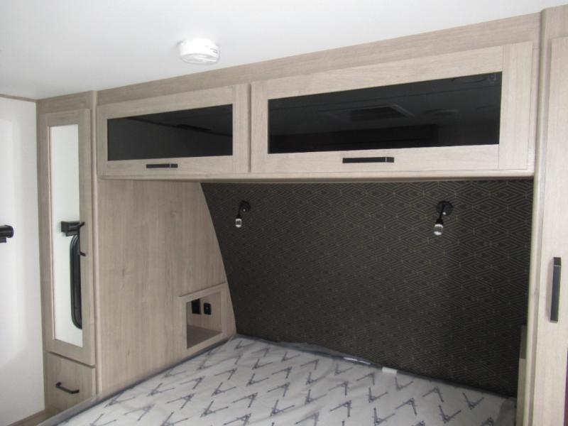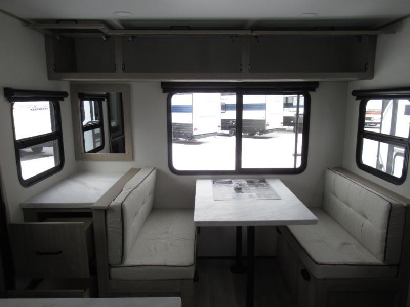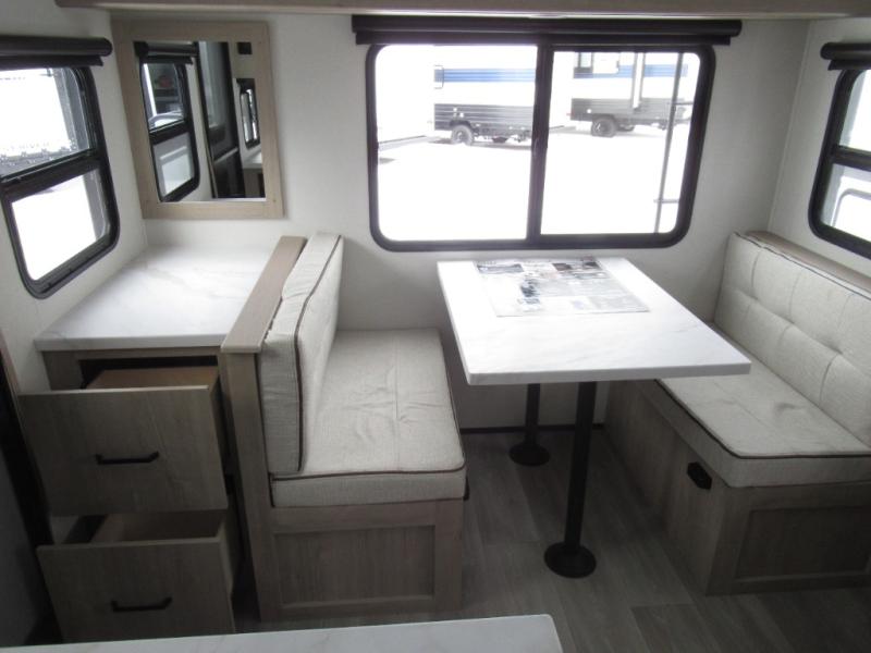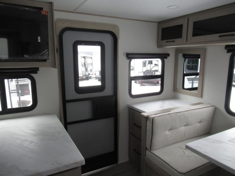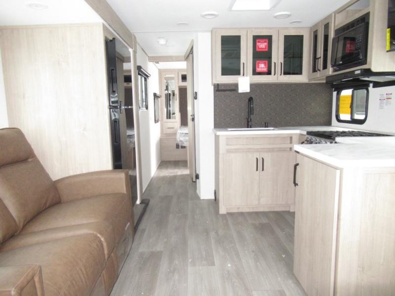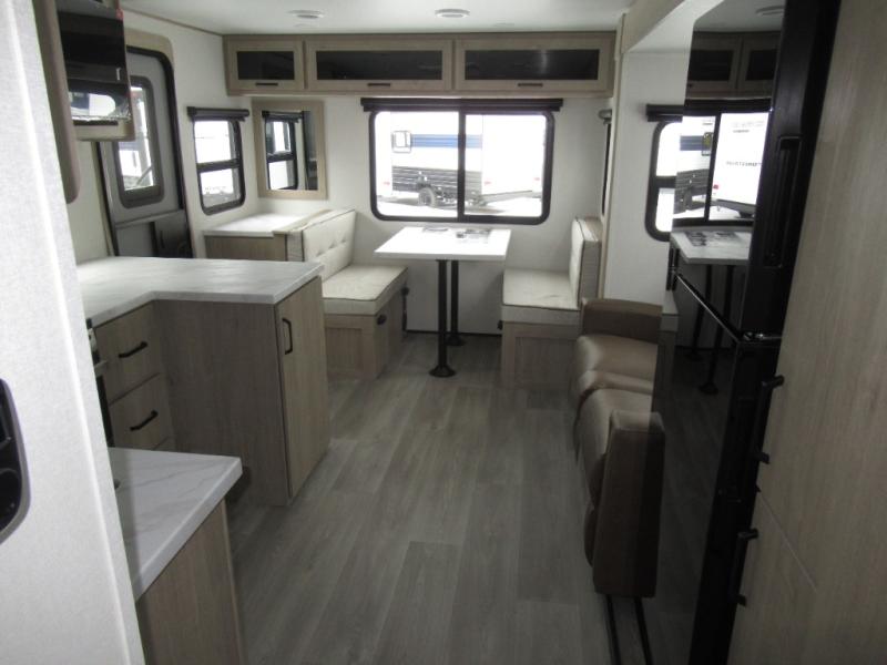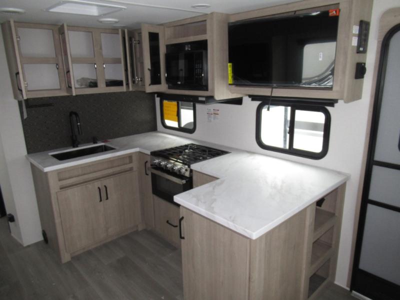 This 25RLE model travel trailer is designed for both comfort and convenience from front to back. At the front, the private bedroom features a spacious 60" x 80" queen bed with built-in wardrobe cubby storage and one of two entry doors for easy access. Moving down the hall, the full bathroom offers a residential-style walk-in shower with a skylight that adds both light and headroom, along with a mirrored medicine cabinet and linen shelves for towels and toiletries. The main living area opens up with a large slide out that houses 60" theater seating and a 10-cu. ft. refrigerator for all your fresh groceries, while a nearby pantry keeps your dry goods organized. Across from the slide, the U-shaped kitchen provides ample counter space, a three-burner range with oven, stainless steel sink, and microwave, everything you need to cook in comfort. At the rear, the booth dinette creates the perfect spot for meals or games and easily converts into an extra-sleeping area when needed.