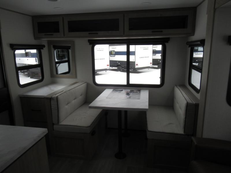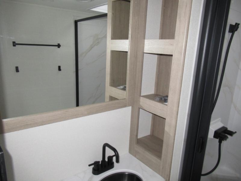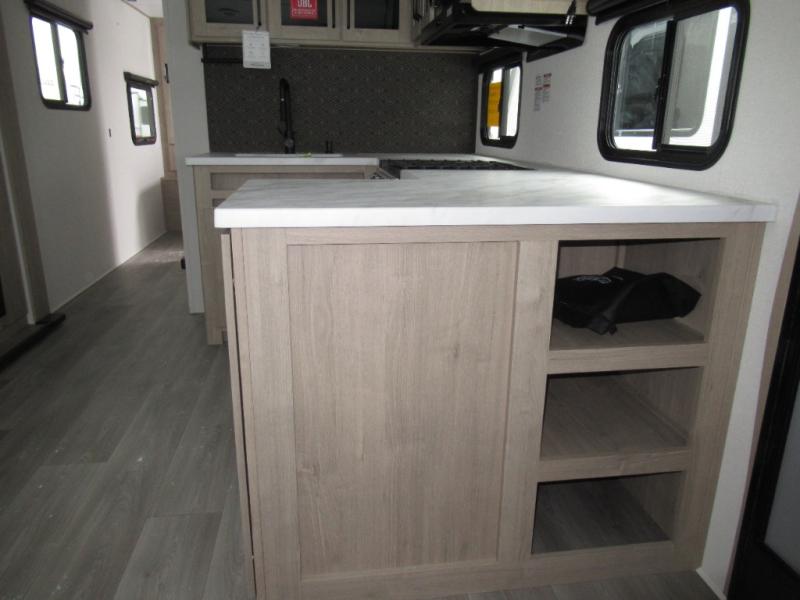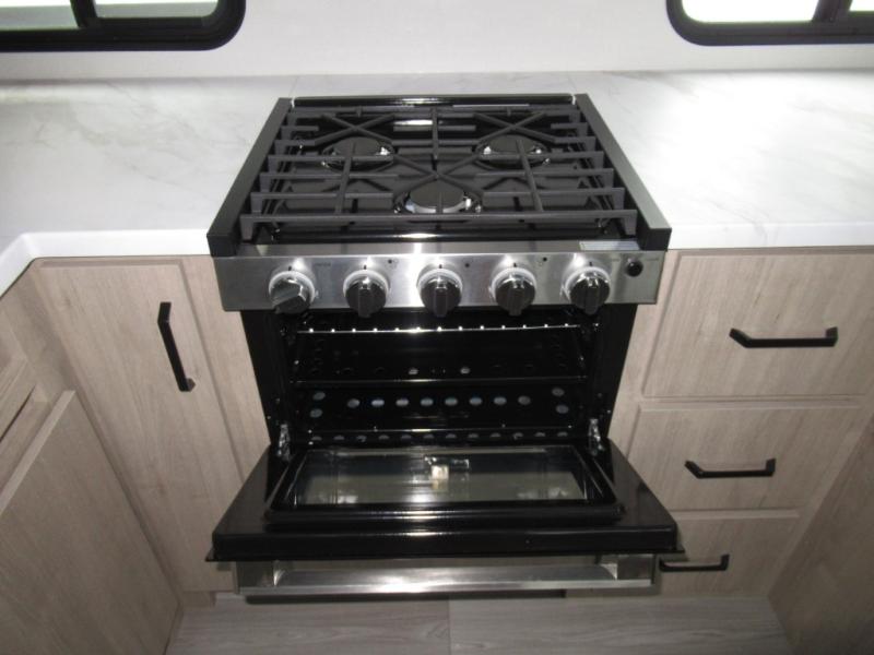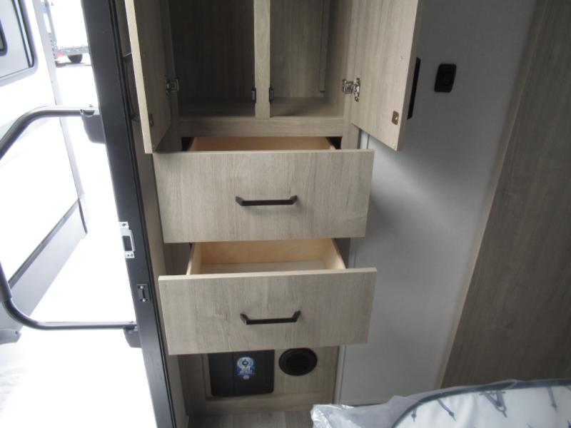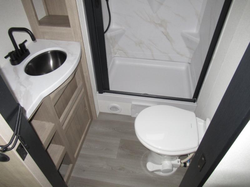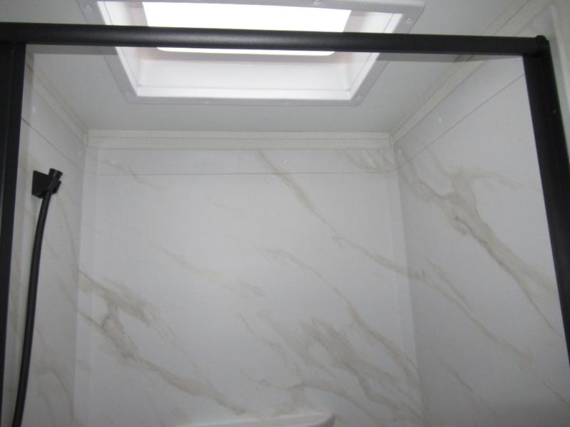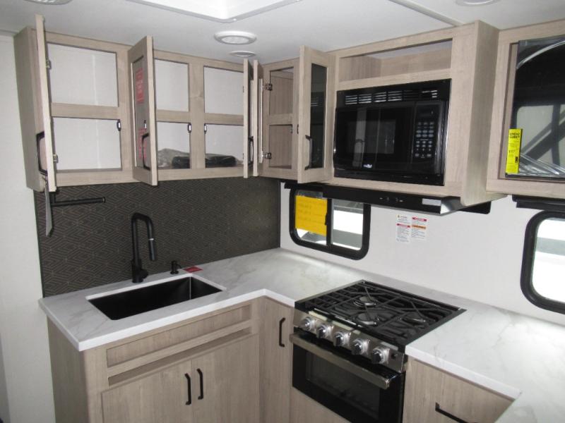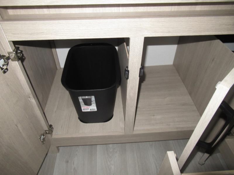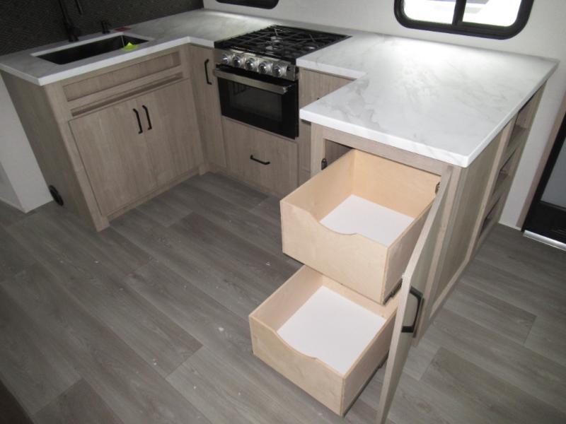 This 25RLE model travel trailer is designed for both comfort and convenience from front to back. At the front, the private bedroom features a spacious 60" x 80" queen bed with built-in wardrobe cubby storage and one of two entry doors for easy access. Moving down the hall, the full bathroom offers a residential-style walk-in shower with a skylight that adds both light and headroom, along with a mirrored medicine cabinet and linen shelves for towels and toiletries. The main living area opens up with a large slide out that houses 60" theater seating and a 10-cu. ft. refrigerator for all your fresh groceries, while a nearby pantry keeps your dry goods organized. Across from the slide, the U-shaped kitchen provides ample counter space, a three-burner range with oven, stainless steel sink, and microwave, everything you need to cook in comfort. At the rear, the booth dinette creates the perfect spot for meals or games and easily converts into an extra-sleeping area when needed.