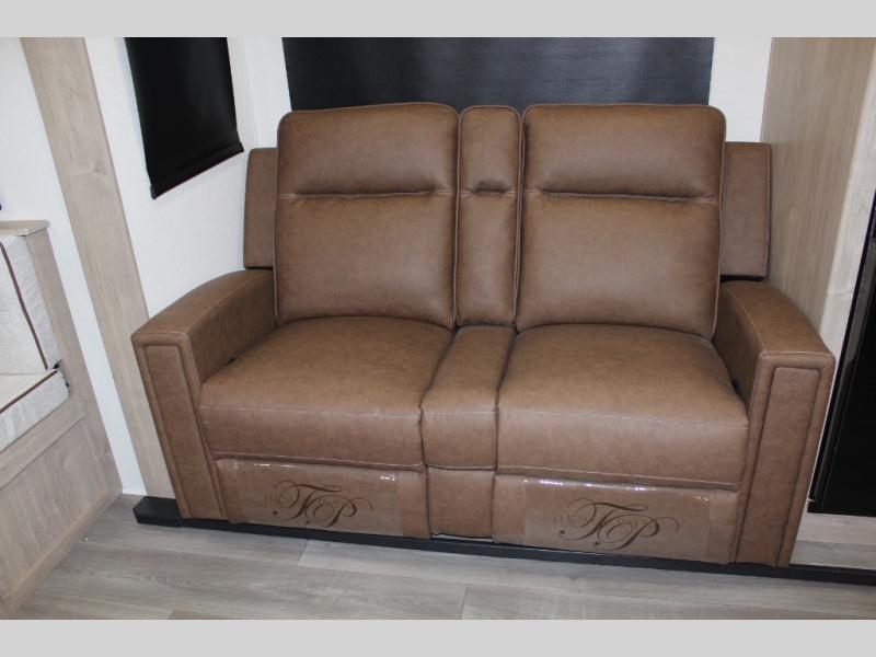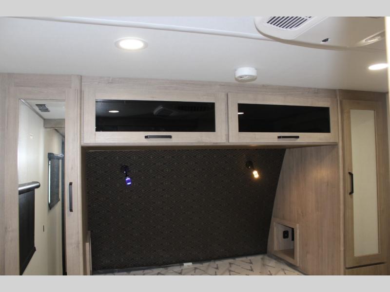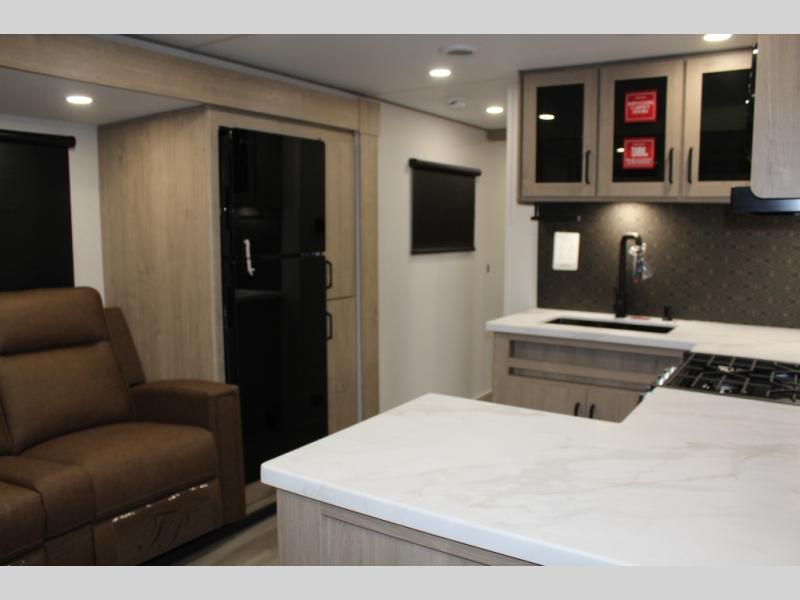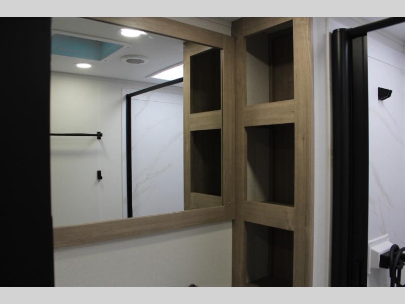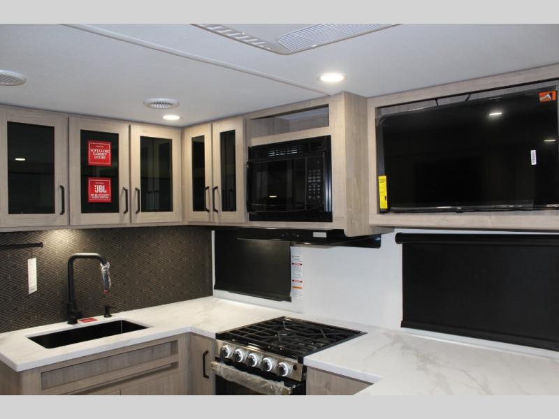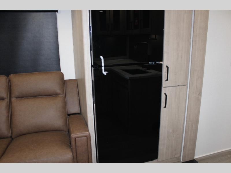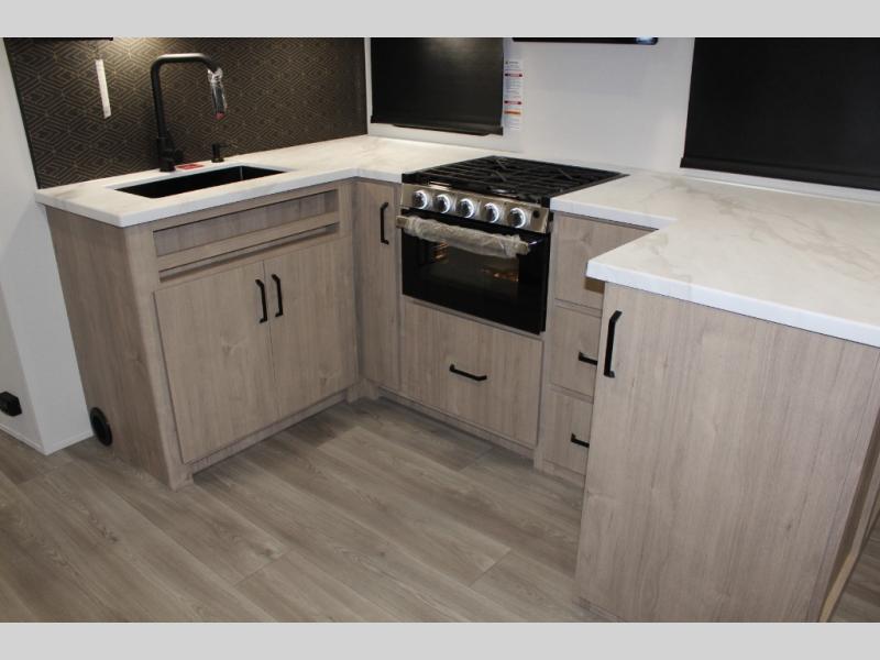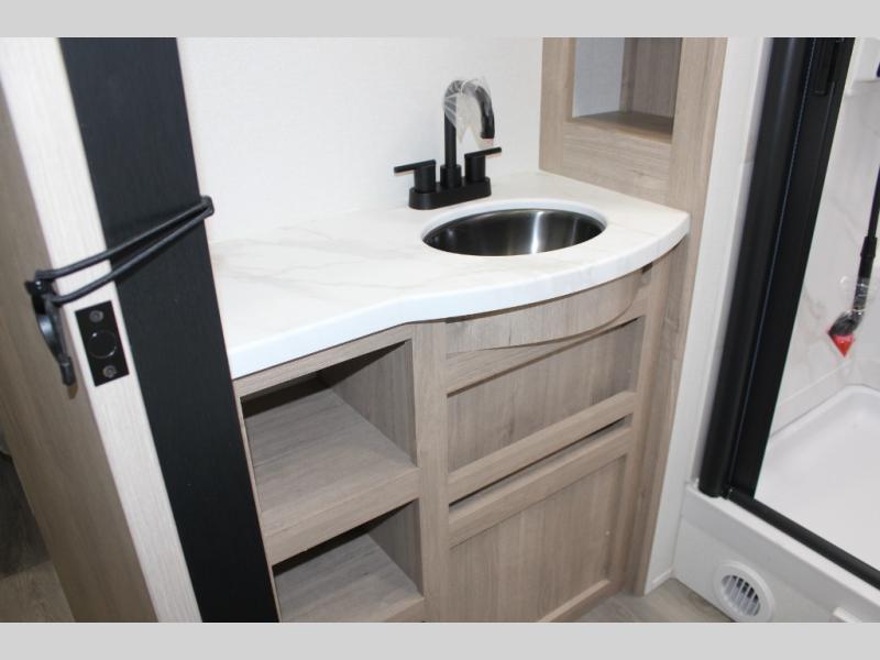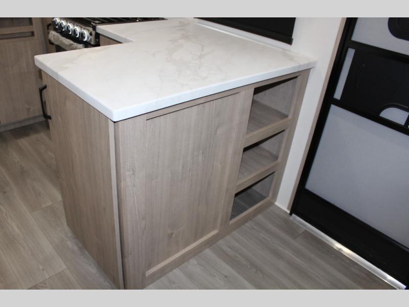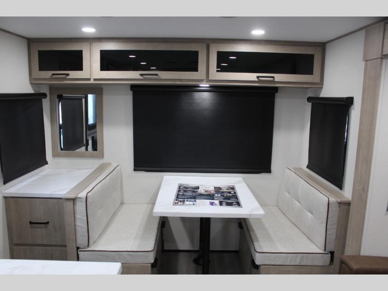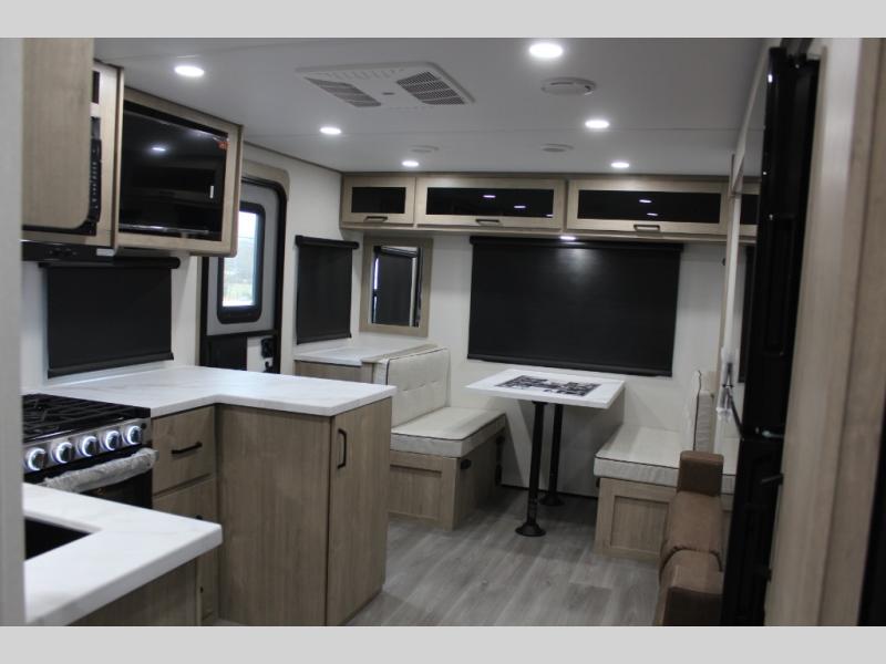 This 25RLE model travel trailer is designed for both comfort and convenience from front to back. At the front, the private bedroom features a spacious 60" x 80" queen bed with built-in wardrobe cubby storage and one of two entry doors for easy access. Moving down the hall, the full bathroom offers a residential-style walk-in shower with a skylight that adds both light and headroom, along with a mirrored medicine cabinet and linen shelves for towels and toiletries. The main living area opens up with a large slide out that houses 60" theater seating and a 10-cu. ft. refrigerator for all your fresh groceries, while a nearby pantry keeps your dry goods organized. Across from the slide, the U-shaped kitchen provides ample counter space, a three-burner range with oven, stainless steel sink, and microwave, everything you need to cook in comfort. At the rear, the booth dinette creates the perfect spot for meals or games and easily converts into an extra-sleeping area when needed.