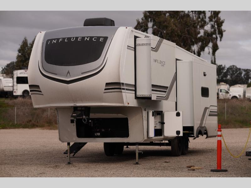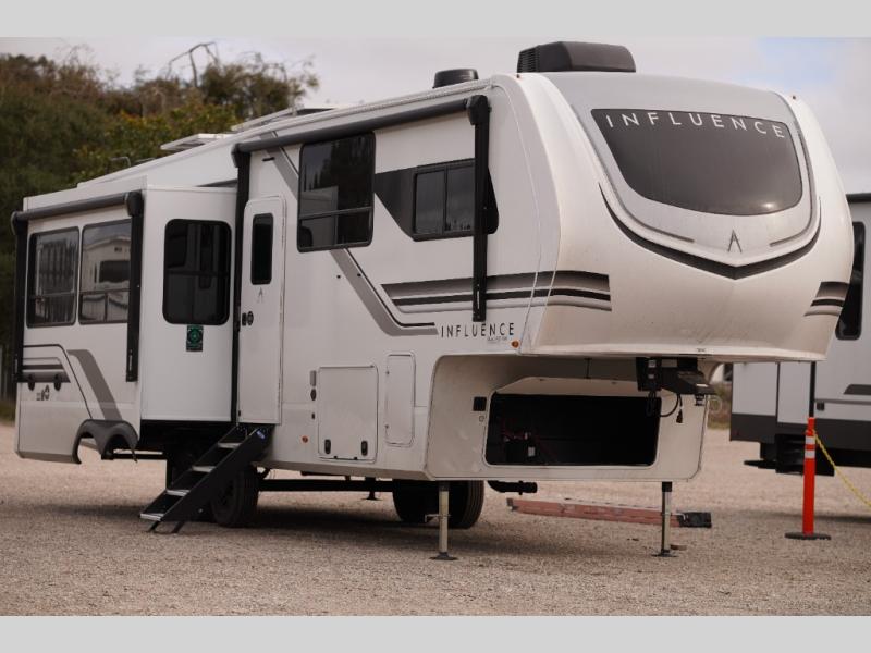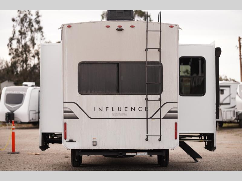 Any Grand Design Influence fifth wheel features five-sided aluminum cage construction with a walk-on roof and a fully enclosed underbelly with heated tanks and storage for all weather camping. For peace of mind, the MORryde CRE3000 Suspension system will provide safe and smooth towing, and the 101" widebody construction offers all the room you need and that is before multiple slides are fully engaged. You will appreciate the Keyed-Alike locks, slam-latch baggage doors with magnetic door catches, exterior security light, and SolidStep entry steps. On the inside, Congoleum flooring, premium roller shades for privacy, a hallway handrail for safety, and nightstands with USB ports to keep all of your electronics fully charged. You will also love the on demand tankless water heater when showering, plus the added heat and ambiance from an electric fireplace, and so much more!