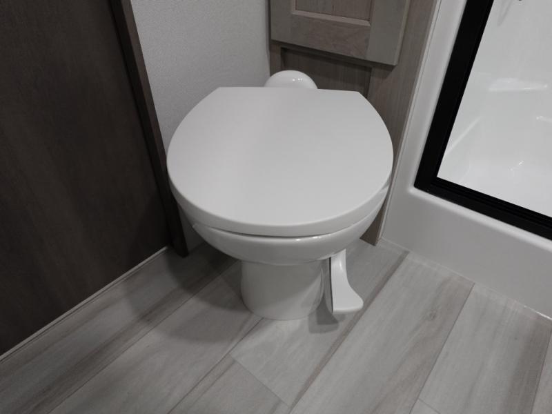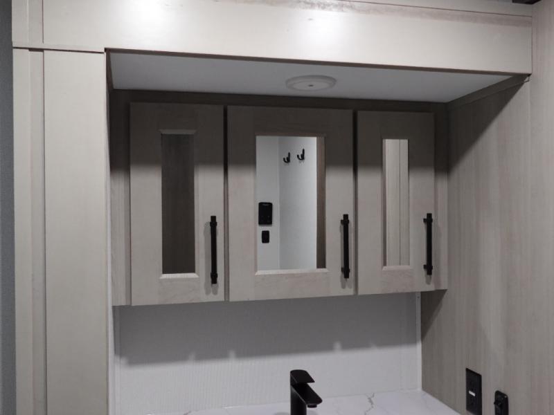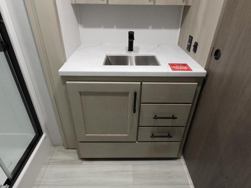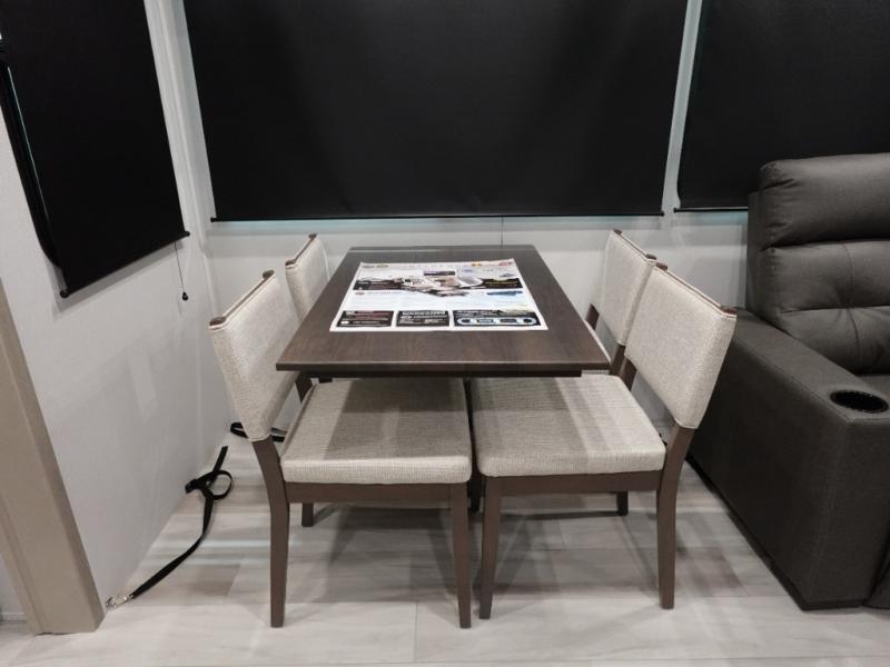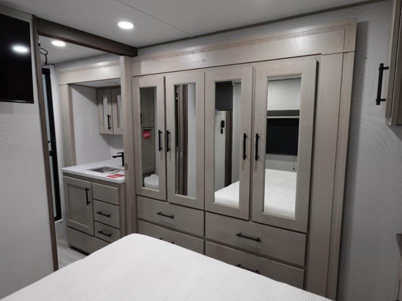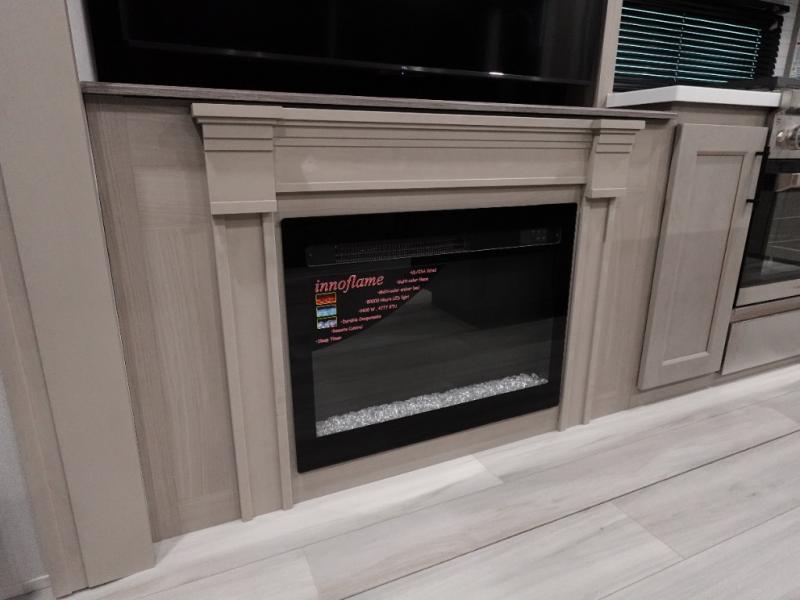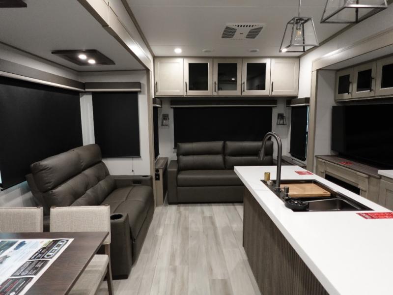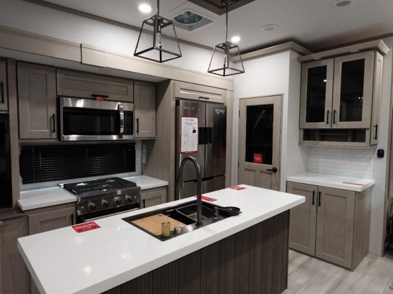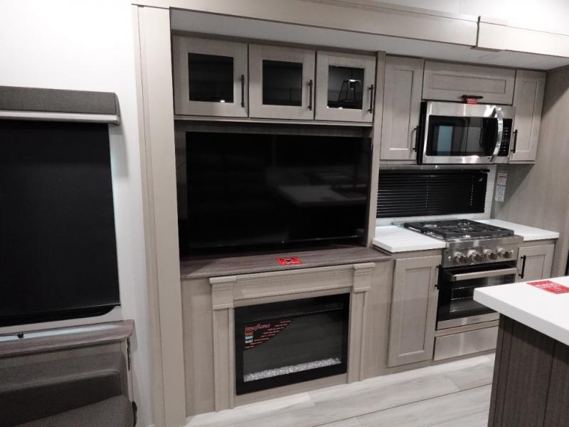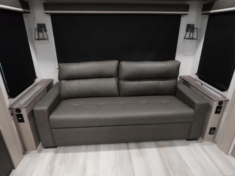 You'll feel right at home in this spacious fifth wheel with triple slides, a front master bedroom, and a kitchen island with extra counter space. The theatre seating is right across from the entertainment center which includes a 40" TV and fireplace, and there is a rear tri-fold sofa if you have any guests staying over. This model includes a hutch in the kitchen with cabinets above to store you nice dishes, plus there is a large pantry with washer and dryer prep if you plan to go full-time. Head to the dual entry bath that includes a linen closet and a spacious shower, and check out the front master bedroom with its queen bed, and slide out wardrobe.
