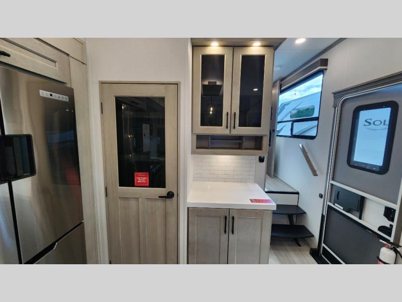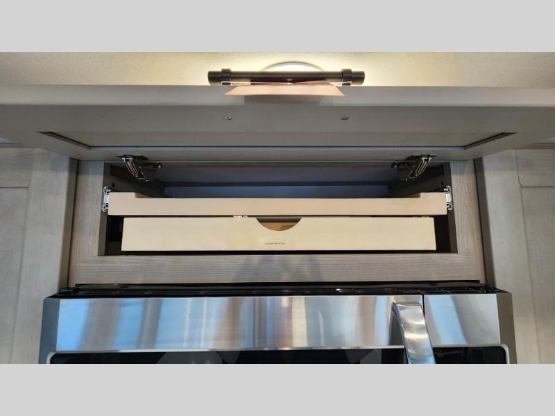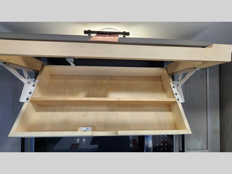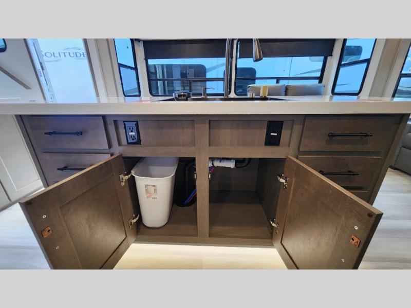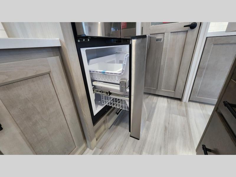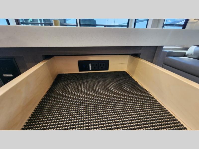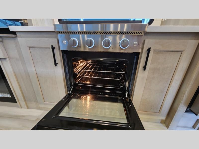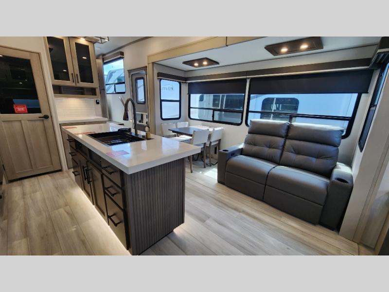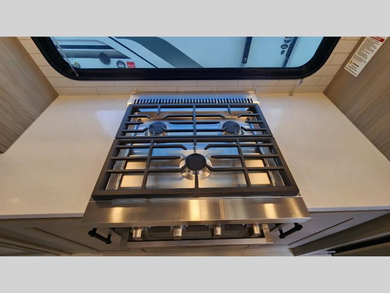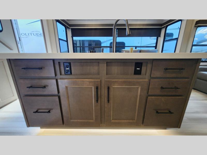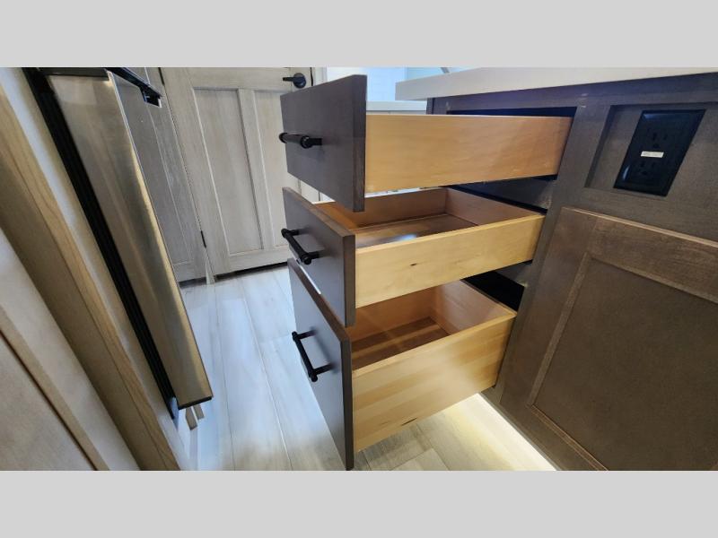 Enjoy a large island, 16 cu. ft. refrigerator, residential cooktop, and solid surface countertops—perfect for prepping meals at the campground or on the road. -