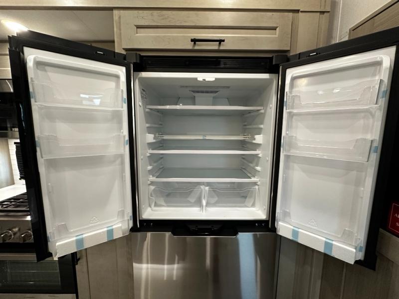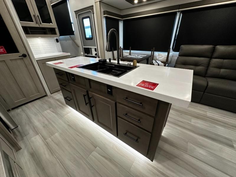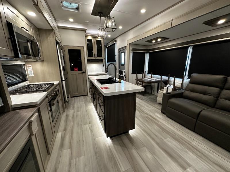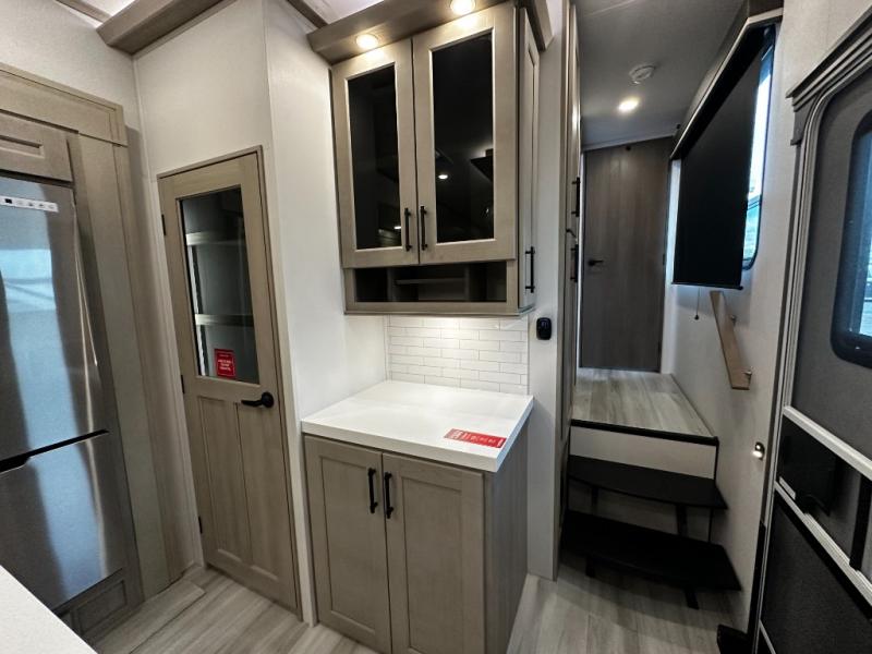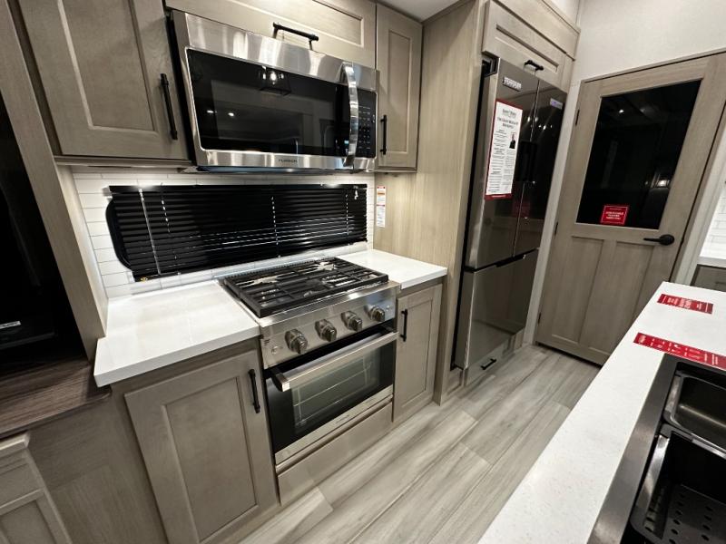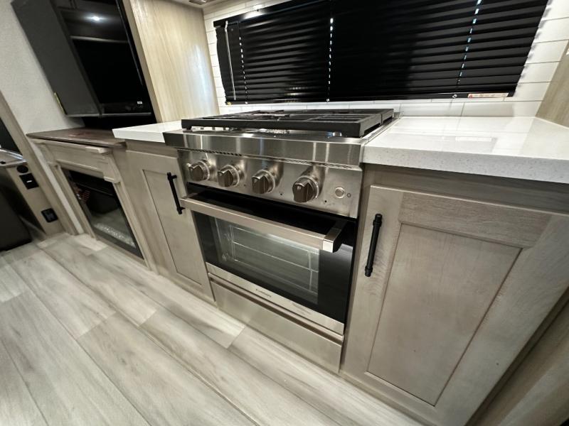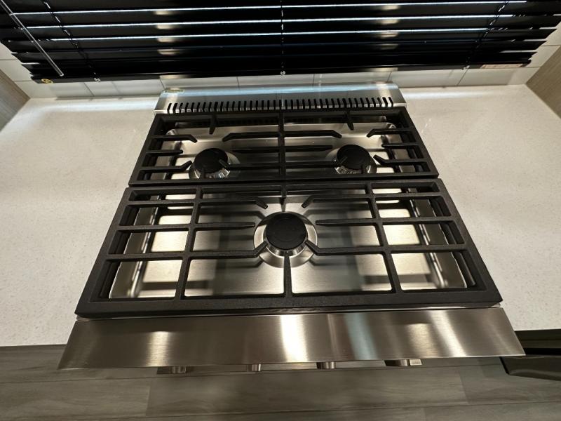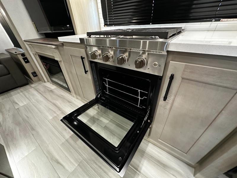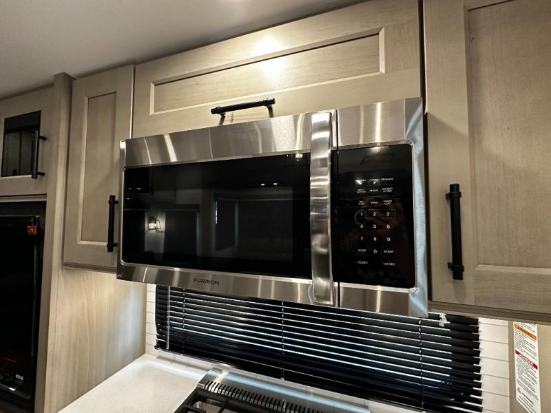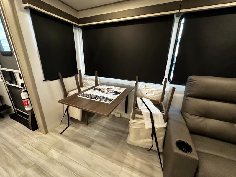 The kitchen is designed with functionality and style in mind. Solid-surface countertops, a residential-size refrigerator, microwave, three-burner cooktop, and ample cabinet storage make meal prep simple and enjoyable, whether you're whipping up quick snacks or full dinners on the road. The dinette provides a comfortable space for dining, game nights, or working remotely.