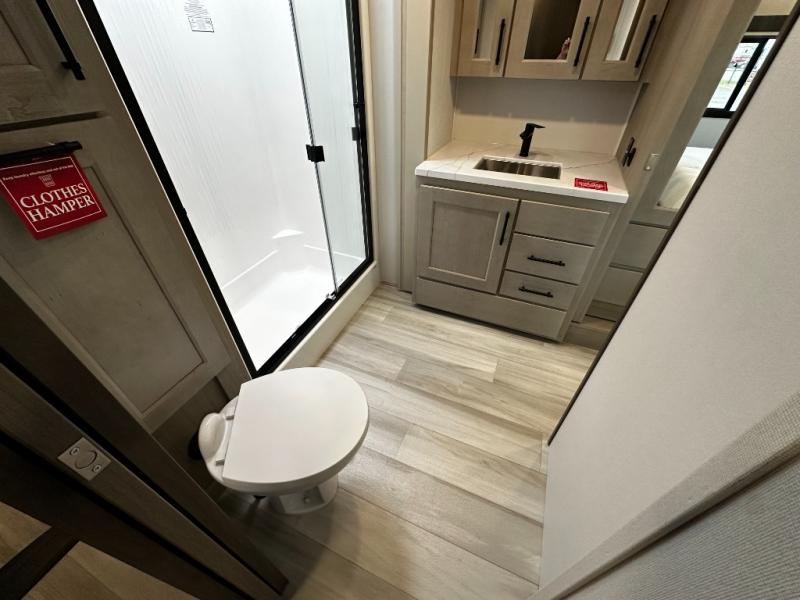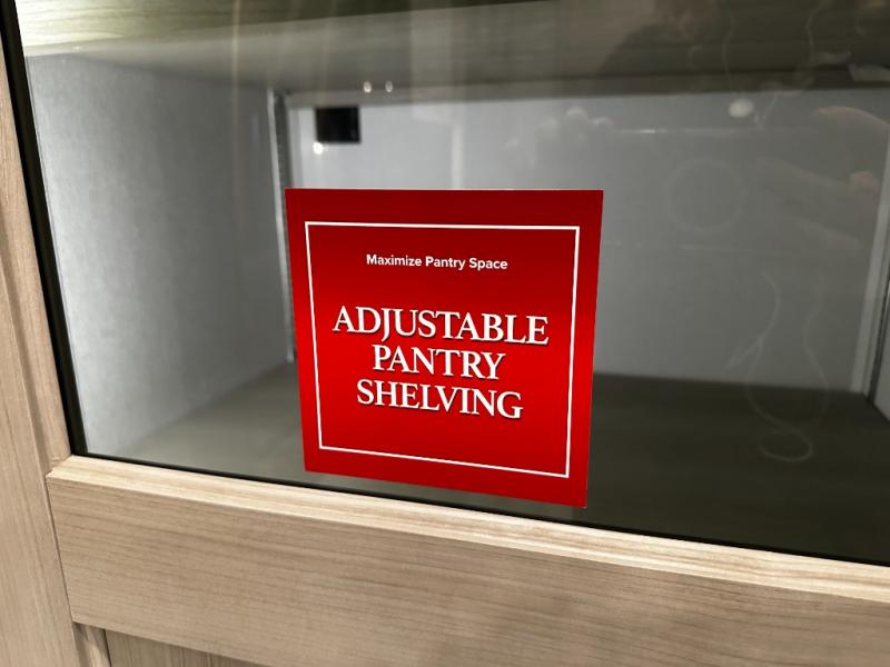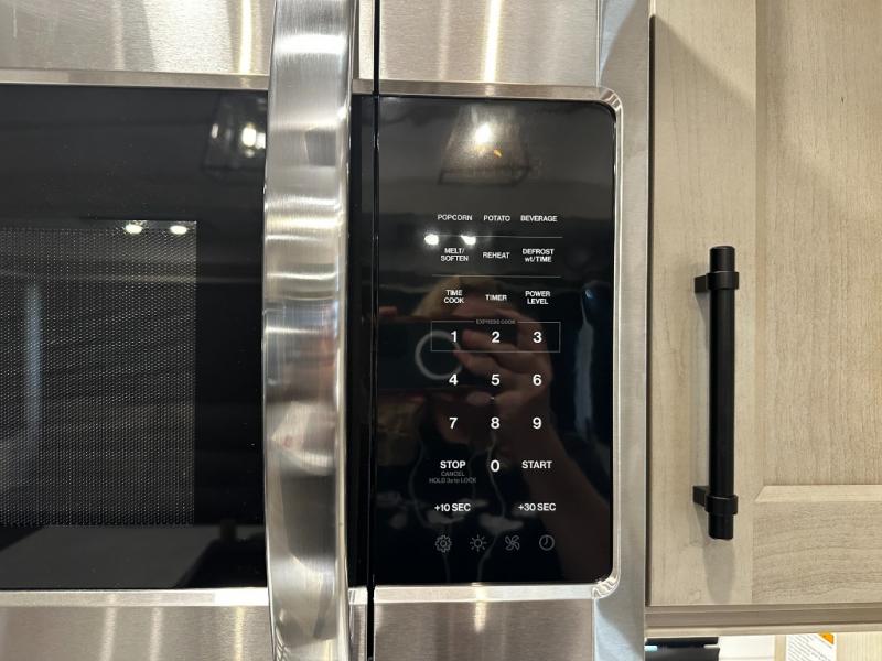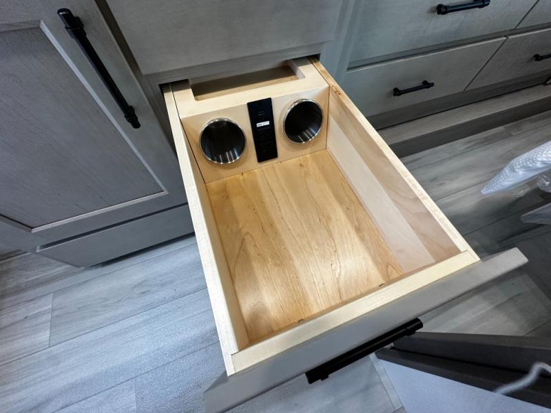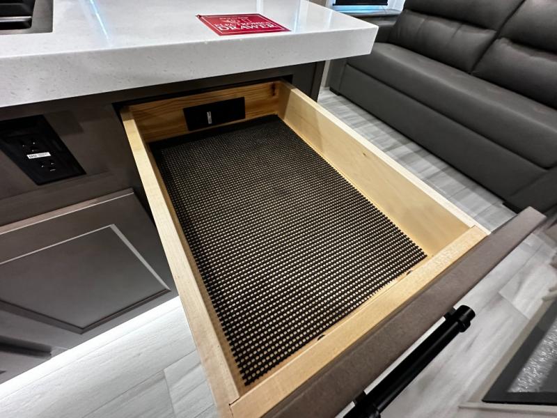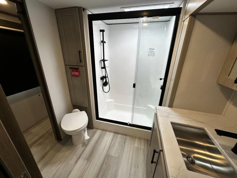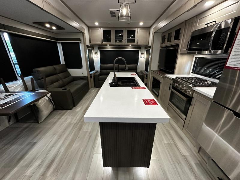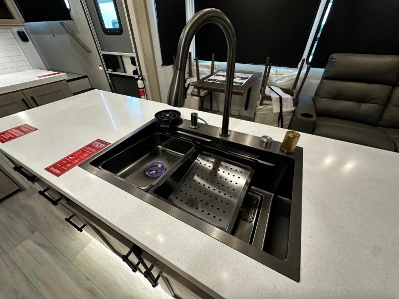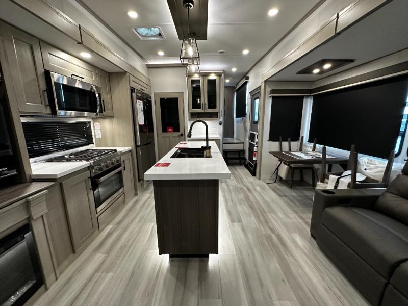 The kitchen is designed with functionality and style in mind. Solid-surface countertops, a residential-size refrigerator, microwave, three-burner cooktop, and ample cabinet storage make meal prep simple and enjoyable, whether you're whipping up quick snacks or full dinners on the road. The dinette provides a comfortable space for dining, game nights, or working remotely.