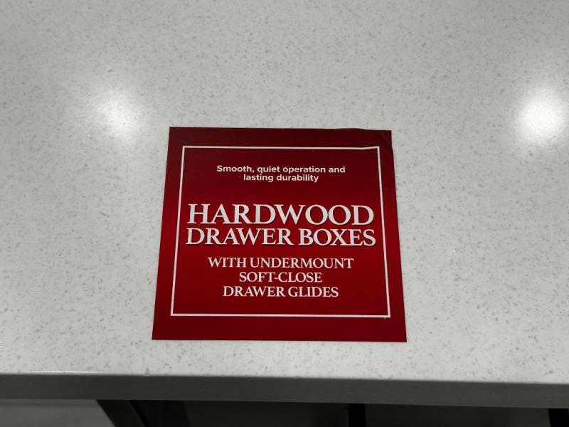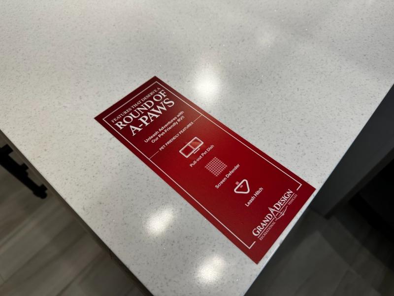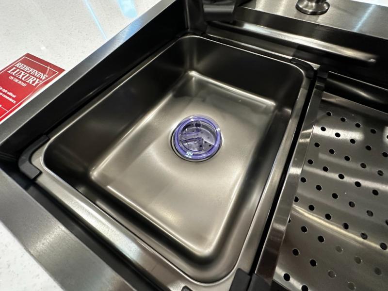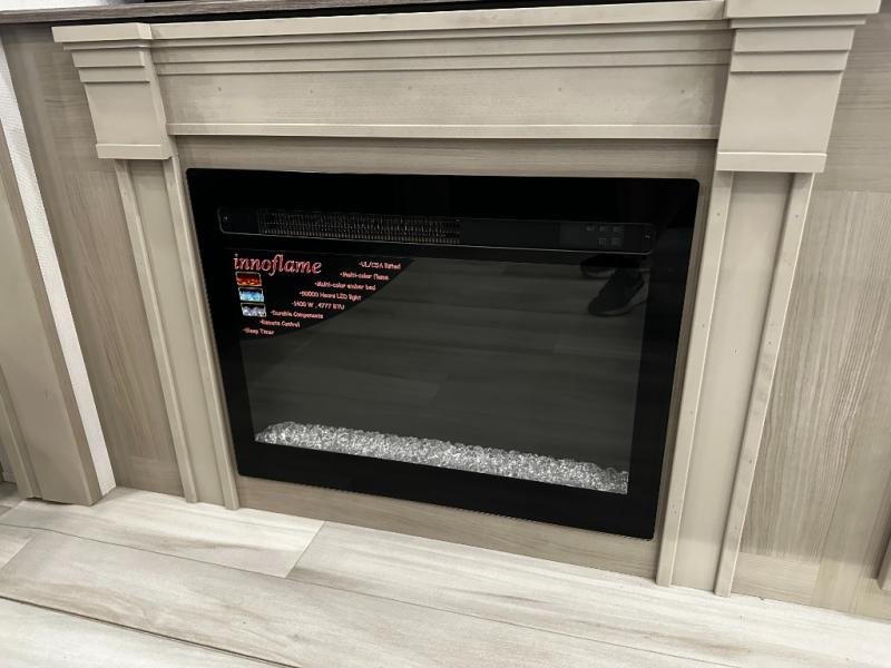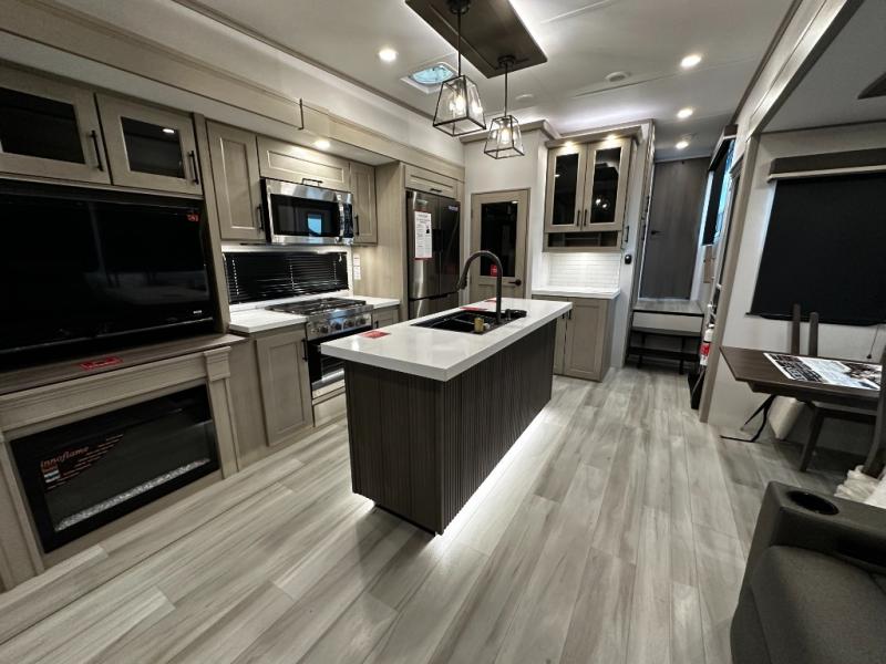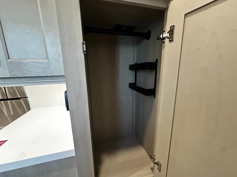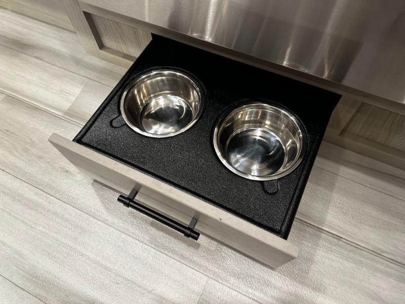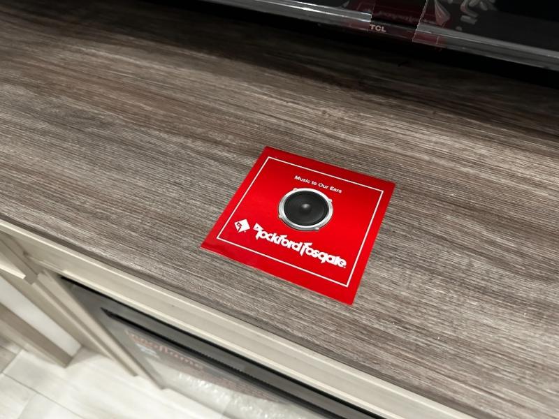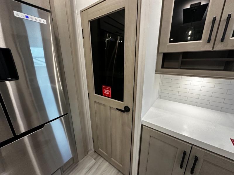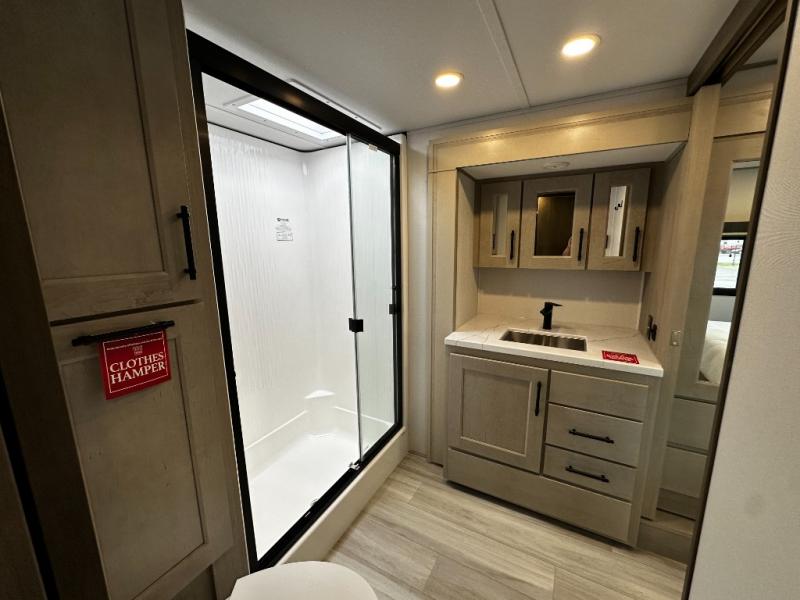 The kitchen is designed with functionality and style in mind. Solid-surface countertops, a residential-size refrigerator, microwave, three-burner cooktop, and ample cabinet storage make meal prep simple and enjoyable, whether you're whipping up quick snacks or full dinners on the road. The dinette provides a comfortable space for dining, game nights, or working remotely.