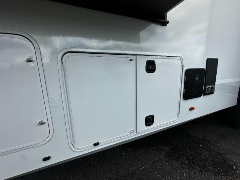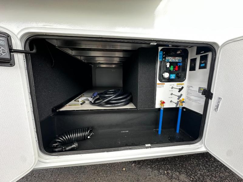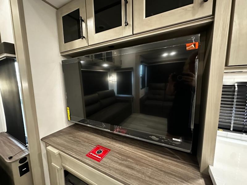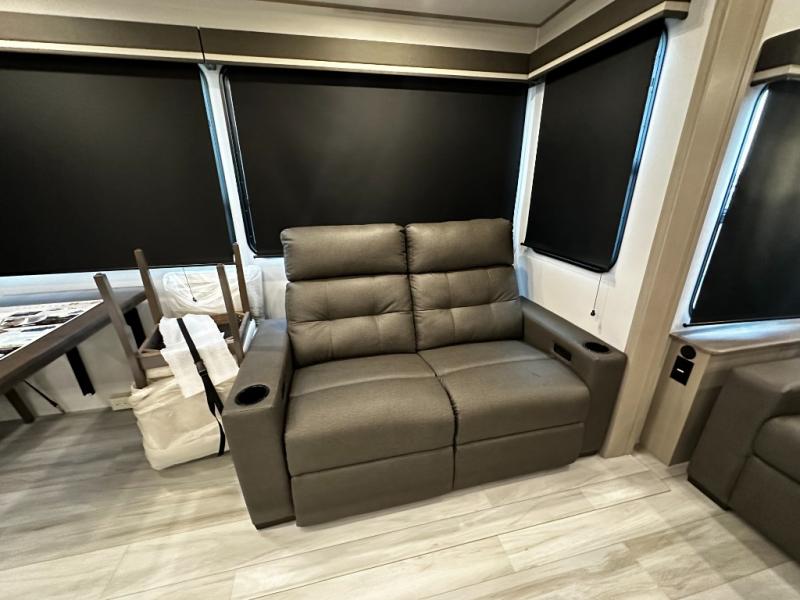 Inside, the rear-living layout creates an open, inviting space ideal for relaxing, entertaining, or enjoying your favorite media. Theater seating, a plush sofa, and a well-placed entertainment center with a large TV provide the ultimate comfort zone. Panoramic windows fill the interior with natural light, giving the motorhome a bright, airy feel and bringing the outdoors in.
