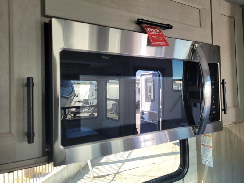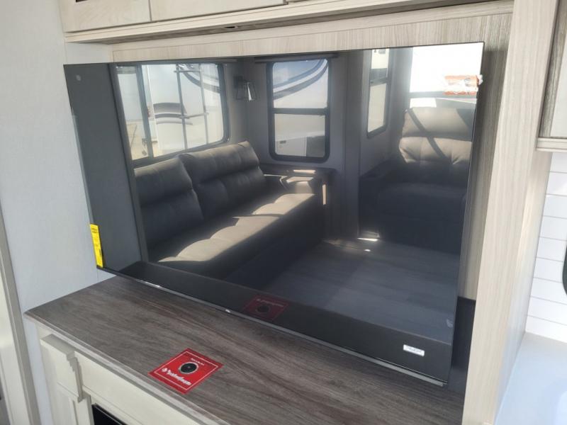 You'll feel right at home in this spacious fifth wheel with triple slides, a front master bedroom, and a kitchen island with extra counter space. The theatre seating is right across from the entertainment center which includes a 40" TV and fireplace, and there is a rear tri-fold sofa if you have any guests staying over. This model includes a hutch in the kitchen with cabinets above to store you nice dishes, plus there is a large pantry with washer and dryer prep if you plan to go full-time. Head to the dual entry bath that includes a linen closet and a spacious shower, and check out the front master bedroom with its queen bed, and slide out wardrobe. You can choose the optional king bed if you enjoy a bit more room in bed!