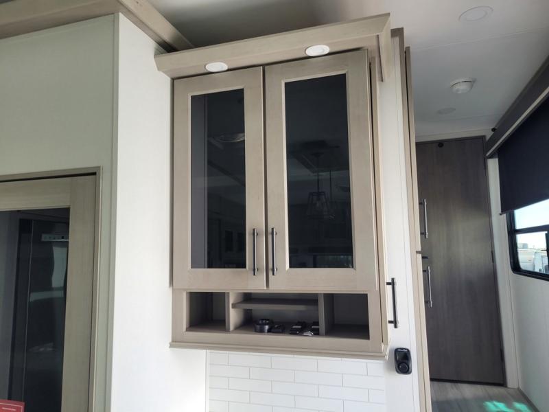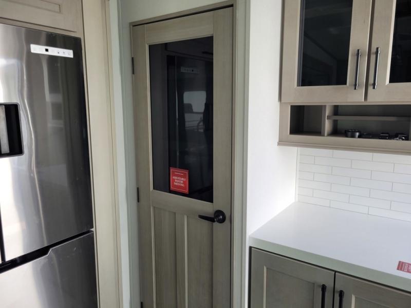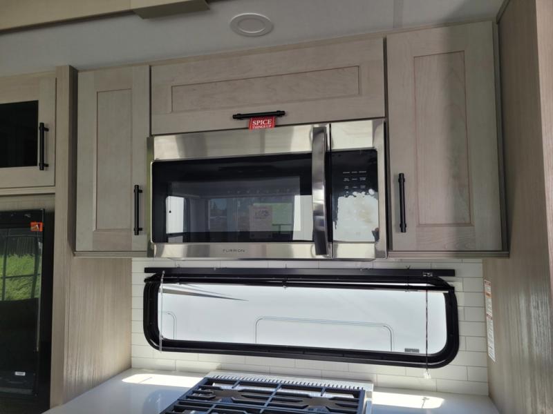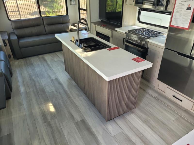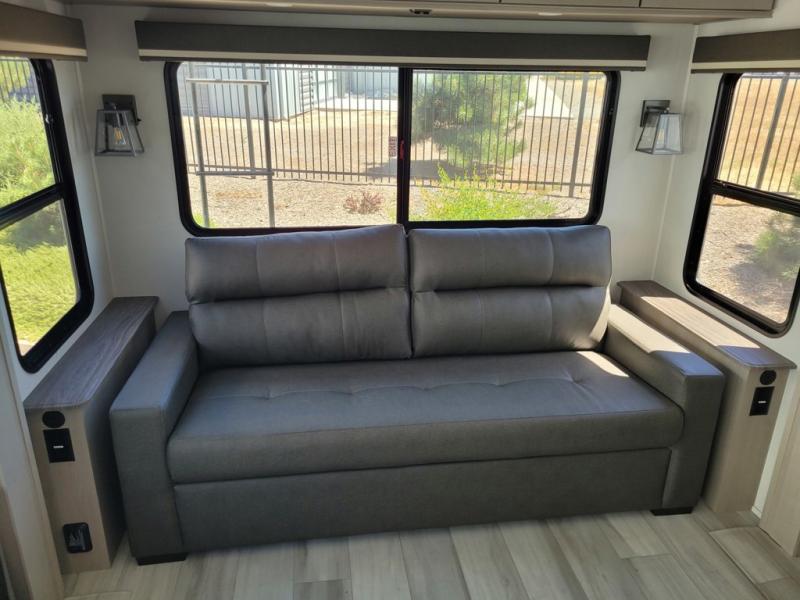 You'll feel right at home in this spacious fifth wheel with triple slides, a front master bedroom, and a kitchen island with extra counter space. The theatre seating is right across from the entertainment center which includes a 40" TV and fireplace, and there is a rear tri-fold sofa if you have any guests staying over. This model includes a hutch in the kitchen with cabinets above to store you nice dishes, plus there is a large pantry with washer and dryer prep if you plan to go full-time. Head to the dual entry bath that includes a linen closet and a spacious shower, and check out the front master bedroom with its queen bed, and slide out wardrobe. You can choose the optional king bed if you enjoy a bit more room in bed!