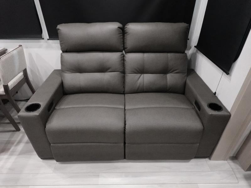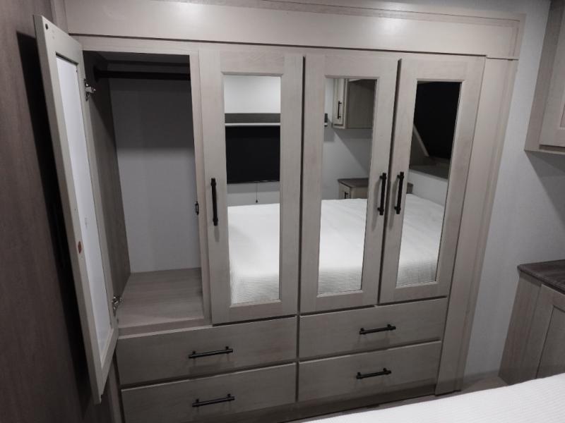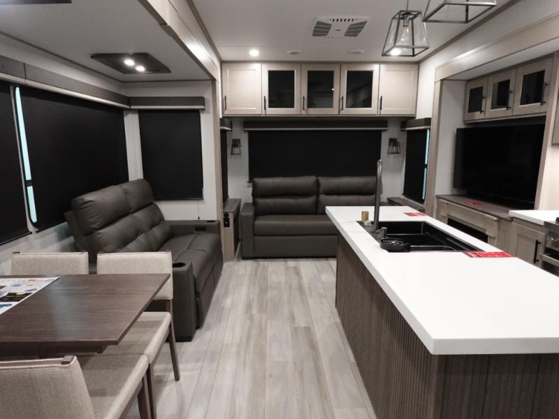 You'll feel right at home in this spacious fifth wheel with triple slides, a front master bedroom, and a kitchen island with extra counter space. The theatre seating is right across from the entertainment center which includes a 40" TV and fireplace, and there is a rear tri-fold sofa if you have any guests staying over. This model includes a hutch in the kitchen with cabinets above to store you nice dishes, plus there is a large pantry with washer and dryer prep if you plan to go full-time. Head to the dual entry bath that includes a linen closet and a spacious shower, and check out the front master bedroom with its queen bed, and slide out wardrobe.