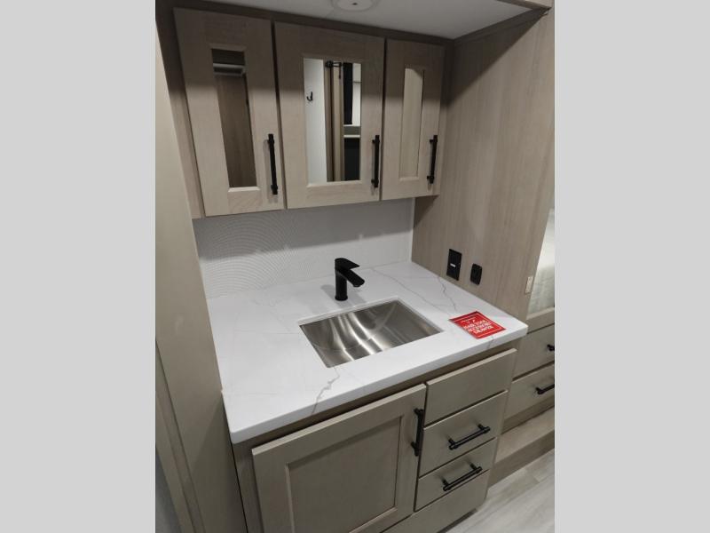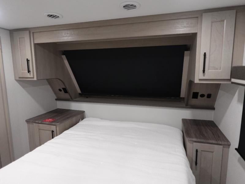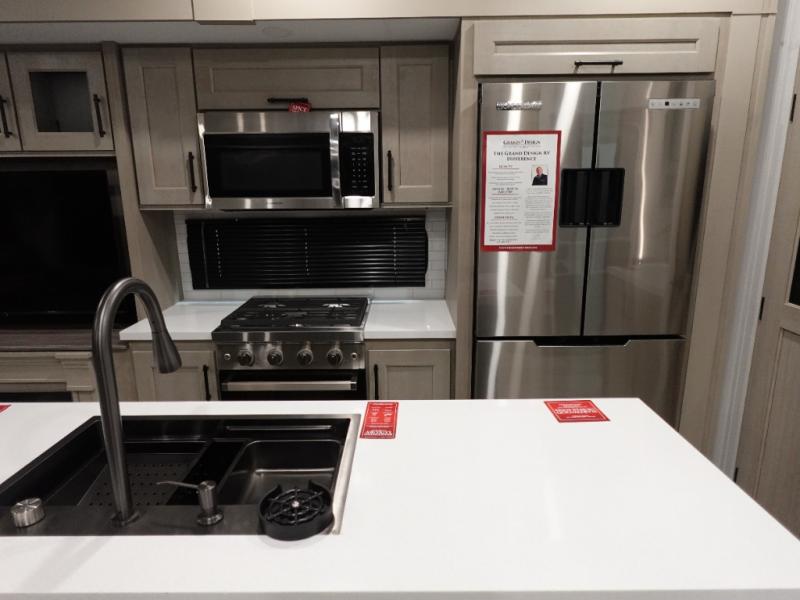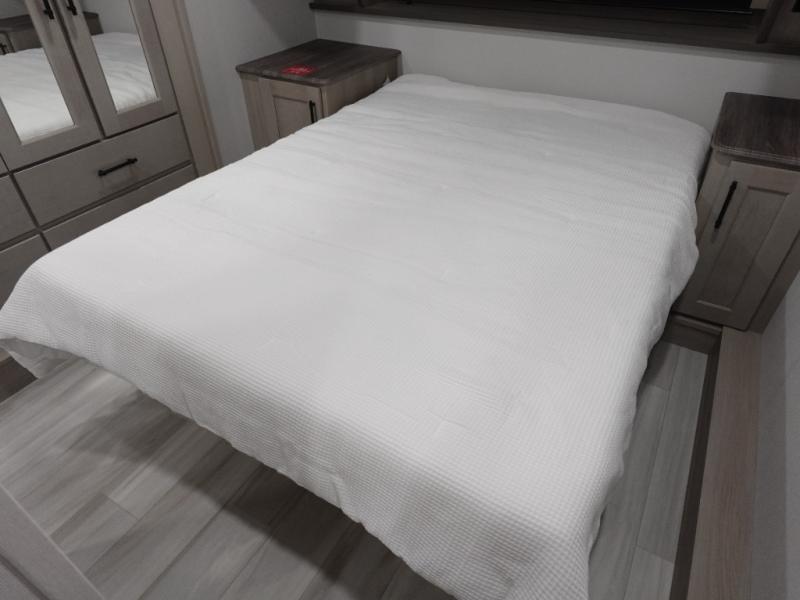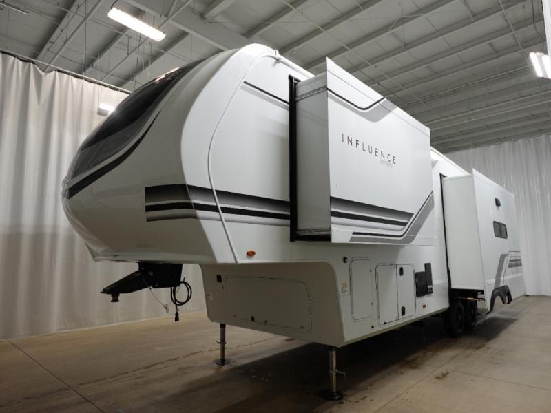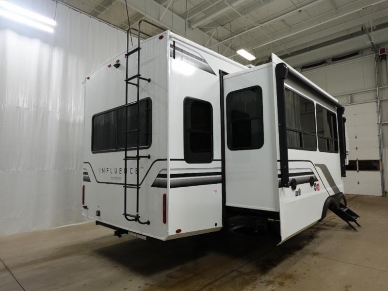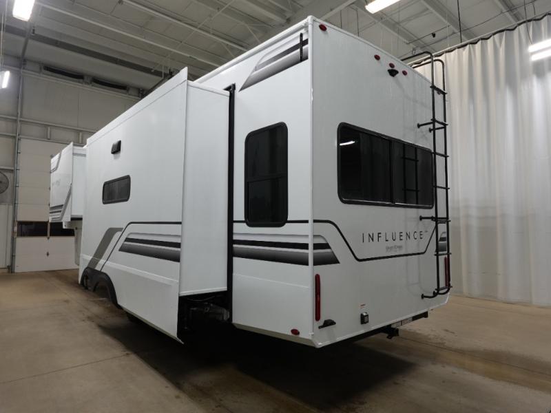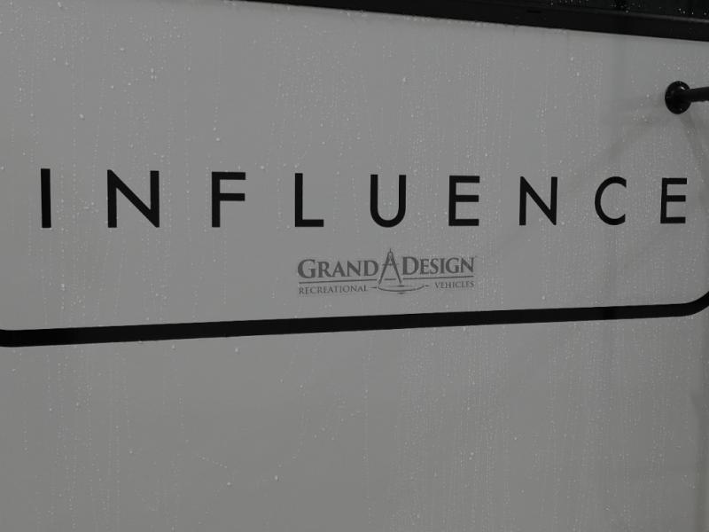 Any Grand Design Influence fifth wheel features five-sided aluminum cage construction with a walk-on roof and a fully enclosed underbelly with heated tanks and storage for all weather camping. For peace of mind, the MORryde CRE3000 Suspension system will provide safe and smooth towing, and the 101" widebody construction offers all the room you need and that is before multiple slides are fully engaged. You will appreciate the Keyed-Alike locks, slam-latch baggage doors with magnetic door catches, exterior security light, and SolidStep entry steps. On the inside, Congoleum flooring, premium roller shades for privacy, a hallway handrail for safety, and nightstands with USB ports to keep all of your electronics fully charged. You will also love the on demand tankless water heater when showering, plus the added heat and ambiance from an electric fireplace, and so much more!