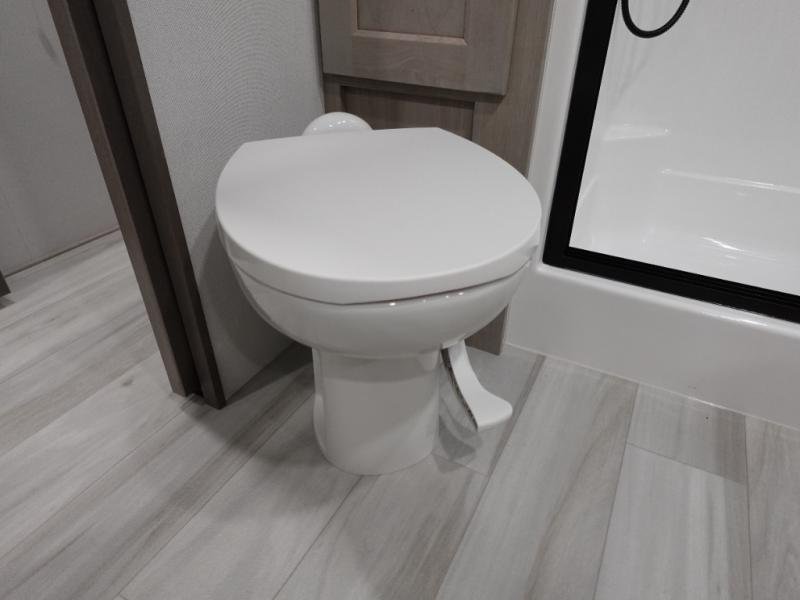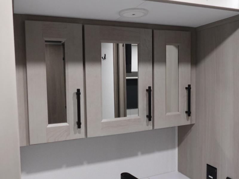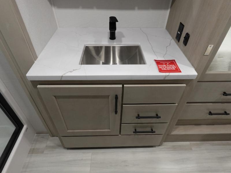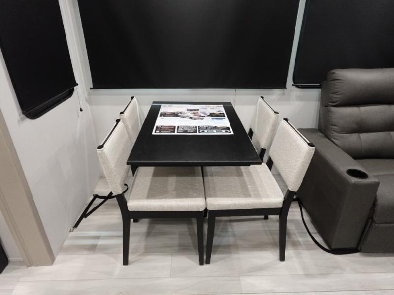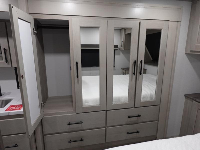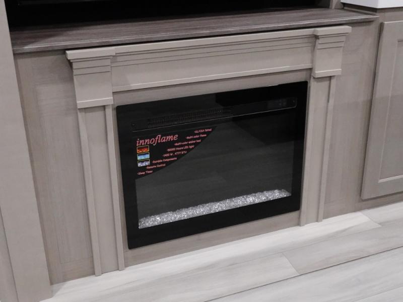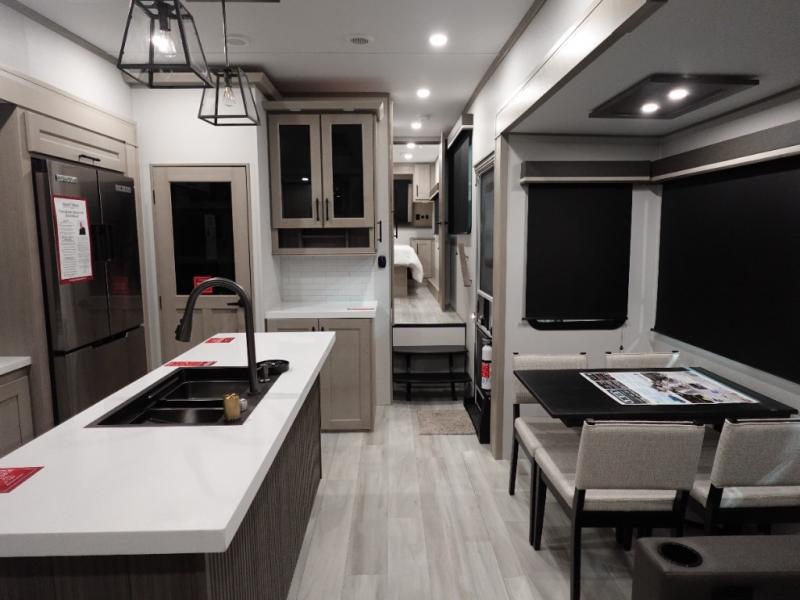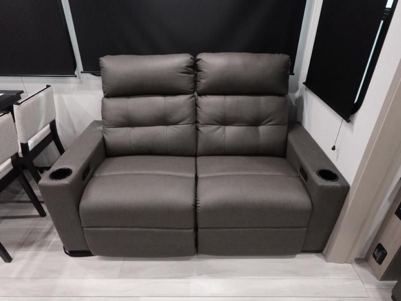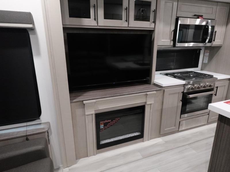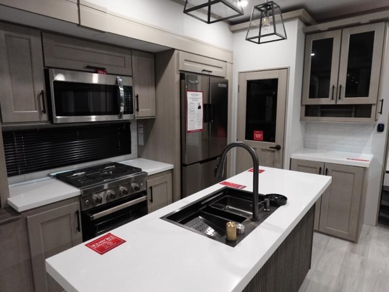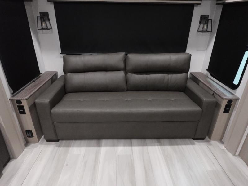 You'll feel right at home in this spacious fifth wheel with triple slides, a front master bedroom, and a kitchen island with extra counter space. The theatre seating is right across from the entertainment center which includes a 40" TV and fireplace, and there is a rear tri-fold sofa if you have any guests staying over. This model includes a hutch in the kitchen with cabinets above to store you nice dishes, plus there is a large pantry with washer and dryer prep if you plan to go full-time. Head to the dual entry bath that includes a linen closet and a spacious shower, and check out the front master bedroom with its queen bed, and slide out wardrobe.