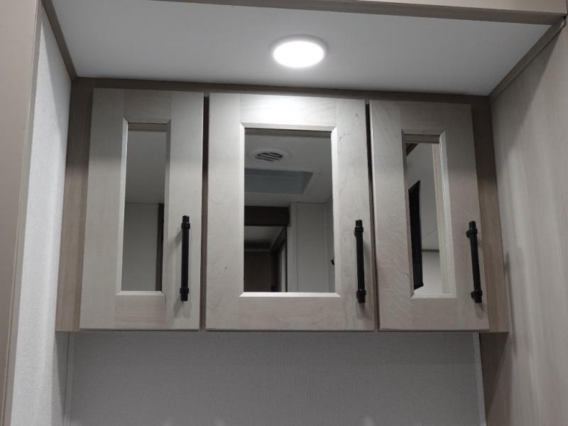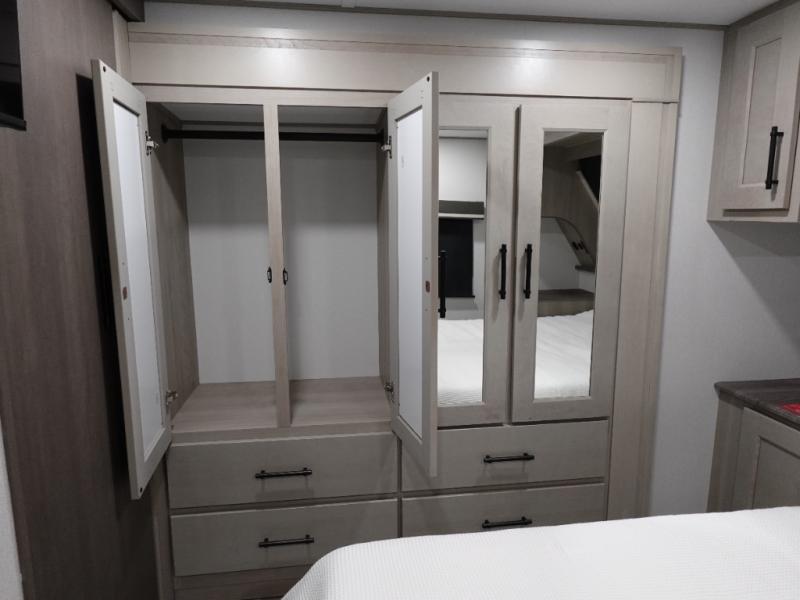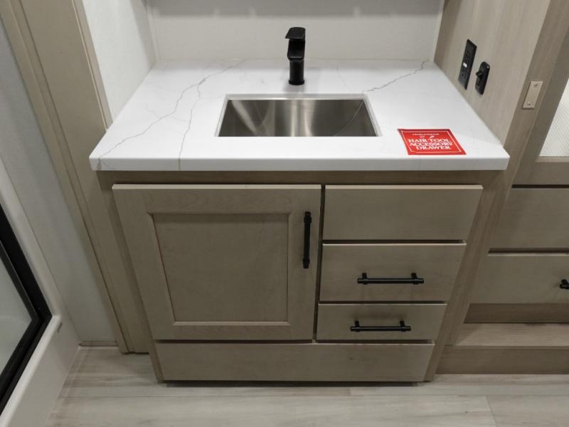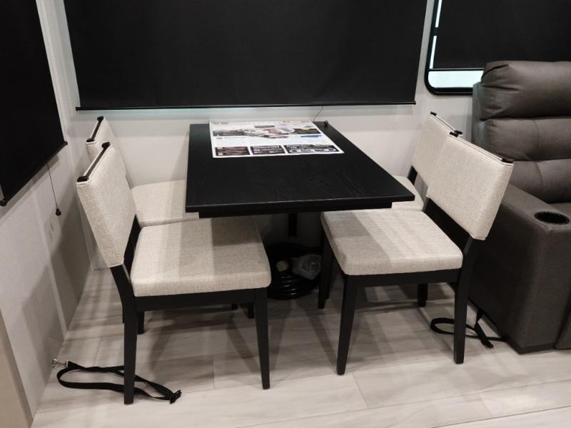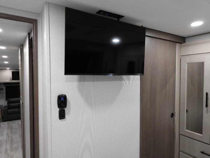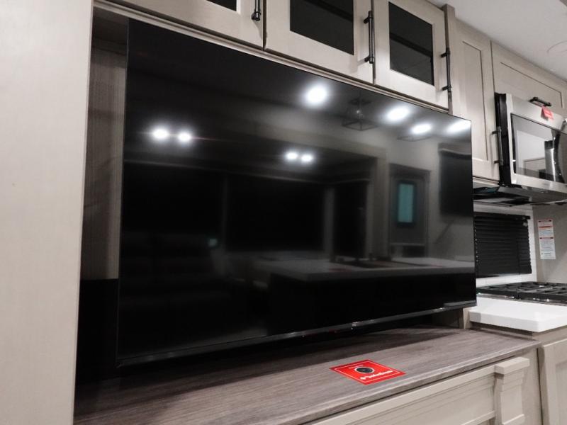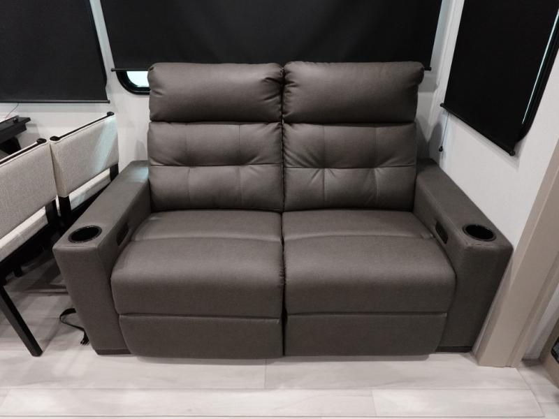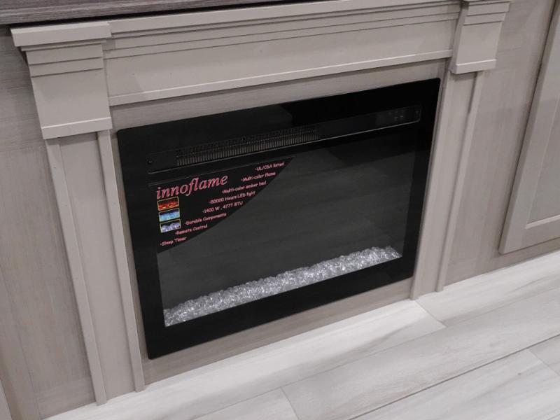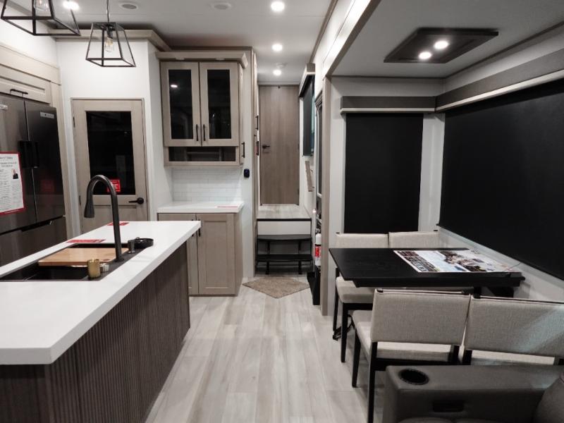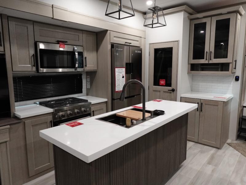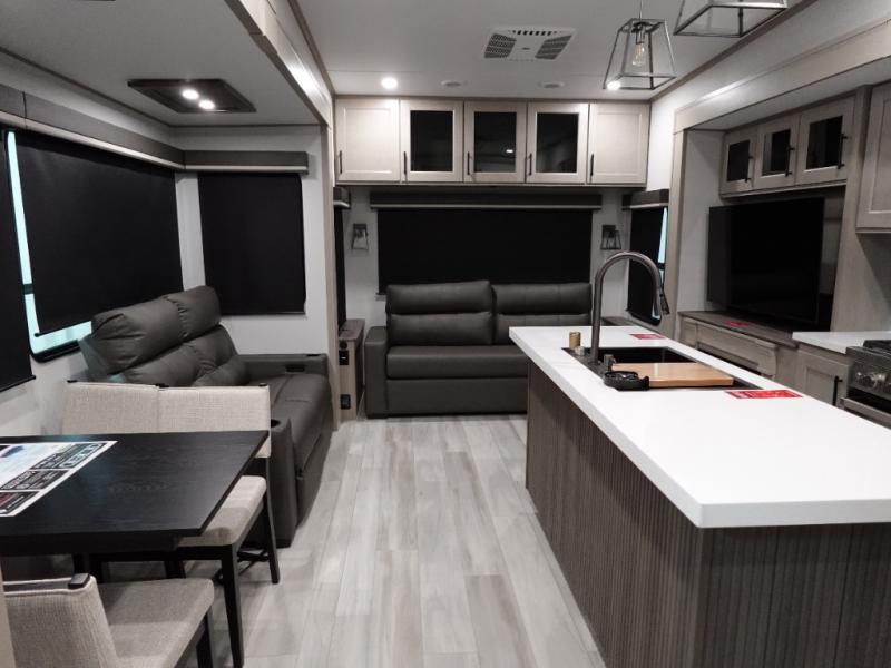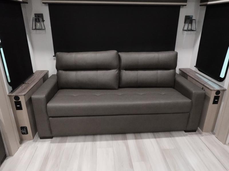 You'll feel right at home in this spacious fifth wheel with triple slides, a front master bedroom, and a kitchen island with extra counter space. The theatre seating is right across from the entertainment center which includes a 40" TV and fireplace, and there is a rear tri-fold sofa if you have any guests staying over. This model includes a hutch in the kitchen with cabinets above to store you nice dishes, plus there is a large pantry with washer and dryer prep if you plan to go full-time. Head to the dual entry bath that includes a linen closet and a spacious shower, and check out the front master bedroom with its queen bed, and slide out wardrobe.