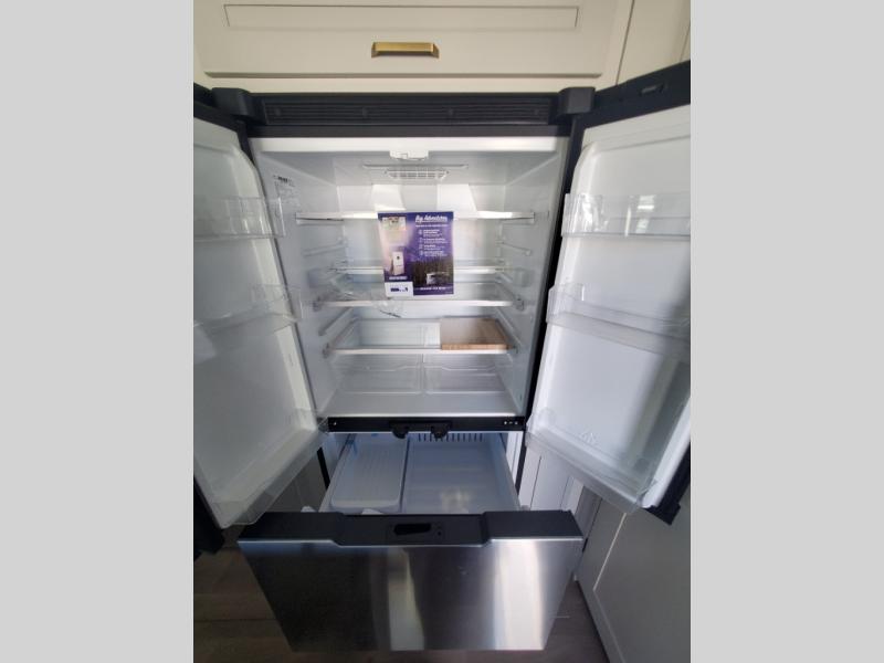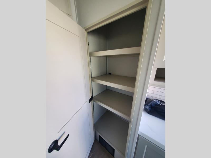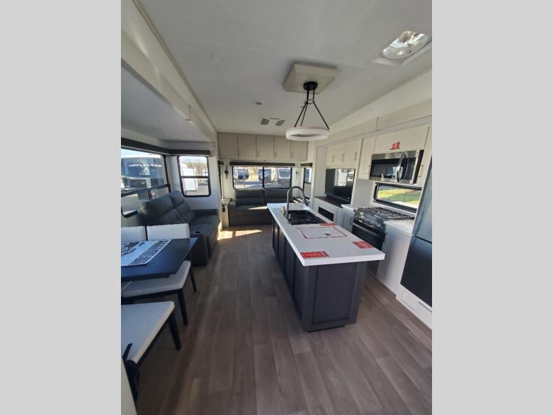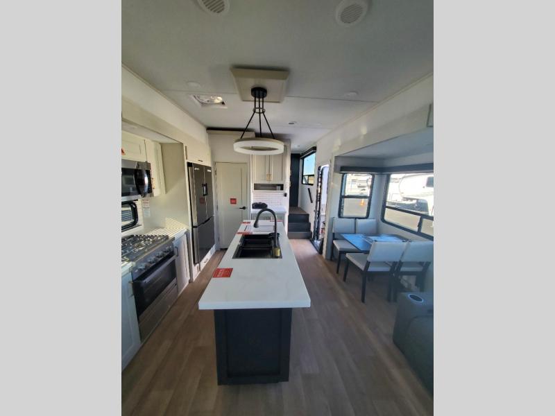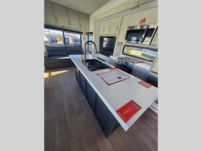 You'll feel right at home in this spacious fifth wheel with triple slides, a front master bedroom, and a kitchen island with extra counter space. The theatre seating is right across from the entertainment center which includes a 40" TV and fireplace, and there is a rear tri-fold sofa if you have any guests staying over. This model includes a hutch in the kitchen with cabinets above to store you nice dishes, plus there is a large pantry with washer and dryer prep if you plan to go full-time. Head to the dual entry bath that includes a linen closet and a spacious shower, and check out the front master bedroom with its queen bed, and slide out wardrobe. You can choose the optional king bed if you enjoy a bit more room in bed!