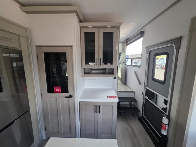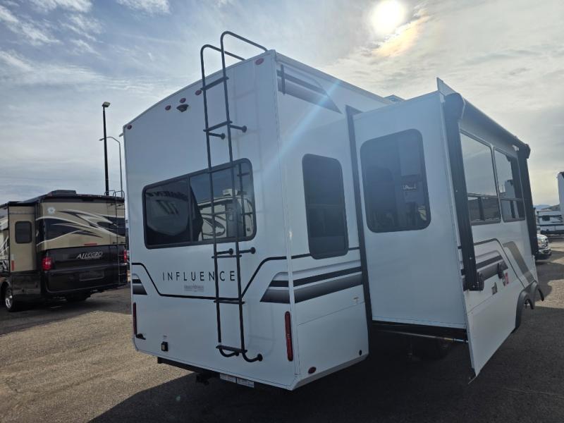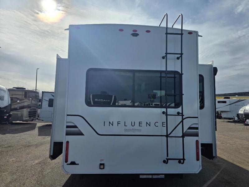 Any Grand Design Influence fifth wheel features five-sided aluminum cage construction with a walk-on roof and a fully enclosed underbelly with heated tanks and storage for all weather camping. For peace of mind, the MORryde CRE3000 Suspension system will provide safe and smooth towing, and the 101" widebody construction offers all the room you need and that is before multiple slides are fully engaged. You will appreciate the Keyed-Alike locks, slam-latch baggage doors with magnetic door catches, exterior security light, and SolidStep entry steps. On the inside, Congoleum flooring, premium roller shades for privacy, a hallway handrail for safety, and nightstands with USB ports to keep all of your electronics fully charged. You will also love the on demand tankless water heater when showering, plus the added heat and ambiance from an electric fireplace, and so much more!