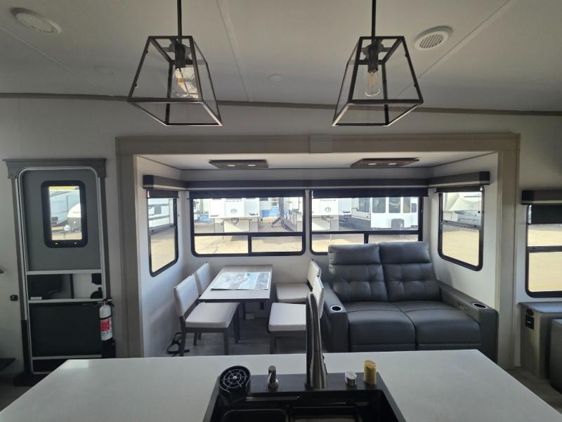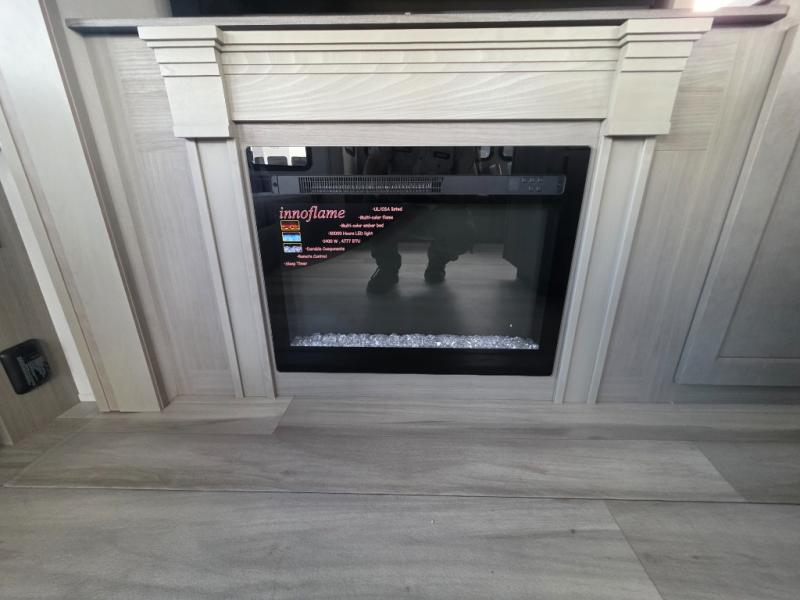 You'll feel right at home in this spacious fifth wheel with triple slides, a front master bedroom, and a kitchen island with extra counter space. The theatre seating is right across from the entertainment center which includes a 40" TV and fireplace, and there is a rear tri-fold sofa if you have any guests staying over. This model includes a hutch in the kitchen with cabinets above to store you nice dishes, plus there is a large pantry with washer and dryer prep if you plan to go full-time. Head to the dual entry bath that includes a linen closet and a spacious shower, and check out the front master bedroom with its queen bed, and slide out wardrobe. You can choose the optional king bed if you enjoy a bit more room in bed!