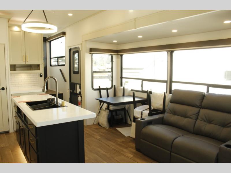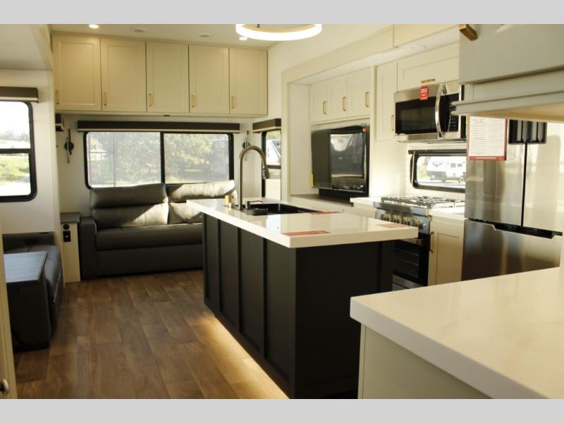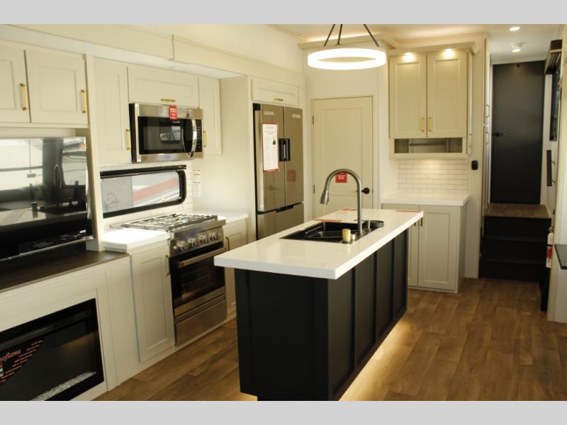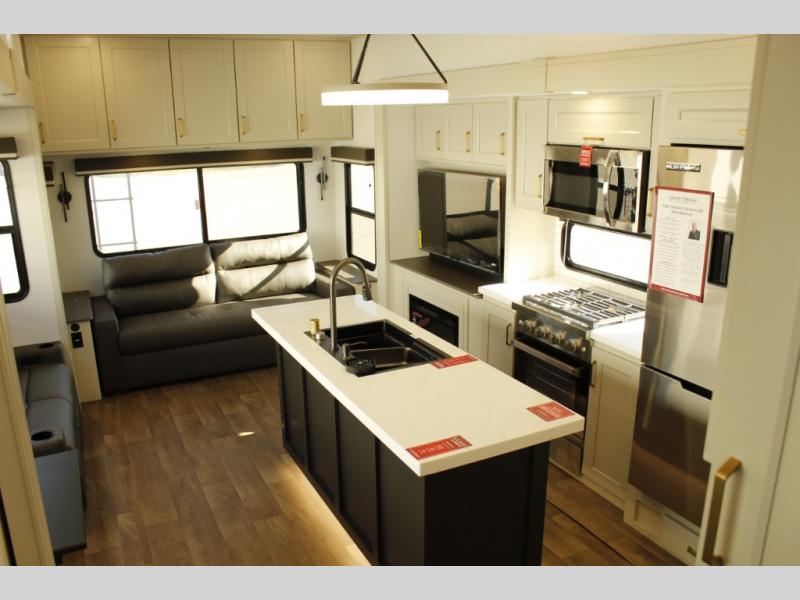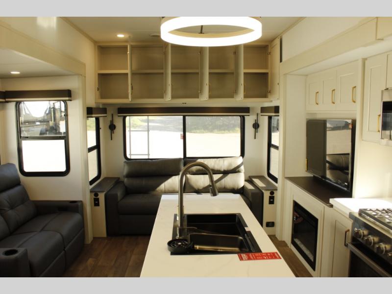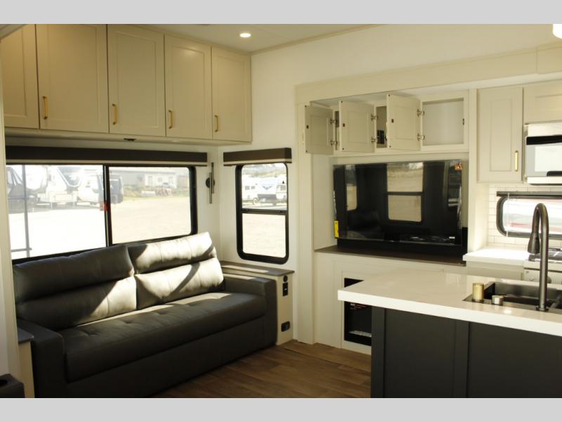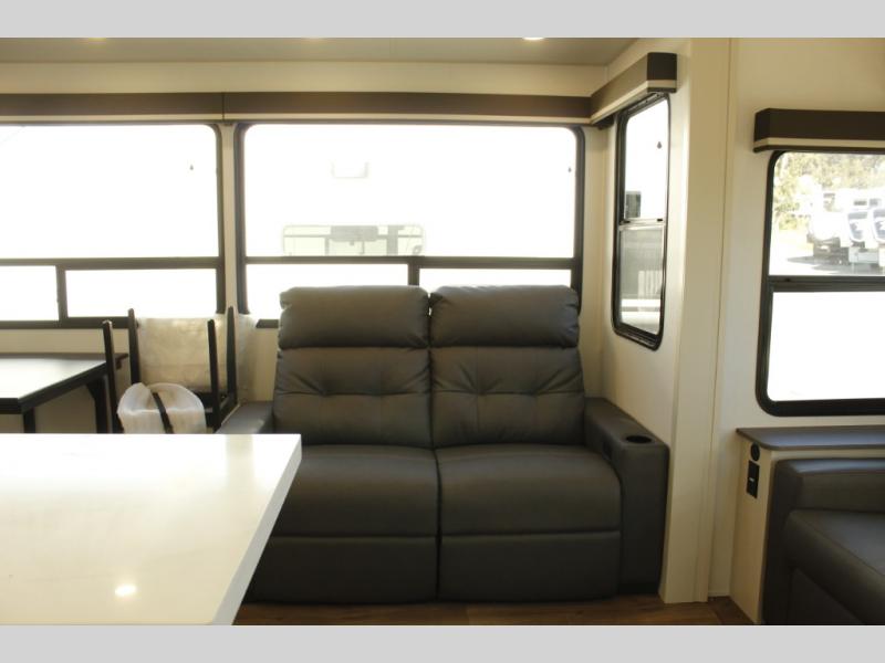 You'll feel right at home in this spacious fifth wheel with triple slides, a front master bedroom, and a kitchen island with extra counter space. The theatre seating is right across from the entertainment center which includes a 40" TV and fireplace, and there is a rear tri-fold sofa if you have any guests staying over. This model includes a hutch in the kitchen with cabinets above to store you nice dishes, plus there is a large pantry with washer and dryer prep if you plan to go full-time. Head to the dual entry bath that includes a linen closet and a spacious shower, and check out the front master bedroom with its queen bed, and slide out wardrobe. You can choose the optional king bed if you enjoy a bit more room in bed!