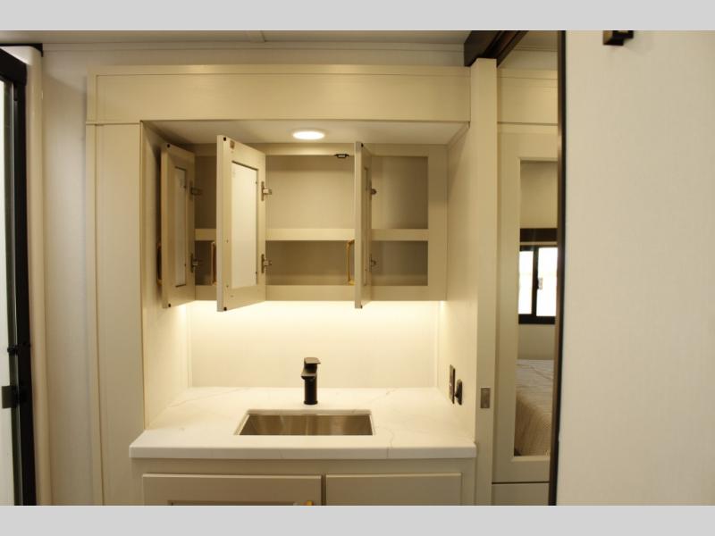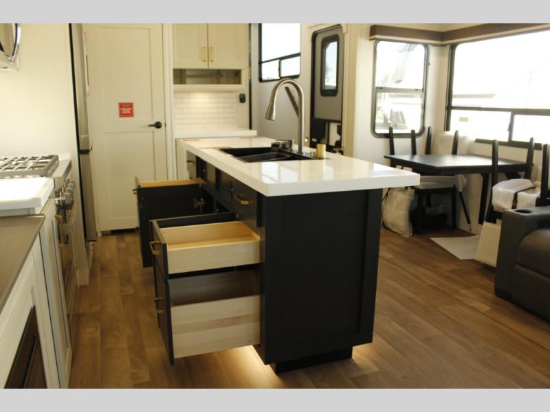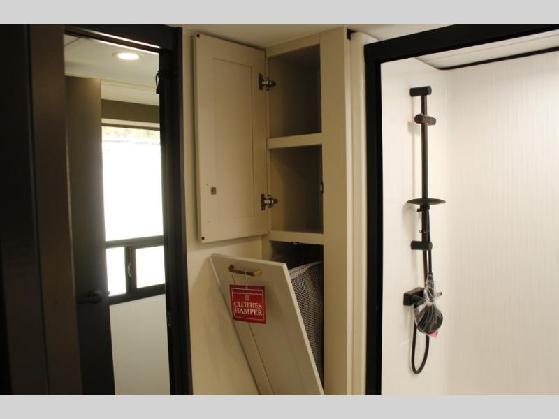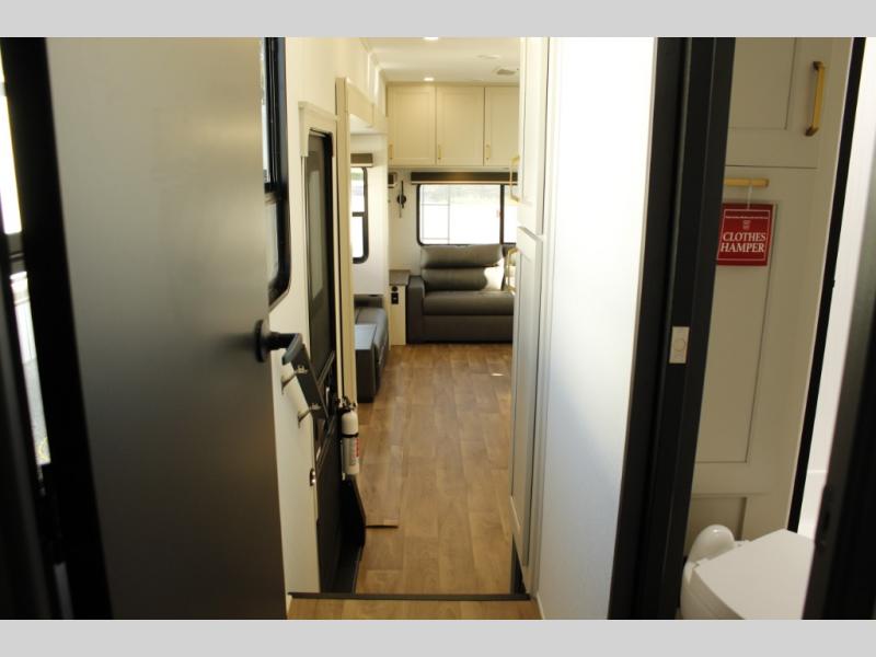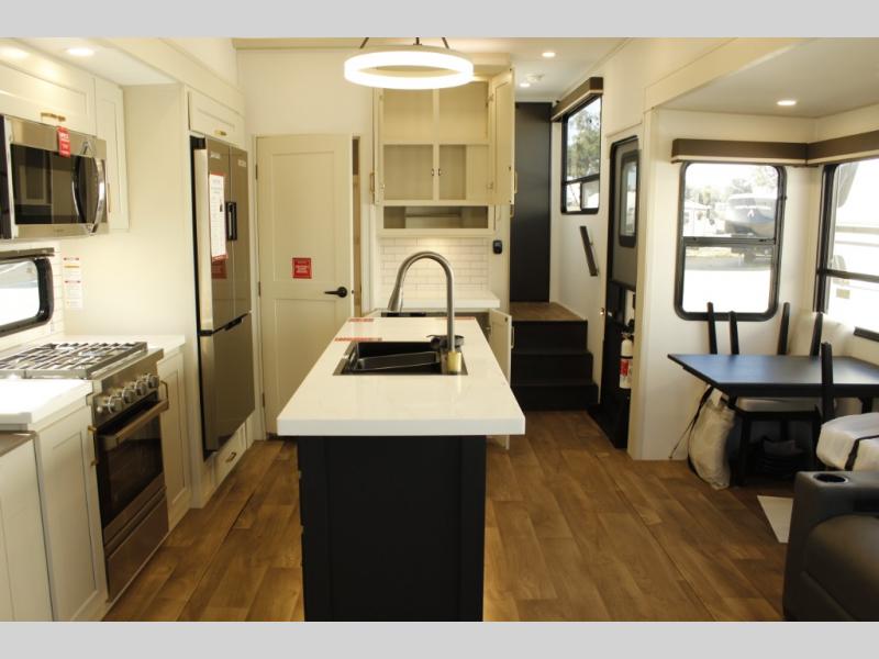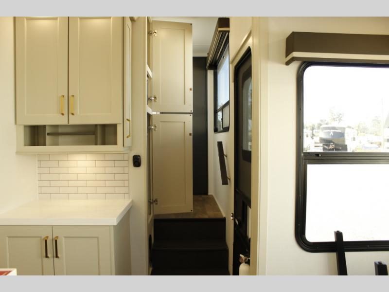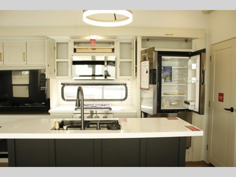 You'll feel right at home in this spacious fifth wheel with triple slides, a front master bedroom, and a kitchen island with extra counter space. The theatre seating is right across from the entertainment center which includes a 40" TV and fireplace, and there is a rear tri-fold sofa if you have any guests staying over. This model includes a hutch in the kitchen with cabinets above to store you nice dishes, plus there is a large pantry with washer and dryer prep if you plan to go full-time. Head to the dual entry bath that includes a linen closet and a spacious shower, and check out the front master bedroom with its queen bed, and slide out wardrobe. You can choose the optional king bed if you enjoy a bit more room in bed!