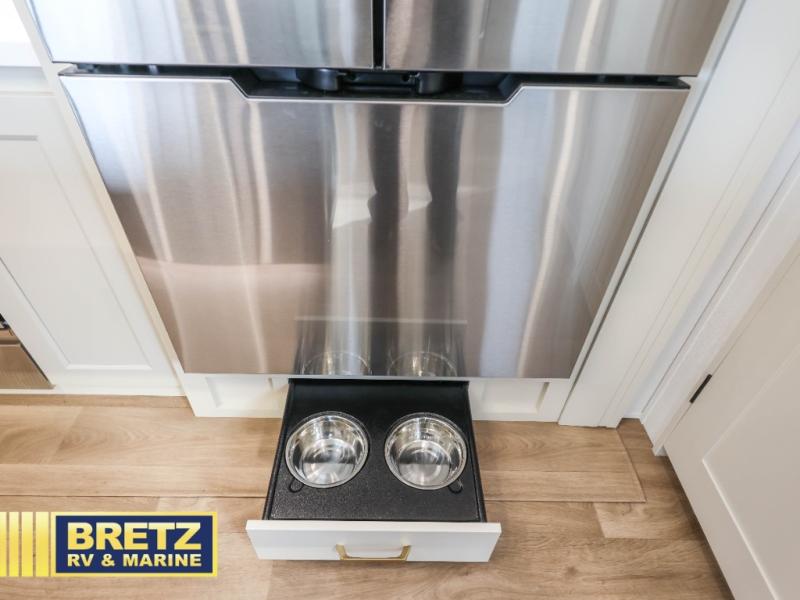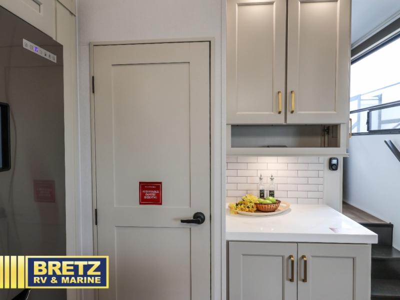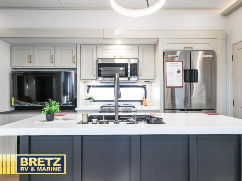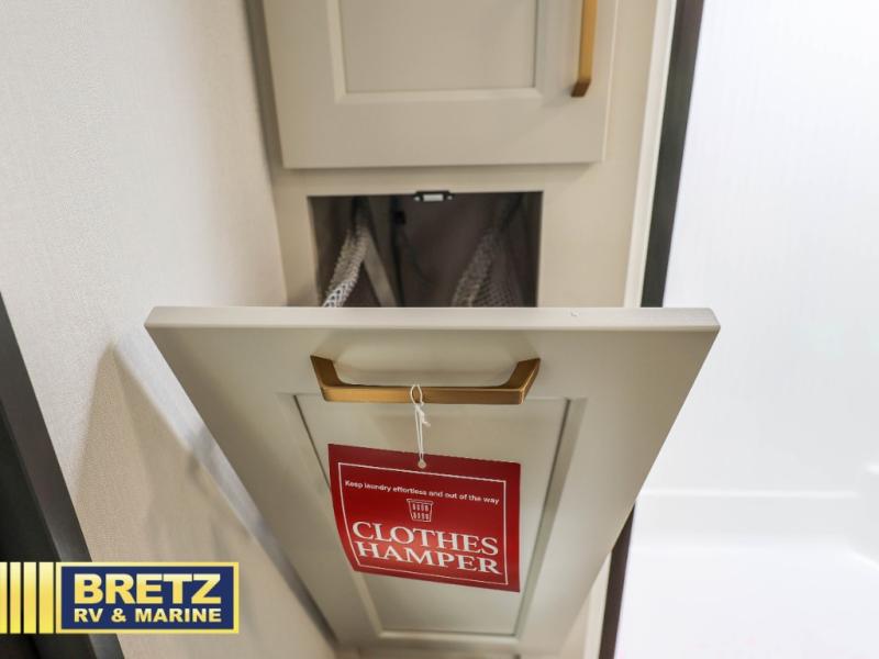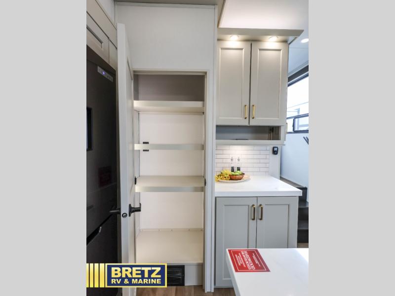 You'll feel right at home in this spacious fifth wheel with triple slides, a front master bedroom, and a kitchen island with extra counter space. The theatre seating is right across from the entertainment center which includes a 40" TV and fireplace, and there is a rear tri-fold sofa if you have any guests staying over. This model includes a hutch in the kitchen with cabinets above to store you nice dishes, plus there is a large pantry with washer and dryer prep if you plan to go full-time. Head to the dual entry bath that includes a linen closet and a spacious shower, and check out the front master bedroom with its queen bed, and slide out wardrobe. You can choose the optional king bed if you enjoy a bit more room in bed!