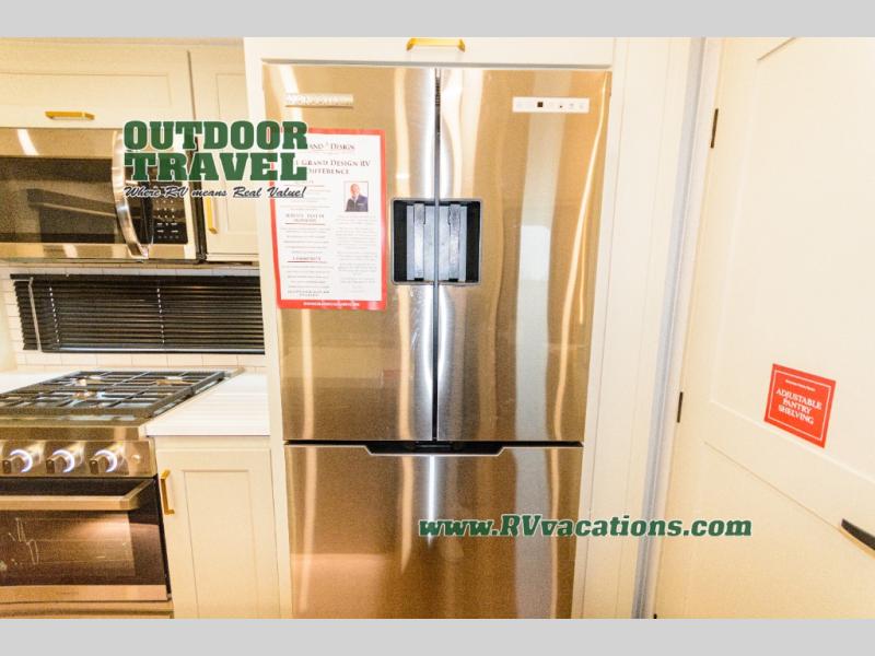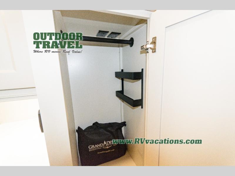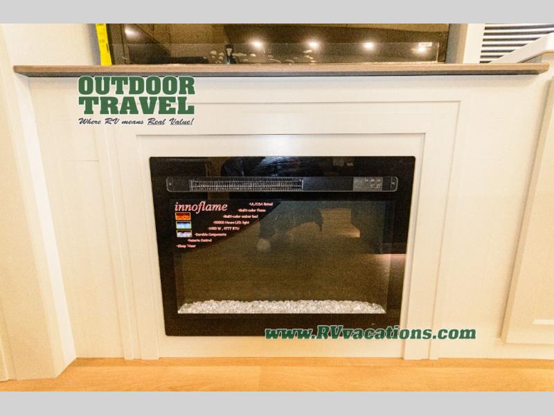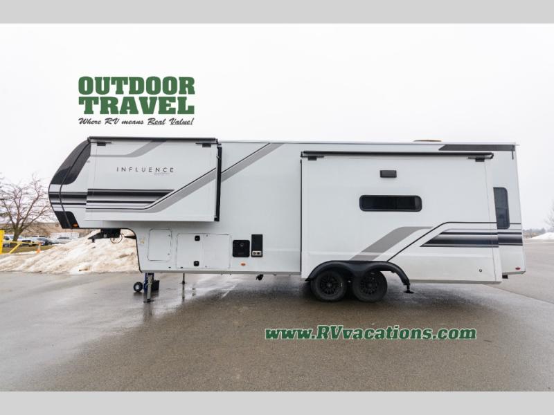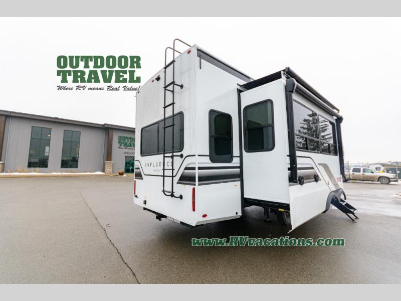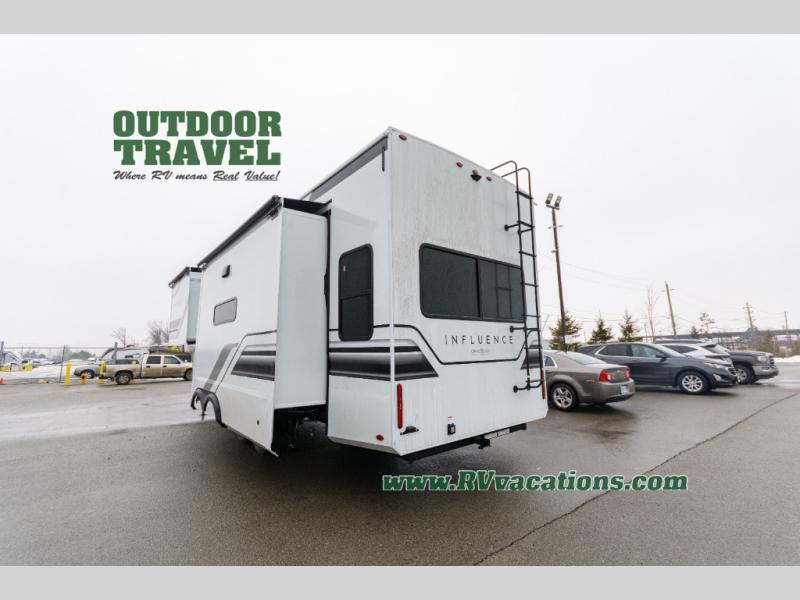 Any Grand Design Influence fifth wheel features five-sided aluminum cage construction with a walk-on roof and a fully enclosed underbelly with heated tanks and storage for all weather camping. For peace of mind, the MORryde CRE3000 Suspension system will provide safe and smooth towing, and the 101" widebody construction offers all the room you need and that is before multiple slides are fully engaged. You will appreciate the Keyed-Alike locks, slam-latch baggage doors with magnetic door catches, exterior security light, and SolidStep entry steps. On the inside, Congoleum flooring, premium roller shades for privacy, a hallway handrail for safety, and nightstands with USB ports to keep all of your electronics fully charged. You will also love the on demand tankless water heater when showering, plus the added heat and ambiance from an electric fireplace, and so much more!