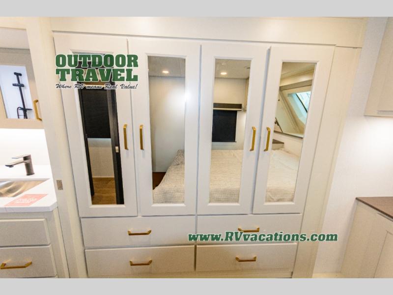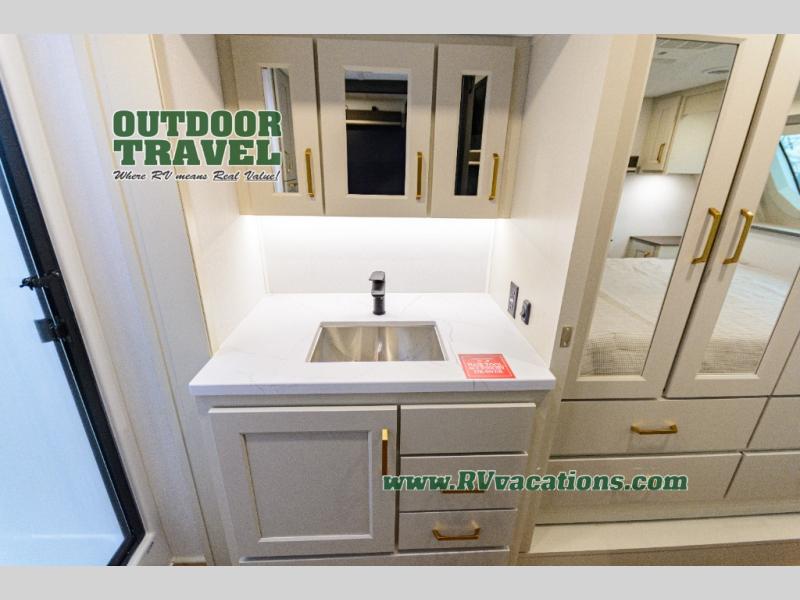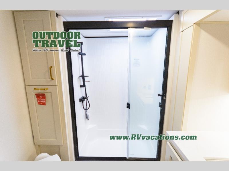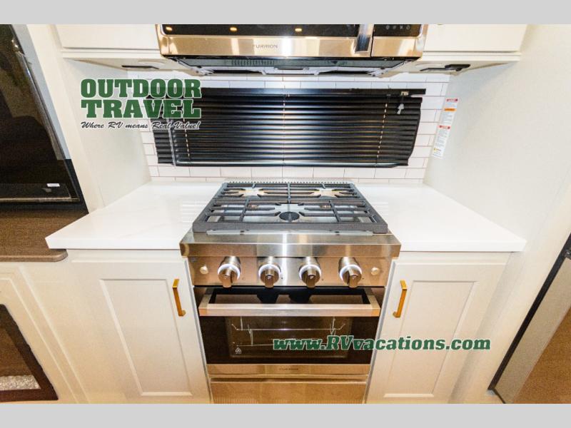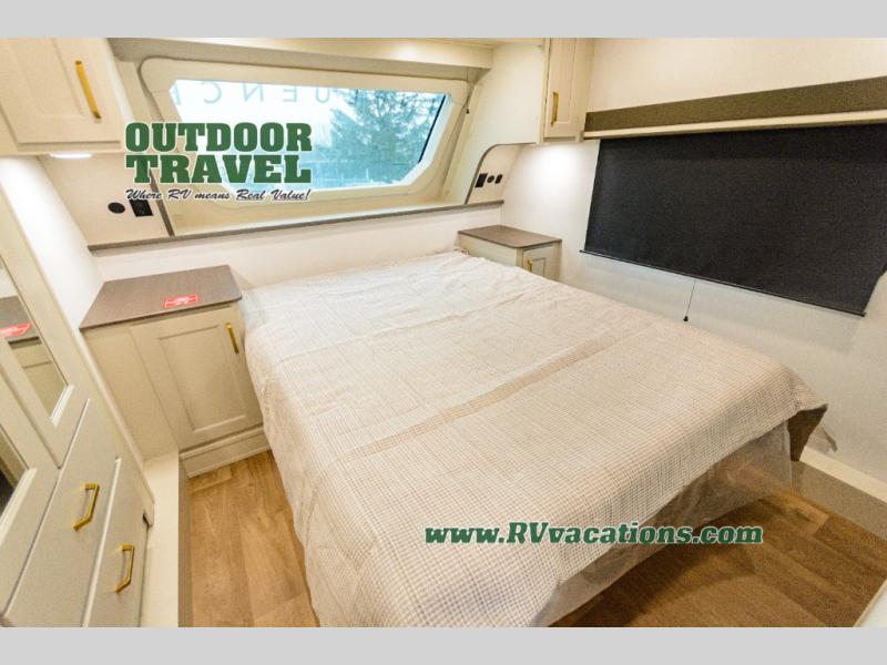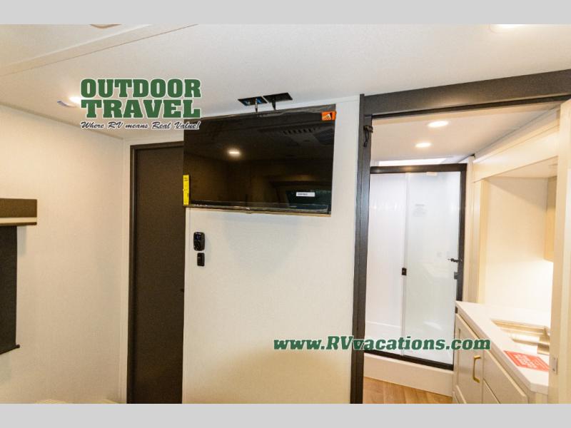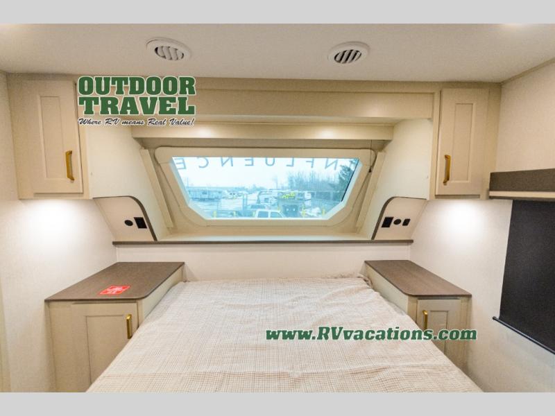 Any Grand Design Influence fifth wheel features five-sided aluminum cage construction with a walk-on roof and a fully enclosed underbelly with heated tanks and storage for all weather camping. For peace of mind, the MORryde CRE3000 Suspension system will provide safe and smooth towing, and the 101" widebody construction offers all the room you need and that is before multiple slides are fully engaged. You will appreciate the Keyed-Alike locks, slam-latch baggage doors with magnetic door catches, exterior security light, and SolidStep entry steps. On the inside, Congoleum flooring, premium roller shades for privacy, a hallway handrail for safety, and nightstands with USB ports to keep all of your electronics fully charged. You will also love the on demand tankless water heater when showering, plus the added heat and ambiance from an electric fireplace, and so much more!