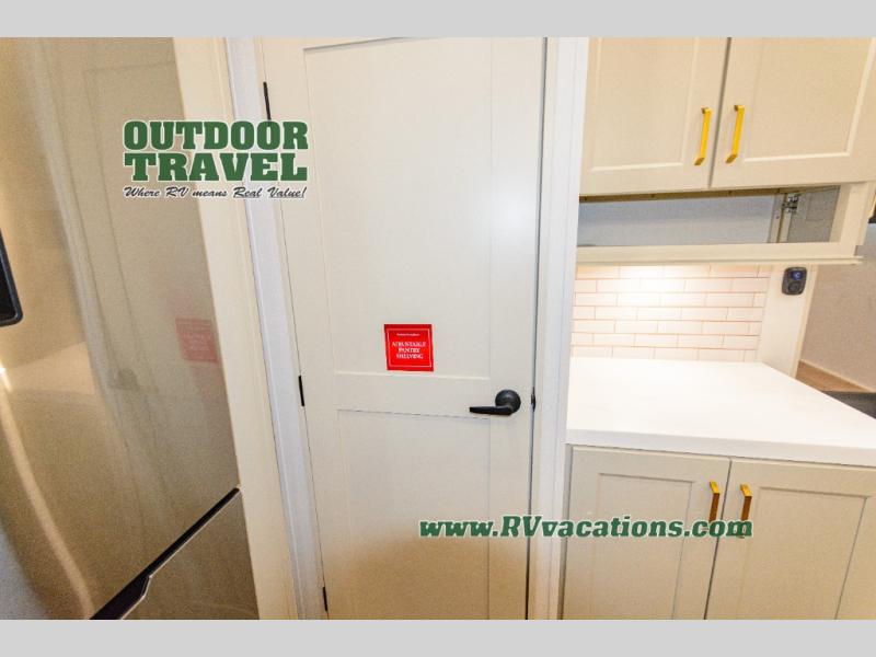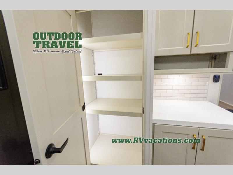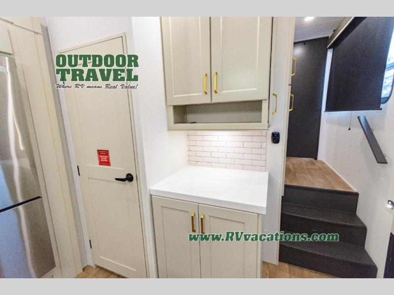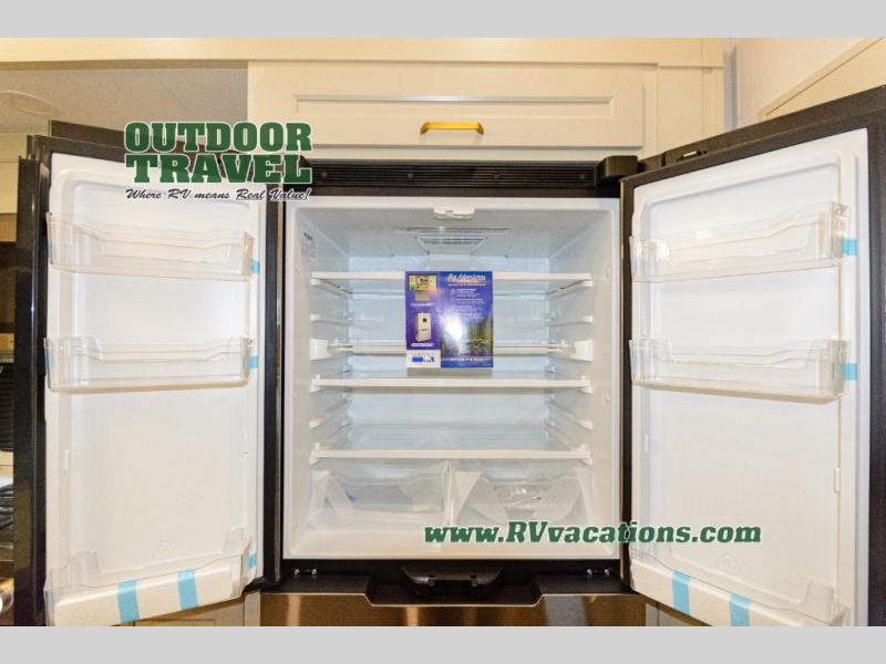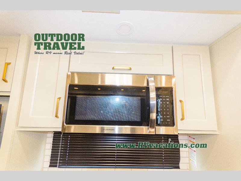 You'll feel right at home in this spacious fifth wheel with triple slides, a front master bedroom, and a kitchen island with extra counter space. The theatre seating is right across from the entertainment center which includes a 40" TV and fireplace, and there is a rear tri-fold sofa if you have any guests staying over. This model includes a hutch in the kitchen with cabinets above to store you nice dishes, plus there is a large pantry with washer and dryer prep if you plan to go full-time. Head to the dual entry bath that includes a linen closet and a spacious shower, and check out the front master bedroom with its queen bed, and slide out wardrobe. You can choose the optional king bed if you enjoy a bit more room in bed!