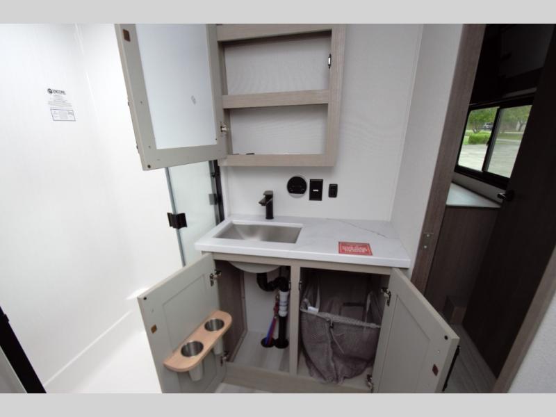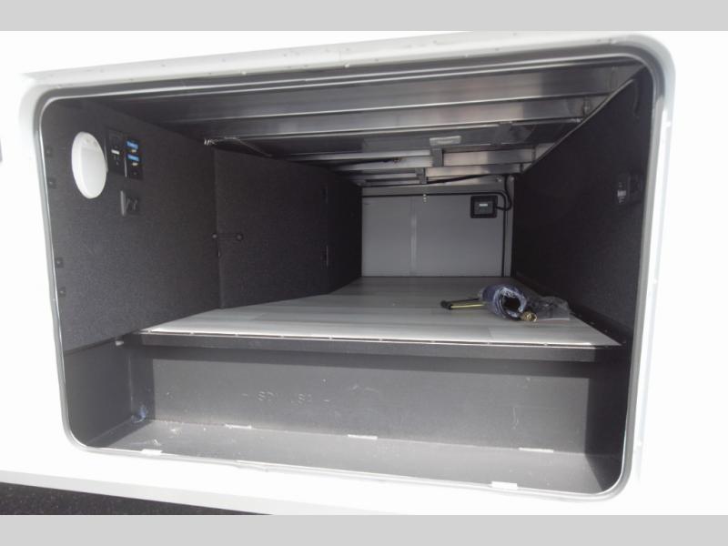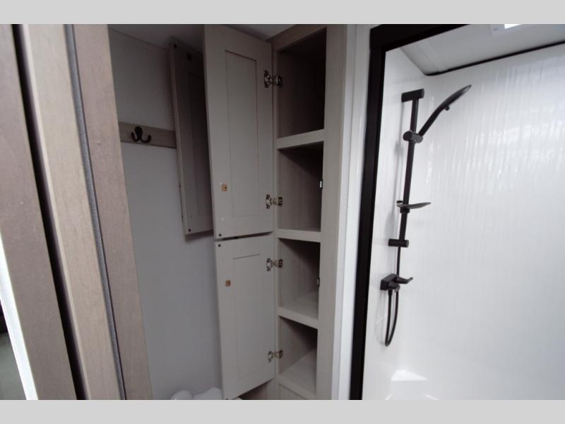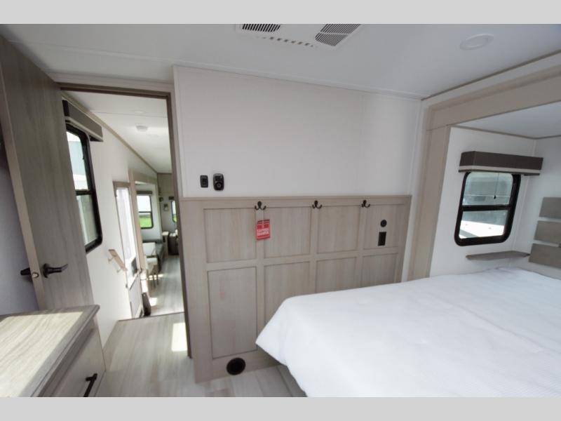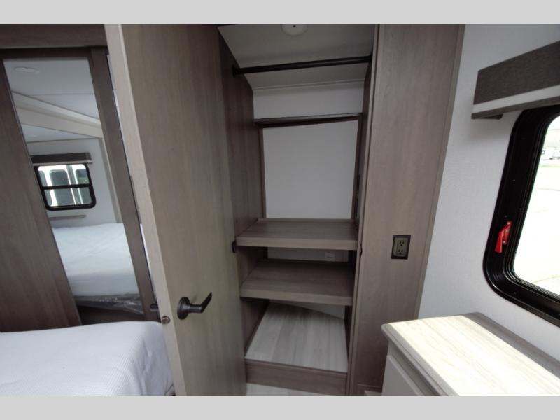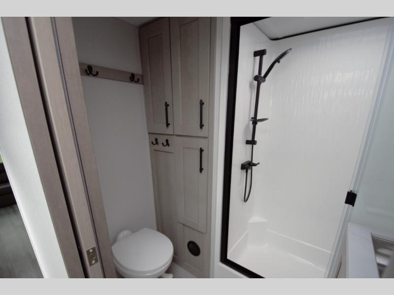 The private front bedroom offers a queen bed slide, dresser, and a large wardrobe with washer and dryer prep. A pass through clothes hamper connects the bedroom to the bathroom for added convenience.