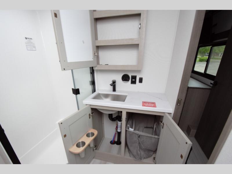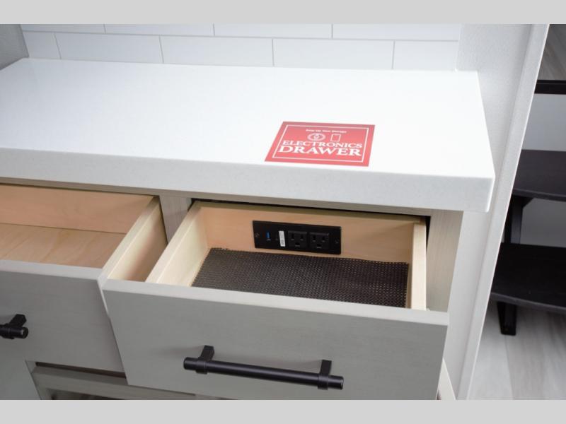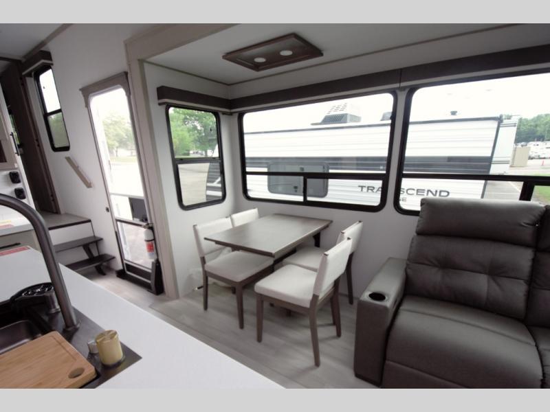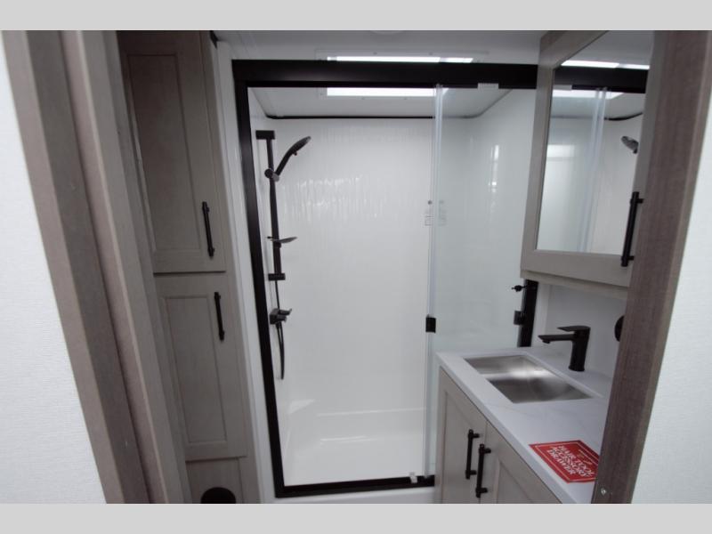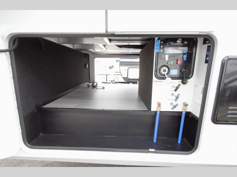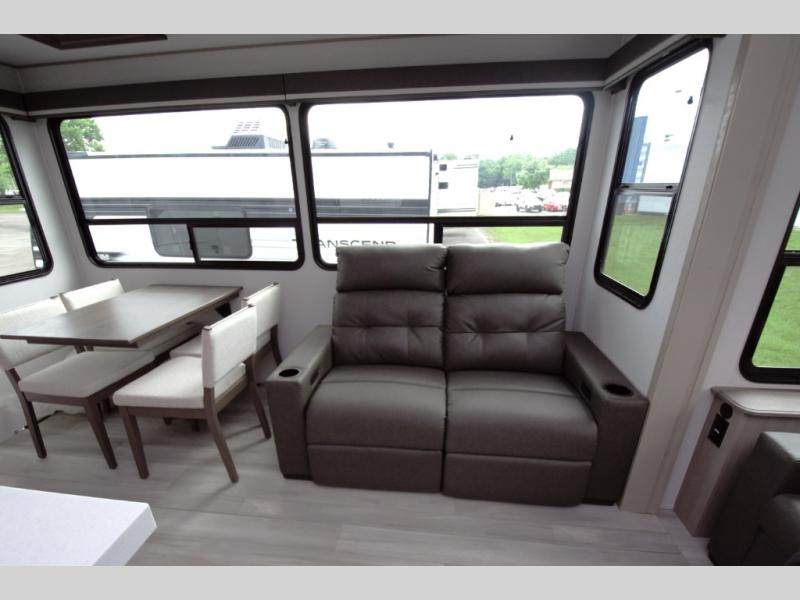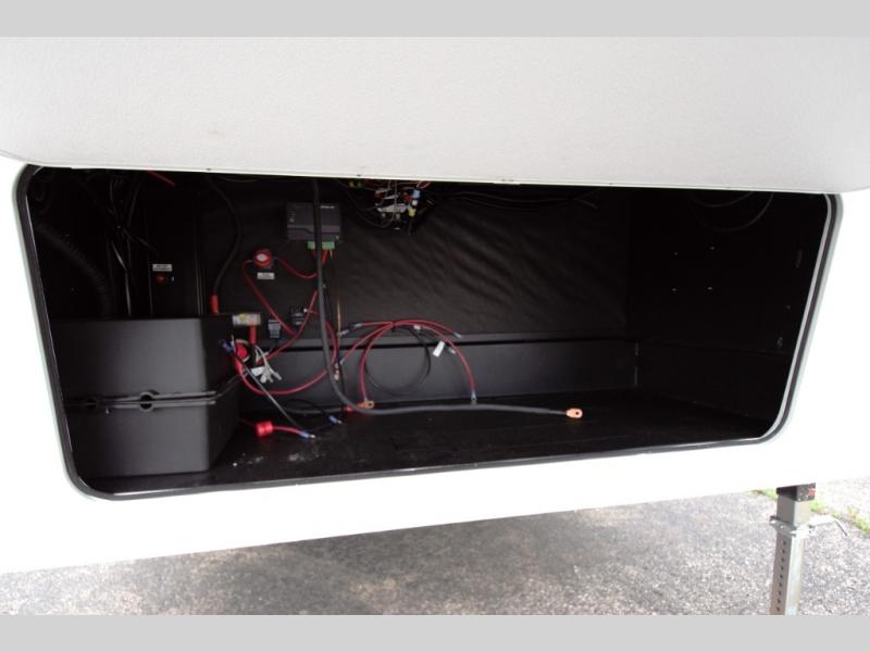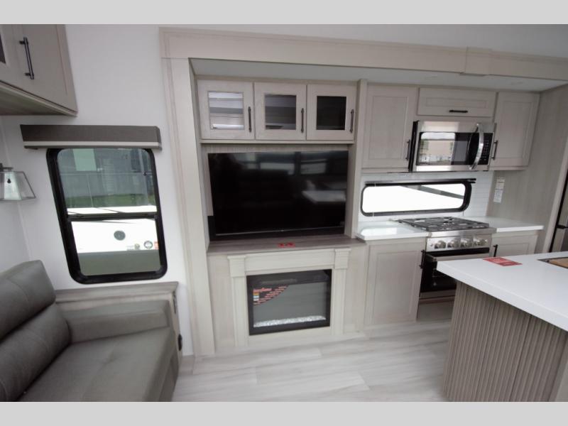 The main living space includes dual opposing slides for an open concept feel. Relax in theater seating or on the tri fold sofa, enjoy meals at the free standing dinette, and stay cozy with the electric fireplace and entertainment center.