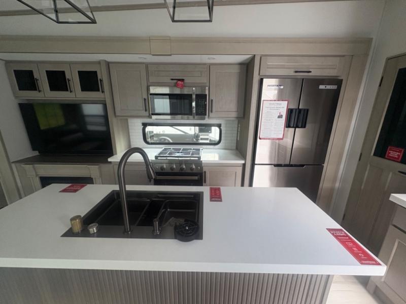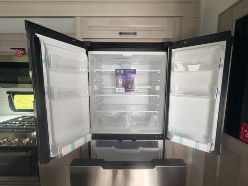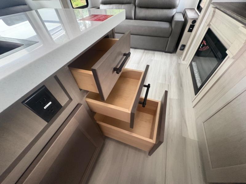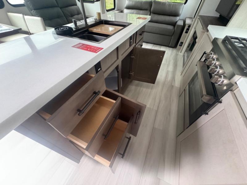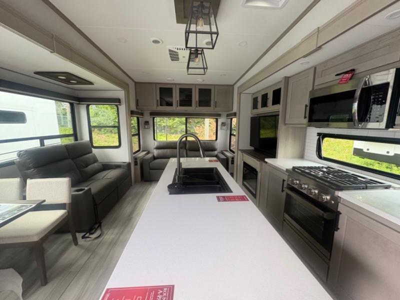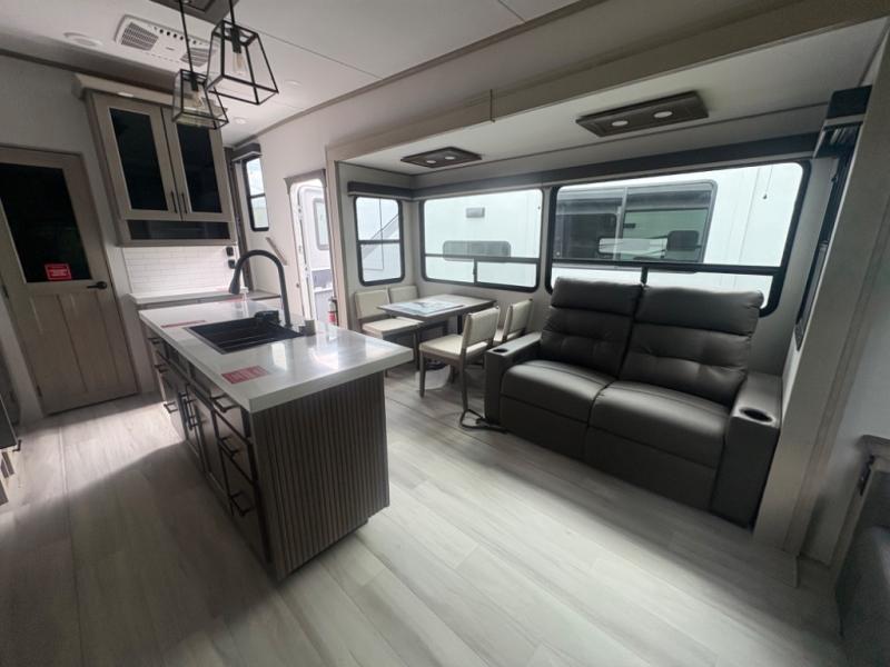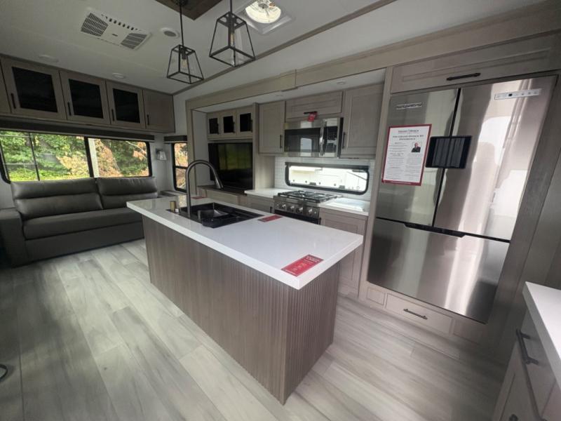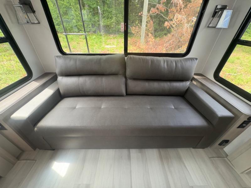 A perfect fifth wheel featuring triple slides and a tri-fold sofa for overnight guests! You will love the spacious interior thanks to the dual opposing slides in the main living and kitchen area. Here you will find a kitchen island in the center and plenty of seating with a free standing dinette, theater seating for movie night opposite the fireplace and entertainment center, as well as a tri-fold sofa. The kitchen offers all of the amenities just like home, a 16 cu. ft. 12-volt refrigerator for your perishables, and a hutch with an electronics drawer to keep your gadgets organized. There is even a pet dish under the refrigerator for your furry friends. The spacious full bath includes a 48" x 30" shower, dual linen closets, and an accessory drawer for necessities. You'll love the front bedroom with its queen bed slide out, slide top dresser, front wardrobe with washer and dryer prep, plus a pass-thru clothes hamper between the bedroom and bath; how convenient!