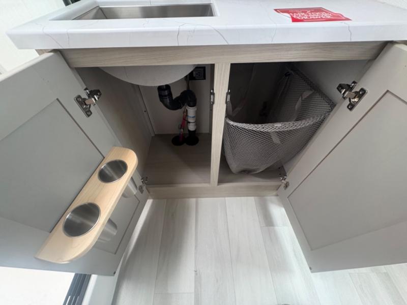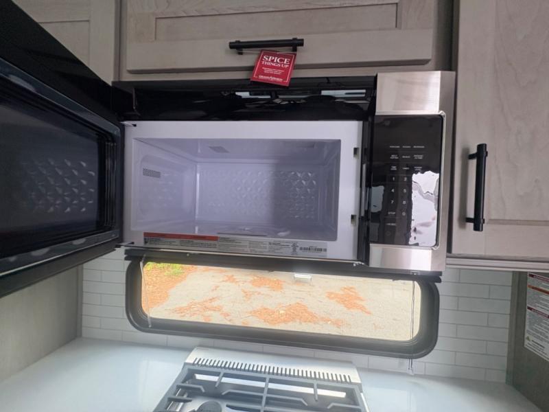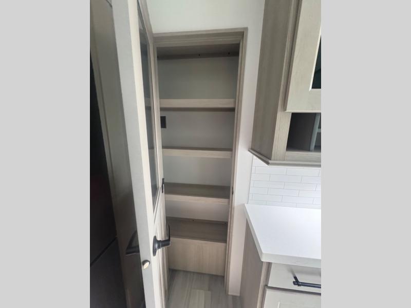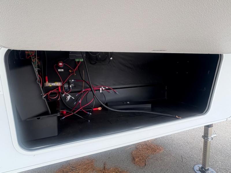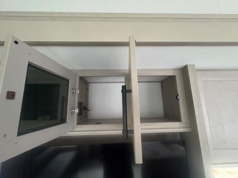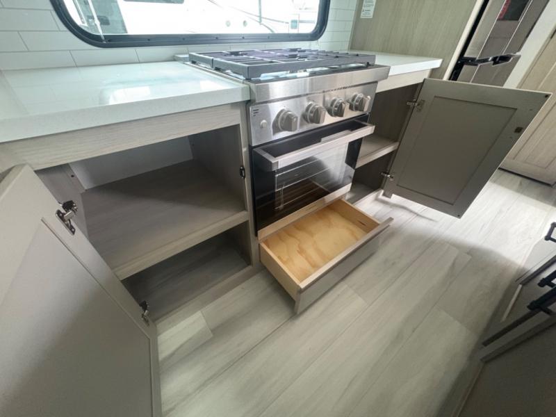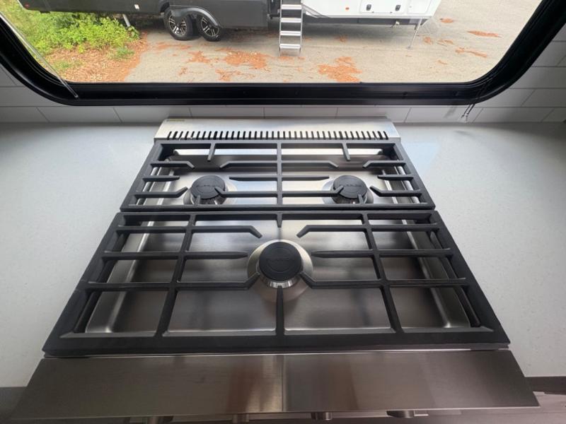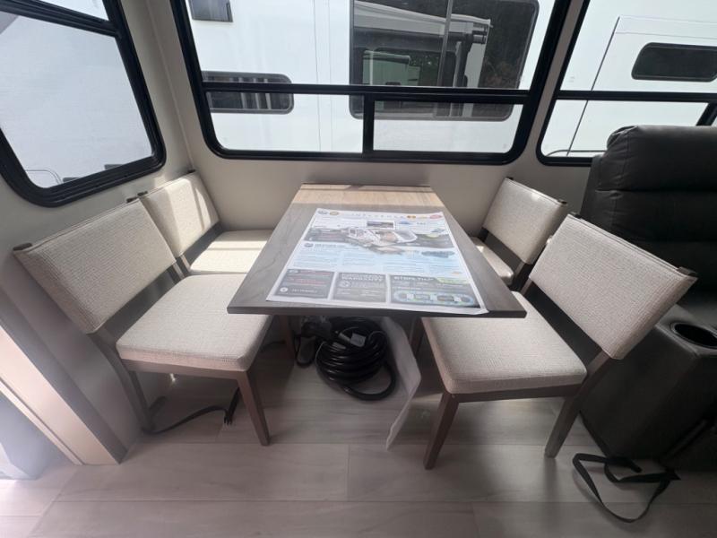 A perfect fifth wheel featuring triple slides and a tri-fold sofa for overnight guests! You will love the spacious interior thanks to the dual opposing slides in the main living and kitchen area. Here you will find a kitchen island in the center and plenty of seating with a free standing dinette, theater seating for movie night opposite the fireplace and entertainment center, as well as a tri-fold sofa. The kitchen offers all of the amenities just like home, a 16 cu. ft. 12-volt refrigerator for your perishables, and a hutch with an electronics drawer to keep your gadgets organized. There is even a pet dish under the refrigerator for your furry friends. The spacious full bath includes a 48" x 30" shower, dual linen closets, and an accessory drawer for necessities. You'll love the front bedroom with its queen bed slide out, slide top dresser, front wardrobe with washer and dryer prep, plus a pass-thru clothes hamper between the bedroom and bath; how convenient!