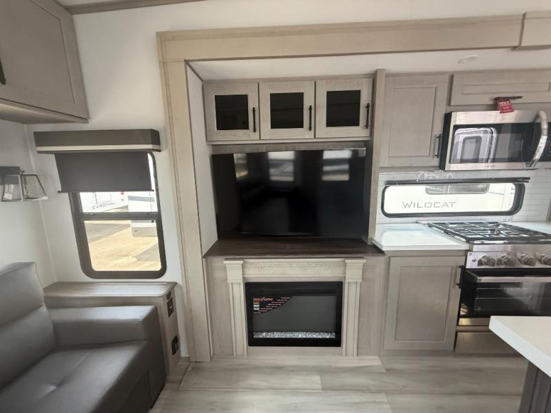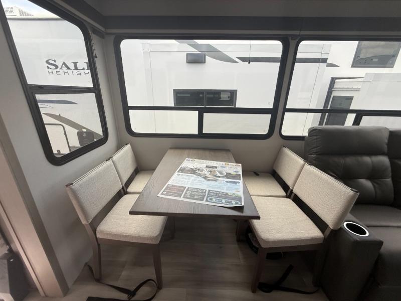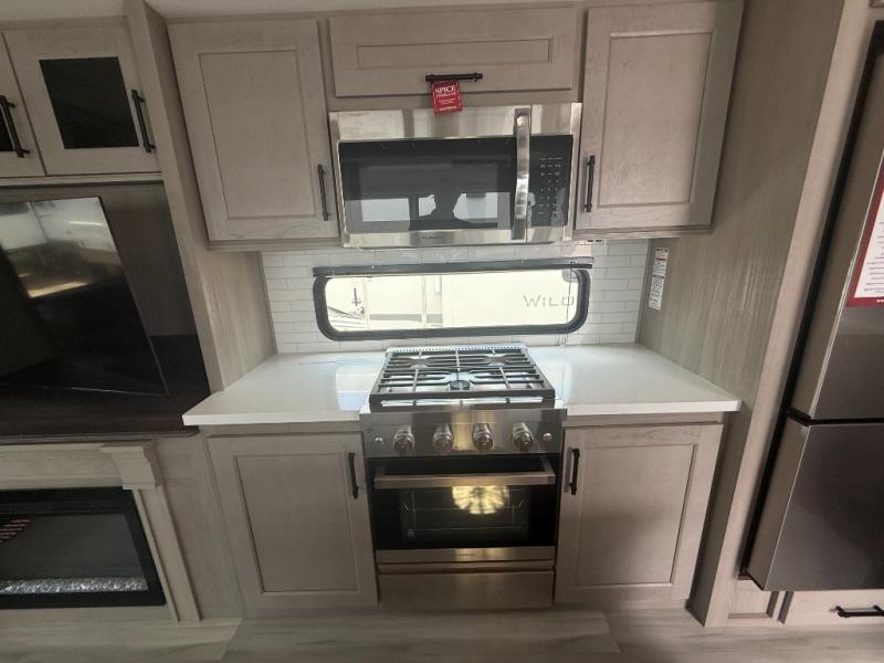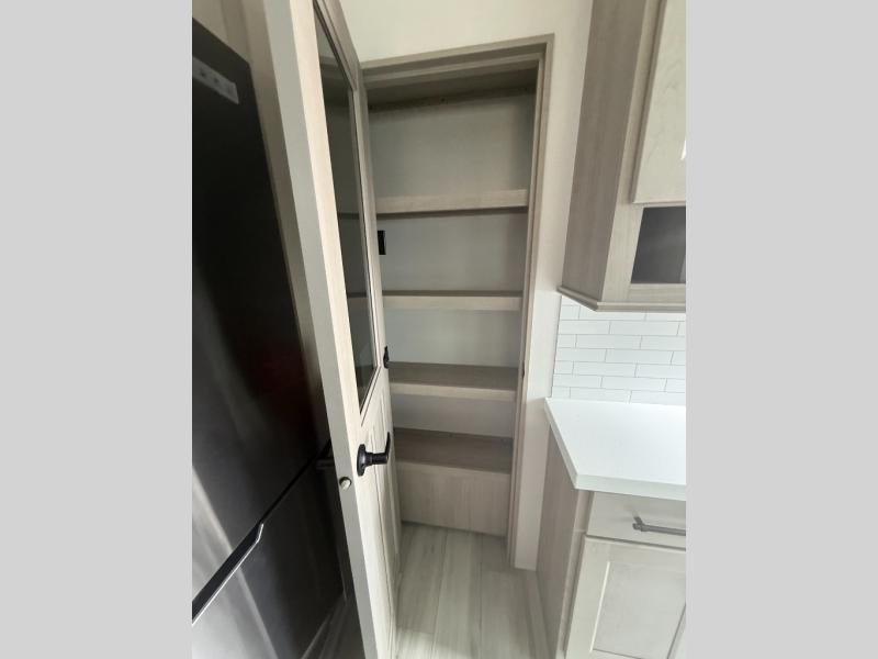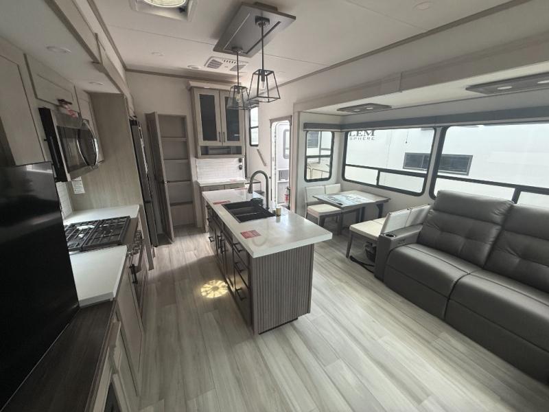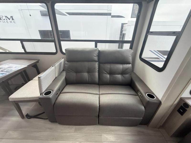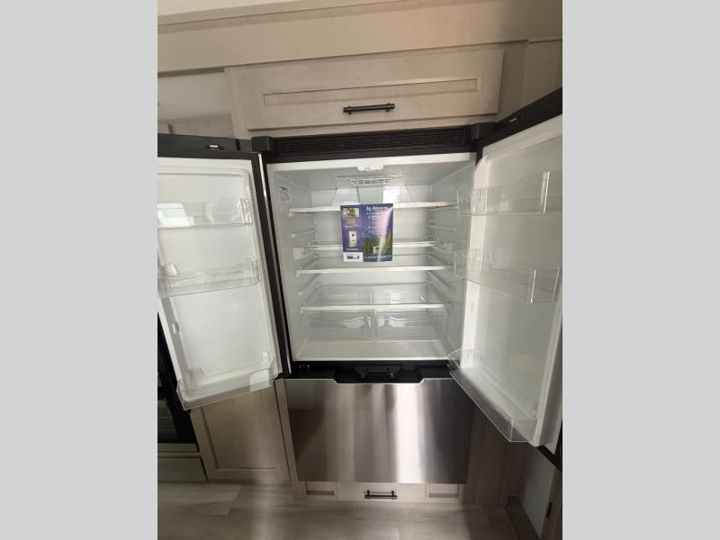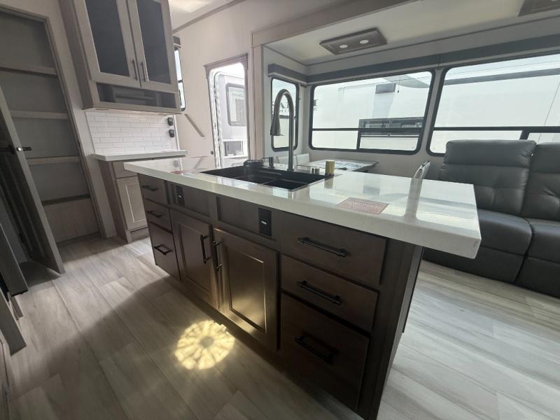 A perfect fifth wheel featuring triple slides and a tri-fold sofa for overnight guests! You will love the spacious interior thanks to the dual opposing slides in the main living and kitchen area. Here you will find a kitchen island in the center and plenty of seating with a free standing dinette, theater seating for movie night opposite the fireplace and entertainment center, as well as a tri-fold sofa. The kitchen offers all of the amenities just like home, a 16 cu. ft. 12-volt refrigerator for your perishables, and a hutch with an electronics drawer to keep your gadgets organized. There is even a pet dish under the refrigerator for your furry friends. The spacious full bath includes a 48" x 30" shower, dual linen closets, and an accessory drawer for necessities. You'll love the front bedroom with its queen bed slide out, slide top dresser, front wardrobe with washer and dryer prep, plus a pass-thru clothes hamper between the bedroom and bath; how convenient!
